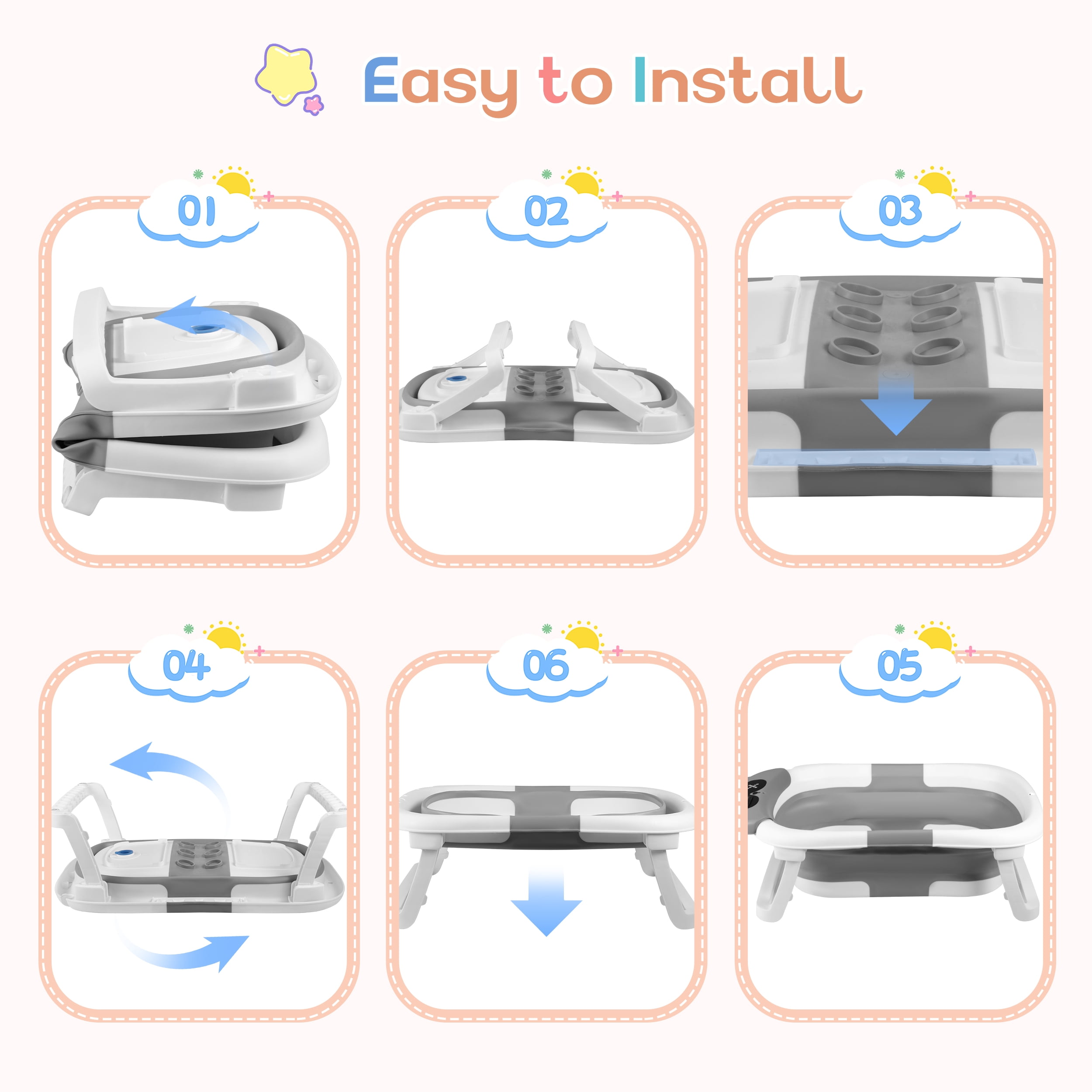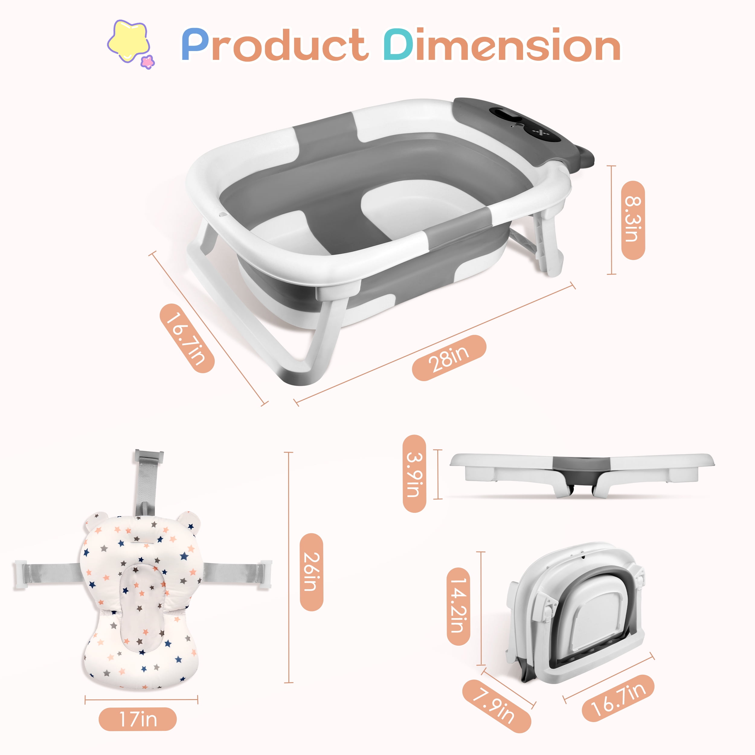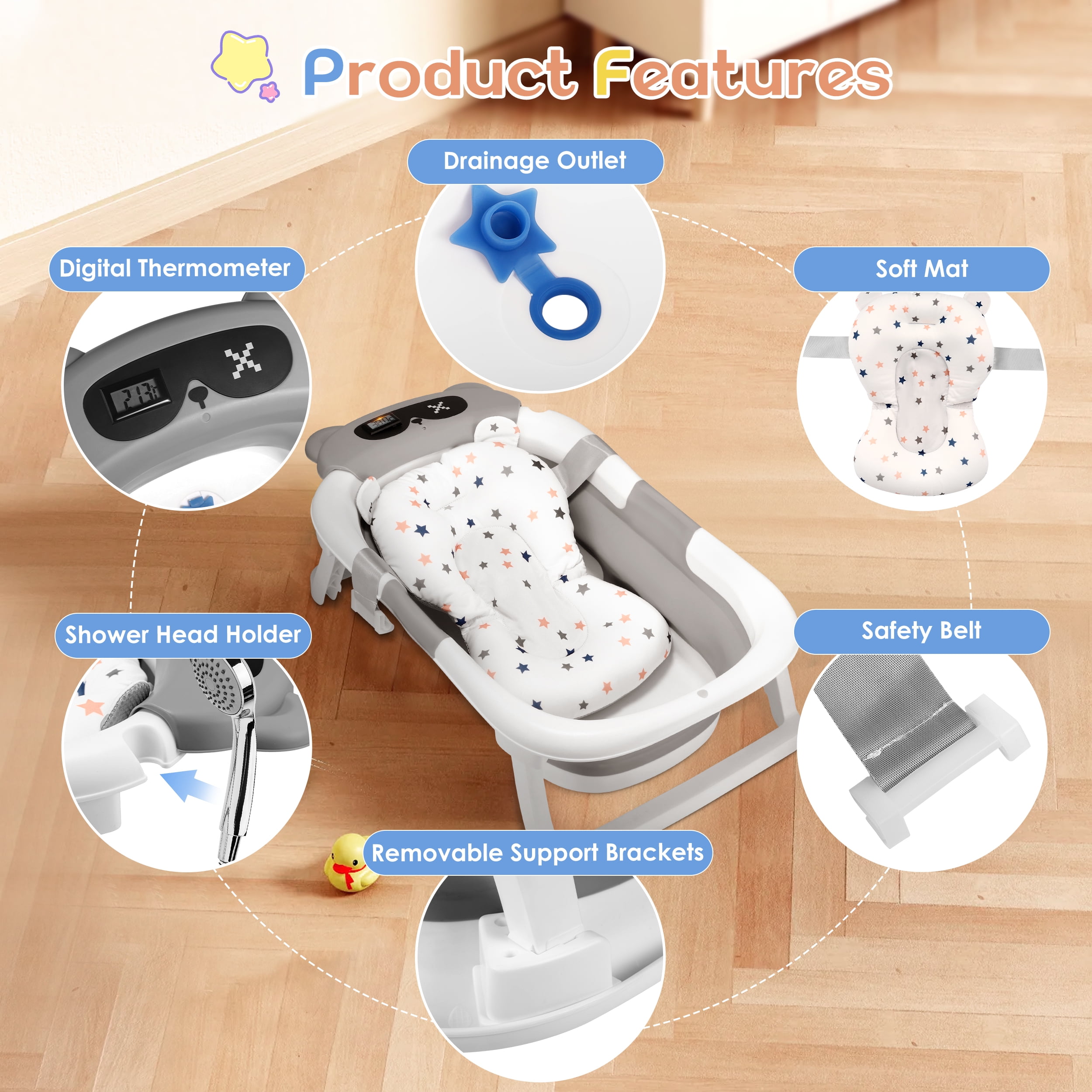 ▶ KEY FEATURES: 【Space-Saving, Foldable Design】 🛁This baby bathtub folds easily into a compact shape, making it perfect for storing in any small space. Ideal for home use and travel. 【Premium Quality Material】 🛁Made from non-toxic, odorless PP+TPE materials, this collapsible baby bathtub is safe, durable, and gentle on your baby’s skin. It’s easy to clean, quick to dry, and bite-proof. 【Real-Time Temperature Monitoring】 🛁The bathtub has a built-in temperature sensor that changes color to show if the water is too hot or just right, helping you keep your baby safe during bath time. 【Comfortable Soft Cushion】 🛁The soft cushion and adjustable straps provide excellent support for your baby’s head and spine, making bath time more comfortable and reducing fussing. 【Convenient Drainage Design】 🛁With a built-in drain hole and rubber stopper, this bathtub is easy to empty and clean. It also comes with a shower head holder for added convenience. ▶ SPECIFICATIONS: Product name: Collapsible Baby Bathtub Material: PP+TPE Color: White+Gray 🛒Package Include: 1 x Baby Bathtub 1 x Bath Pad 1 x Bath Thermometer Feature Overview: ·Compact Fold & Space-Saving ·Real-Time Temperature Monitoring ·Ergonomic Cushion Support ·Durable & Baby-Safe Materials ·Ideal Gift for New Parents