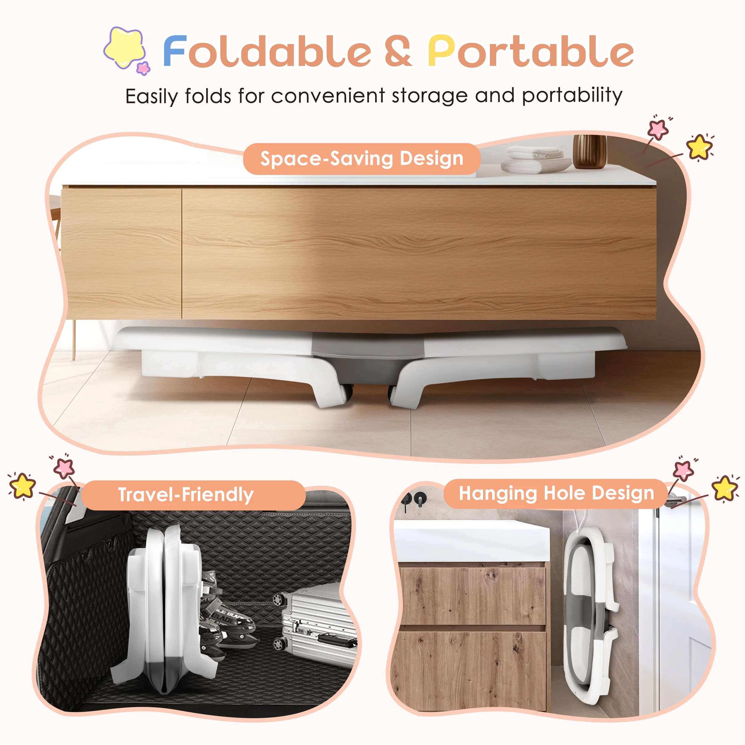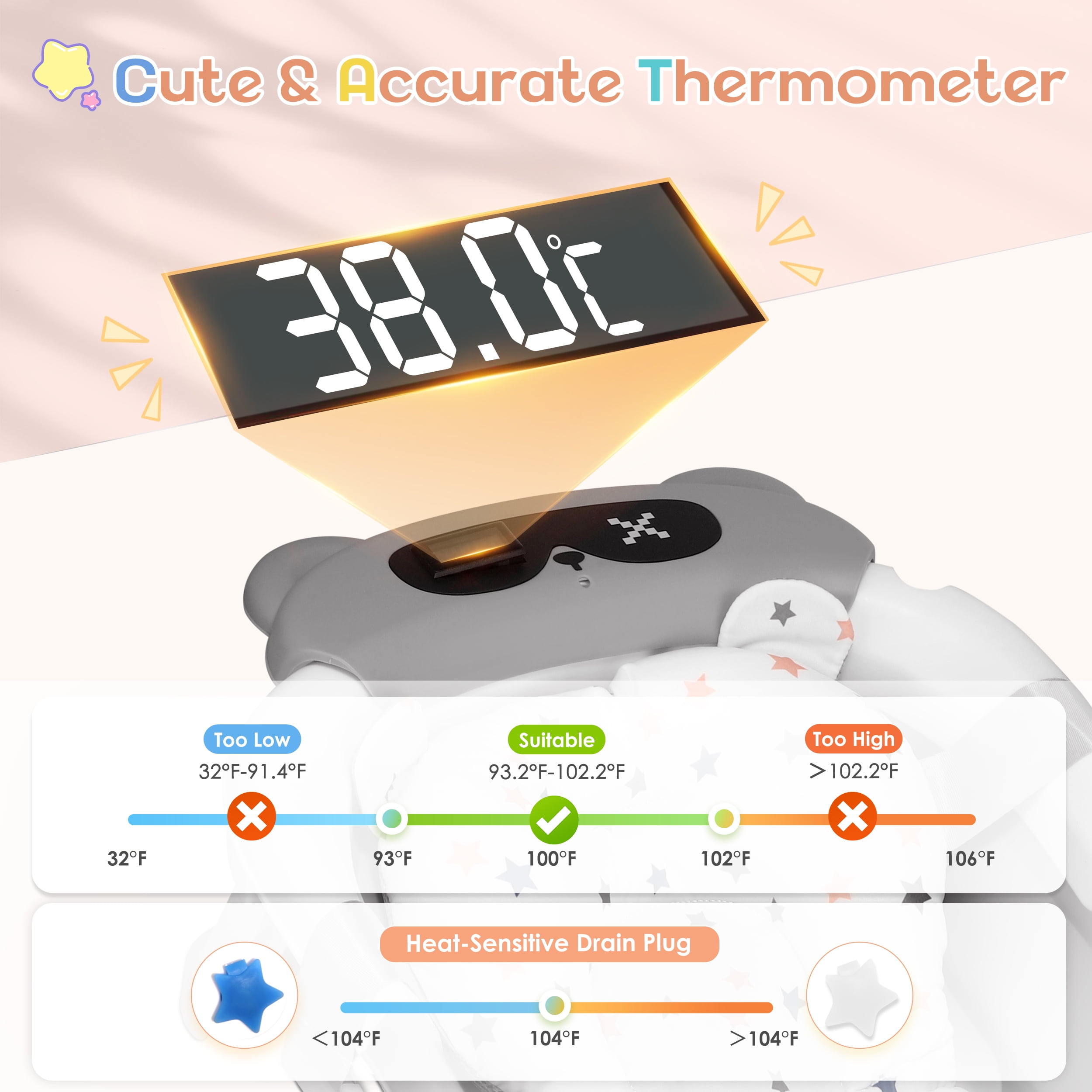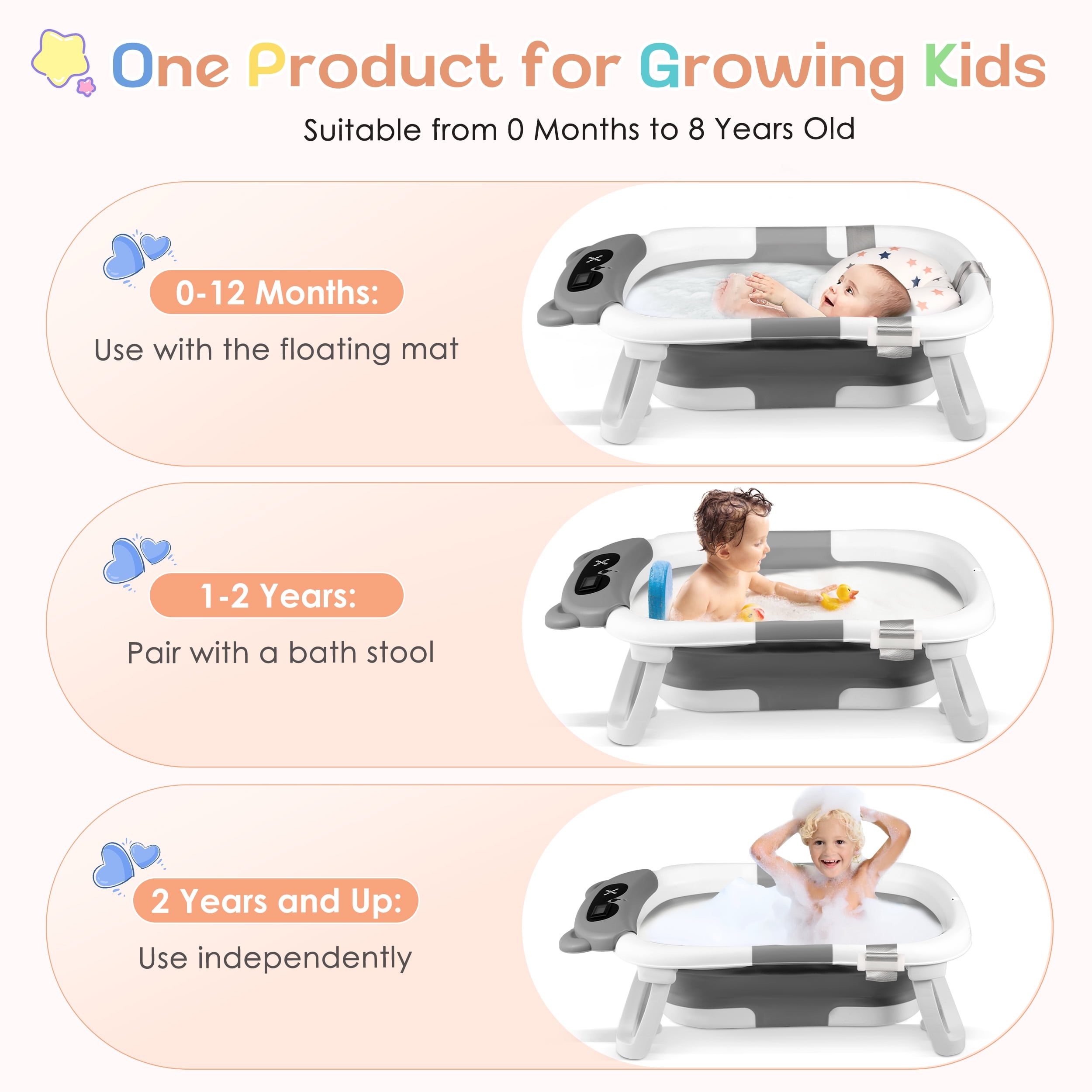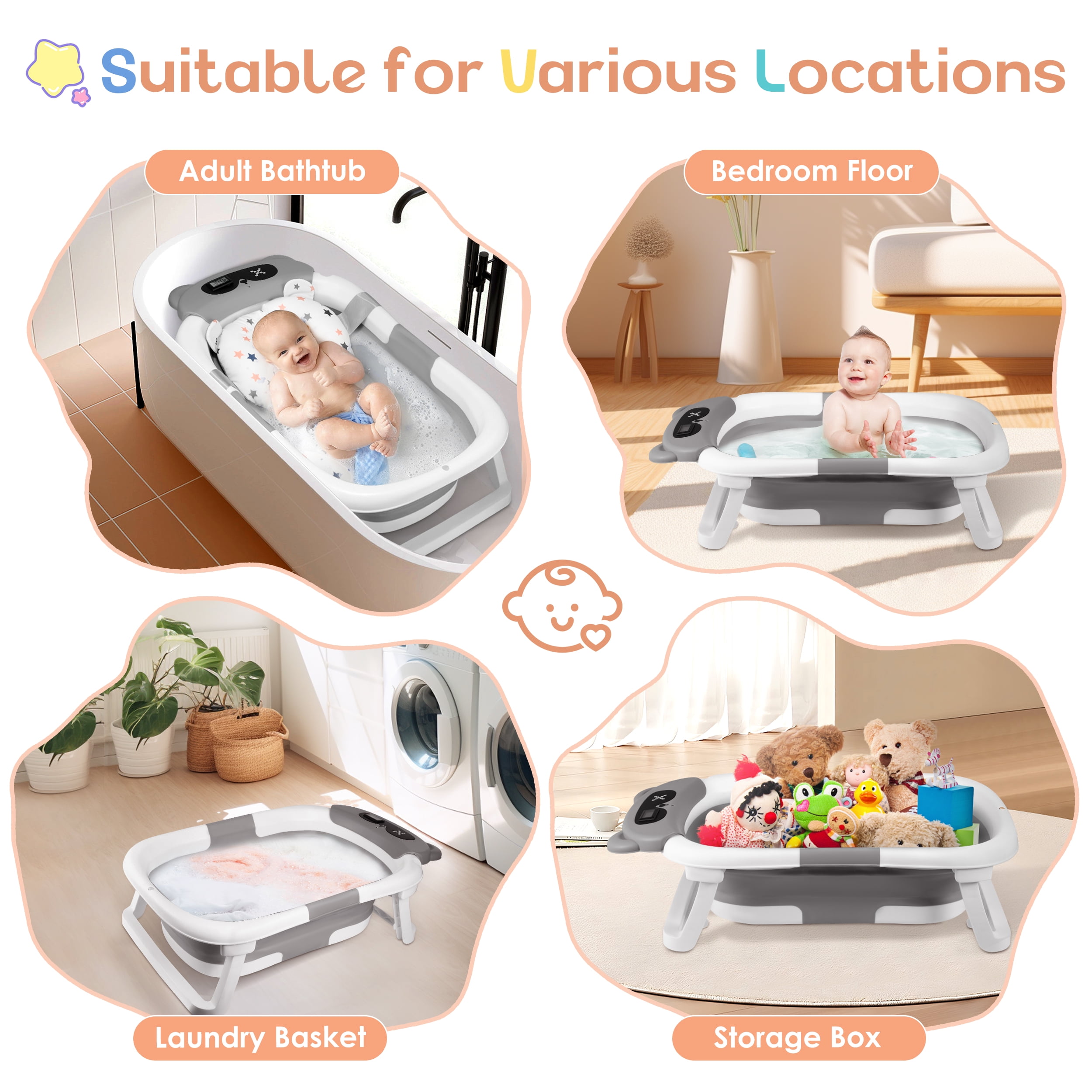 ▶ KEY FEATURES: 【Space-Saving, Foldable Design】 🛁This baby bathtub folds easily into a compact shape, making it perfect for storing in any small space. Ideal for home use and travel. 【Premium Quality Material】 🛁Made from non-toxic, odorless PP+TPE materials, this collapsible baby bathtub is safe, durable, and gentle on your baby’s skin. It’s easy to clean, quick to dry, and bite-proof. 【Real-Time Temperature Monitoring】 🛁The bathtub has a built-in temperature sensor that changes color to show if the water is too hot or just right, helping you keep your baby safe during bath time. 【Comfortable Soft Cushion】 🛁The soft cushion and adjustable straps provide excellent support for your baby’s head and spine, making bath time more comfortable and reducing fussing. 【Convenient Drainage Design】 🛁With a built-in drain hole and rubber stopper, this bathtub is easy to empty and clean. It also comes with a shower head holder for added convenience. ▶ SPECIFICATIONS: Product name: Collapsible Baby Bathtub Material: PP+TPE Color: White+Gray 🛒Package Include: 1 x Baby Bathtub 1 x Bath Pad 1 x Bath Thermometer Feature Overview: ·Compact Fold & Space-Saving ·Real-Time Temperature Monitoring ·Ergonomic Cushion Support ·Durable & Baby-Safe Materials ·Ideal Gift for New Parents