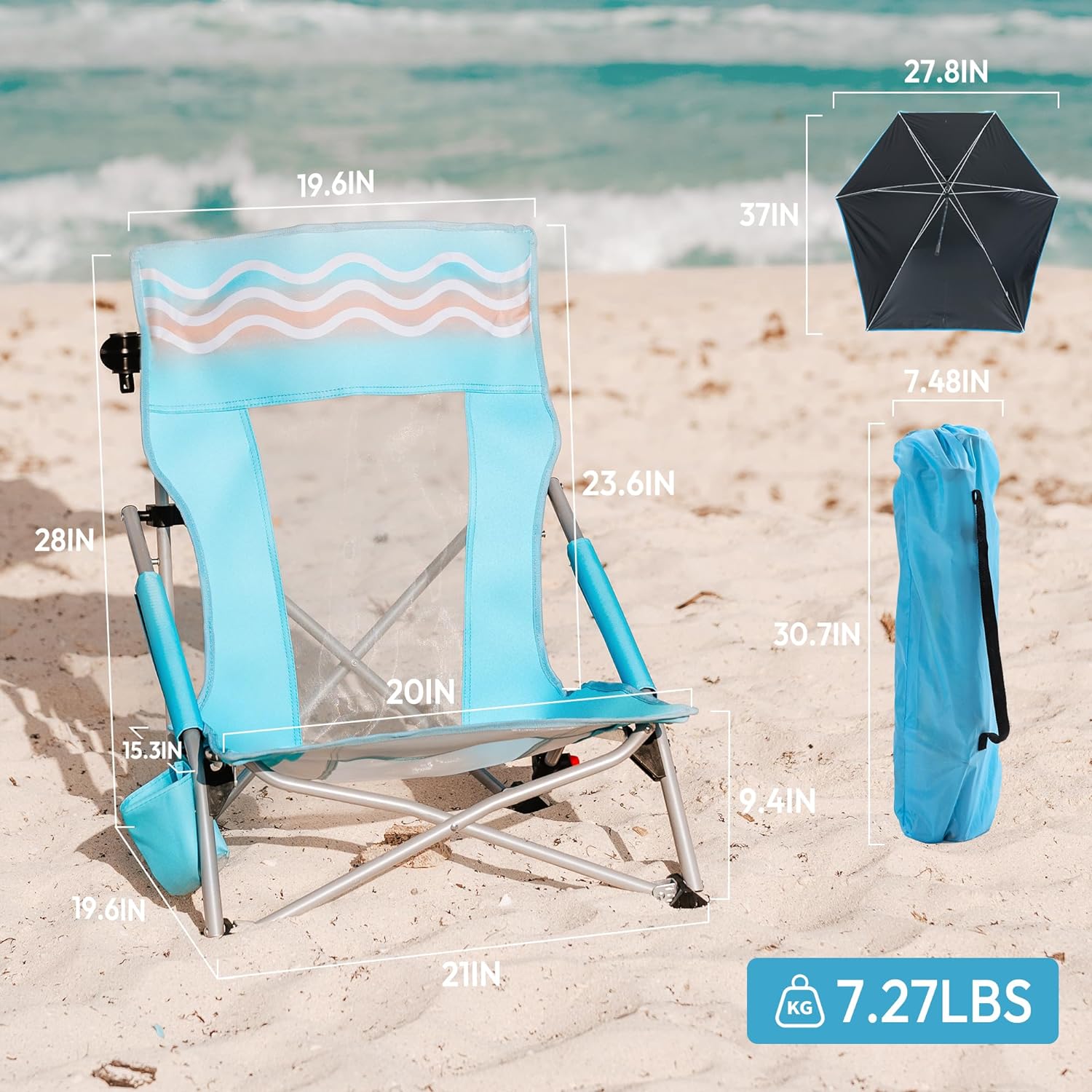 UPF 50+ Titanium Silver Sunscreen Umbrella: the umbrella surface uses titanium silver sunscreen coating, which can reflect multi-band sunlight ultraviolet rays and other visible light, etc. at a high level, reduce melanin deposition and skin photodamage, and lower the body temperature. Quality Function: The beach chair has a three-position adjustable backrest angle, and the umbrella can be adjusted to the angle according to the direction of the sun. The foldable beach chair also comes with a drink cup holder. Storm-Proof Material: This beach chair with umbrella is made of double-layer rip-stop polyester fabric with breathable mesh, which can easily filter the sand. Tight X-bracing for durability and can hold up to 300 pounds. Easy to Setup and Carry: Unfolded Size: 20”x19.6’’x28’’; Folded Size:7.48’’x7.48’’x30.7’’. Weighs: 7.27LBS. No Assembly Required. You can setup the chair within seconds. With a compact folded size and carry bag. Suitable For Multiple Scenarios: the chair is suitable for beach, camping, patio yard. We provide 1 year warranty, please feel free to contact us if there is any problem with the chair. Item depth width height: 22.0 inches Special feature: Cup Holders Material: Alloy Steel