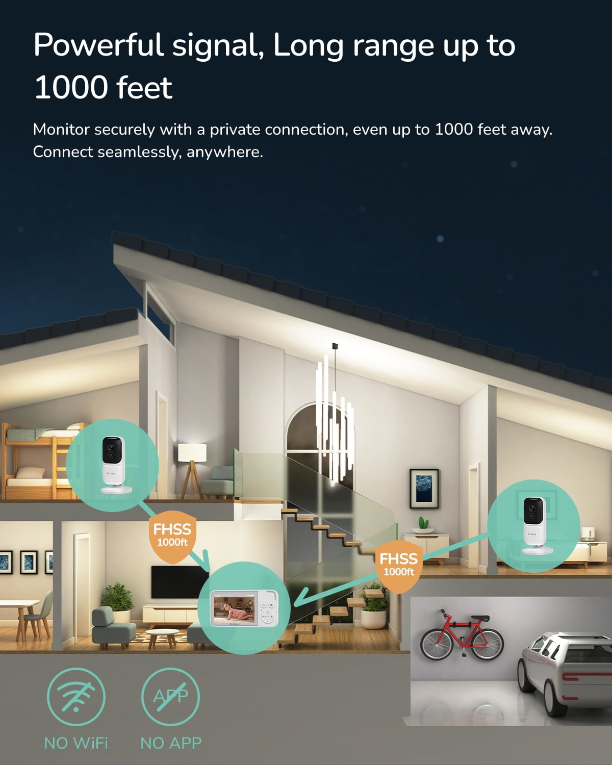 Dr.Care Neo View 3.5” Digital Video Baby Monitor features a vivid 3.5″ 720P HD display and auto infrared night vision. Enjoy secure non-WiFi recording with SD card loop recording, supporting up to 128GB. Dual mode voice monitoring with high-sensitivity microphones captures every sound, switching to VOX mode for louder noises. It uses secure 2.4GHz FHSS technology. With 4X zoom and a 1000ft range, you can watch your baby from anywhere. Enjoy up to 16 hours of audio and 12 hours of video monitoring. The monitor includes 8 soothing lullabies and customizable feeding reminders.
