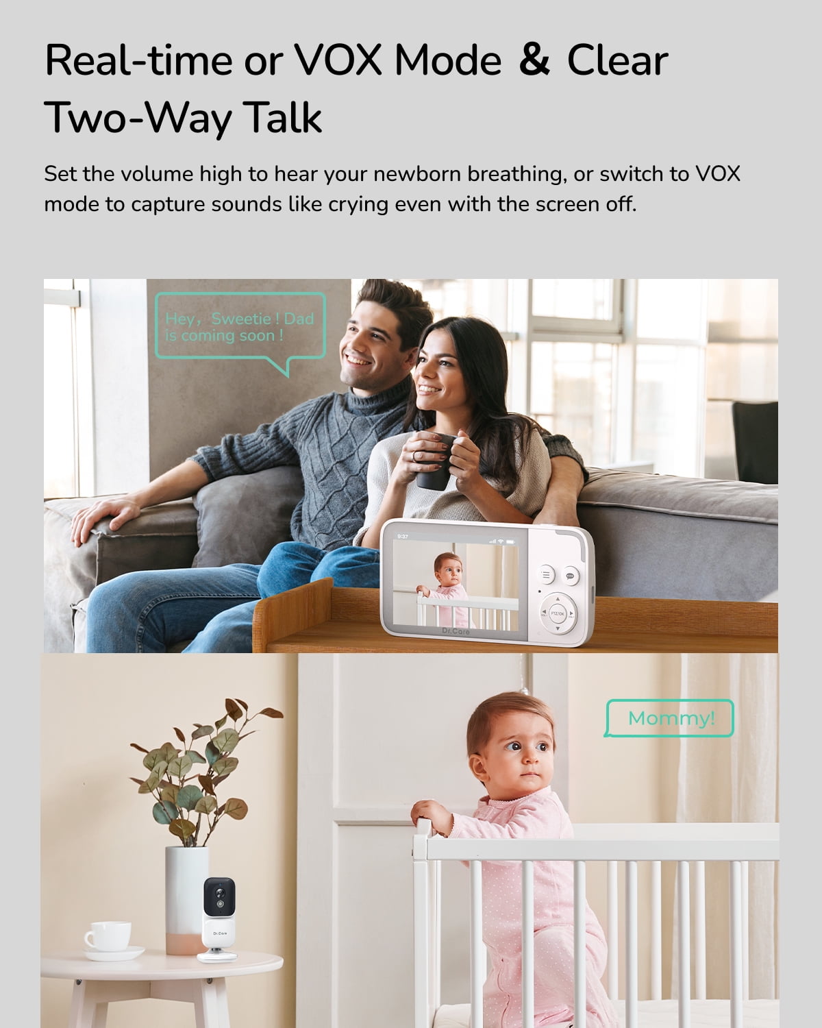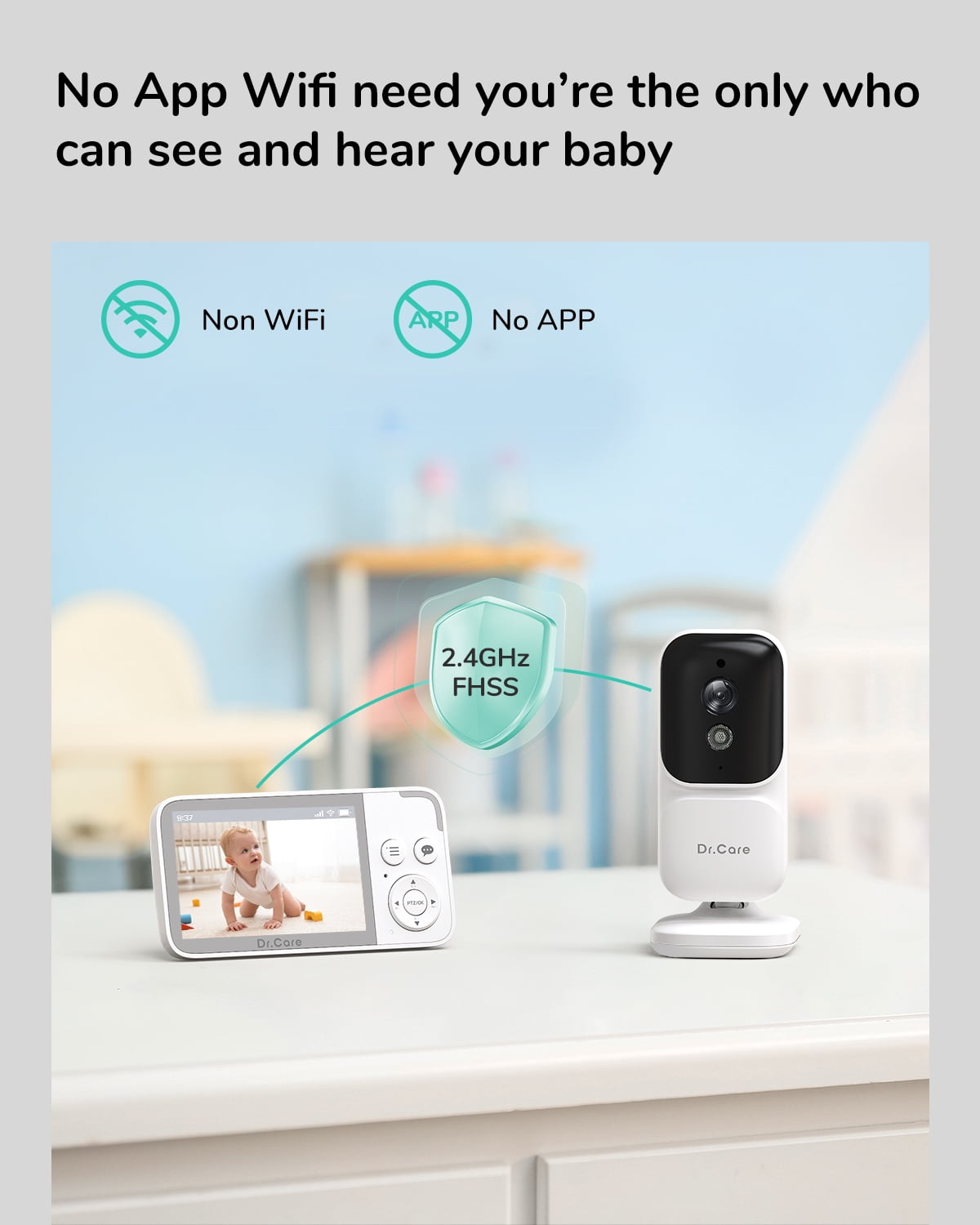 3.5″ 720P HD Digital Display & Auto Infrared Night Vision – Featuring a vivid 3.5″ 720P HD display and auto infrared night vision, it captures every precious moment and tiny movement day and night. Secure Non-WiFi Recording – Safely capture and store video without the risk of hacking using an SD card for video loop recording. You’ll never miss a single milestone. Supports up to a 128GB SD card (not included, only support FAT format TF cards ). Dual Mode Voice Monitoring – Equipped with high-sensitivity microphones, set the volume high to capture your newborn’s breathing and every tiny sound with remarkable clarity from both sides, ensuring you never miss a moment even with the screen off. Switch to VOX mode to capture louder sounds, like crying from active kids. (The monitor stays silent and dark until a sound exceeding your VOX settings activates it.) The Safer Baby Monitor with 2.4GHz FHSS technology – Trusted by thousands of families worldwide, the Dr.Care monitor uses a secure 2.4GHz channel with FHSS technology, ensuring only you can hear, see, talk to, record, and monitor your baby. 4X Zoom & 1000 feet Long Range – With 2X & 4X zoom & a range of 1000 feet, you can keep an eye on your baby from any room or even the yard, making sure you never miss a moment. Unmatched Battery Life – Offers up to 16 hours of audio-only and 12 hours of video streaming, allowing you to monitor your baby from any room or even the yard throughout the night. 8 Lullabies – Enjoy ultimate clarity and peace of mind all day and night with 8 pediatrician-recommended melodies, from gentle tunes to calming sounds, to help your baby drift off to sleep effortlessly. Customizable feeding reminders keep your baby’s schedule on track. What You Get – At Dr. Care, we help every parent embrace the joy of parenthood without sacrificing personal time. Package includes: 1 Dr.Care NeoView baby monitor parent unit, 1 baby unit, 2 USB-C charging cables, 2 power adapters, and 1 user manual. Covered by a 1-year quality warranty with an additional 6-month warranty upon registration, plus 24/7 customer support.