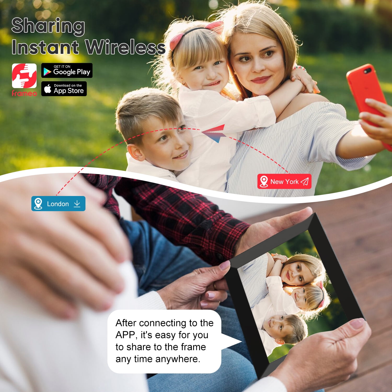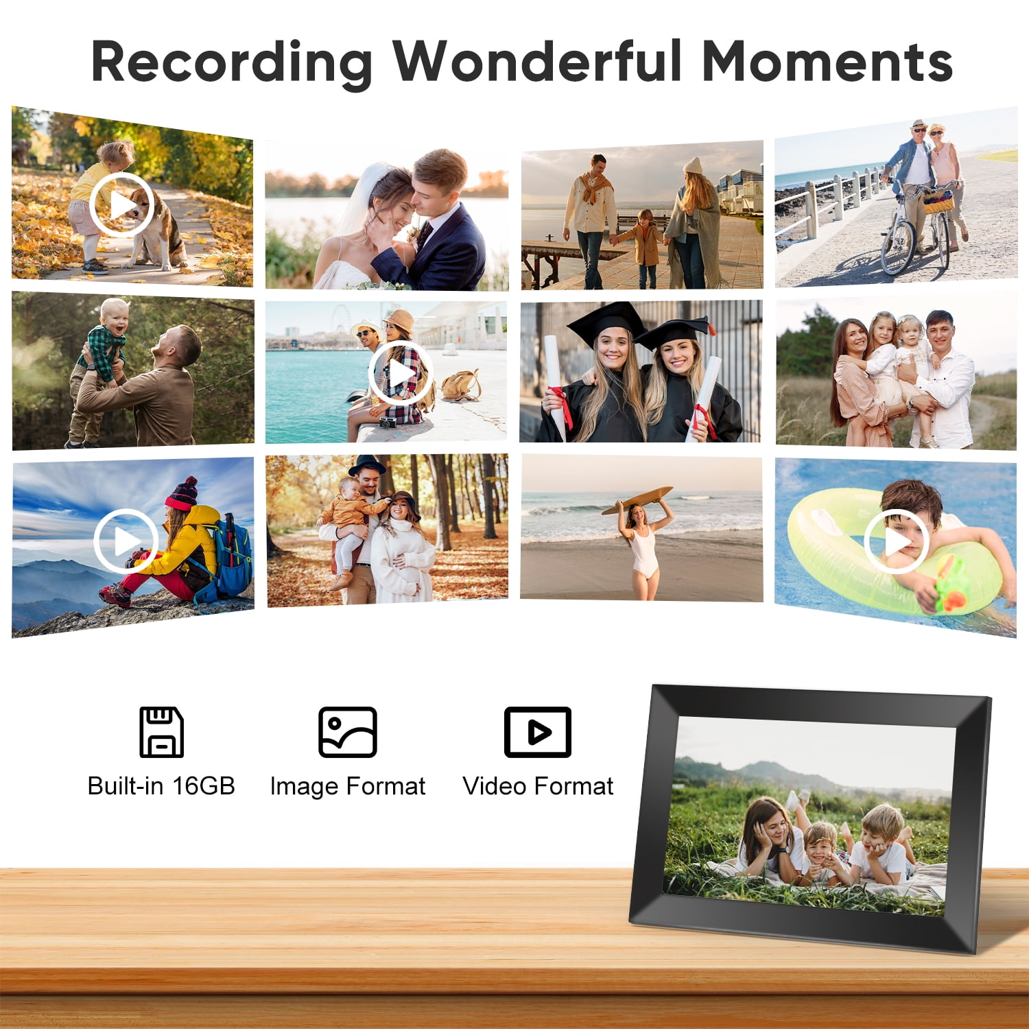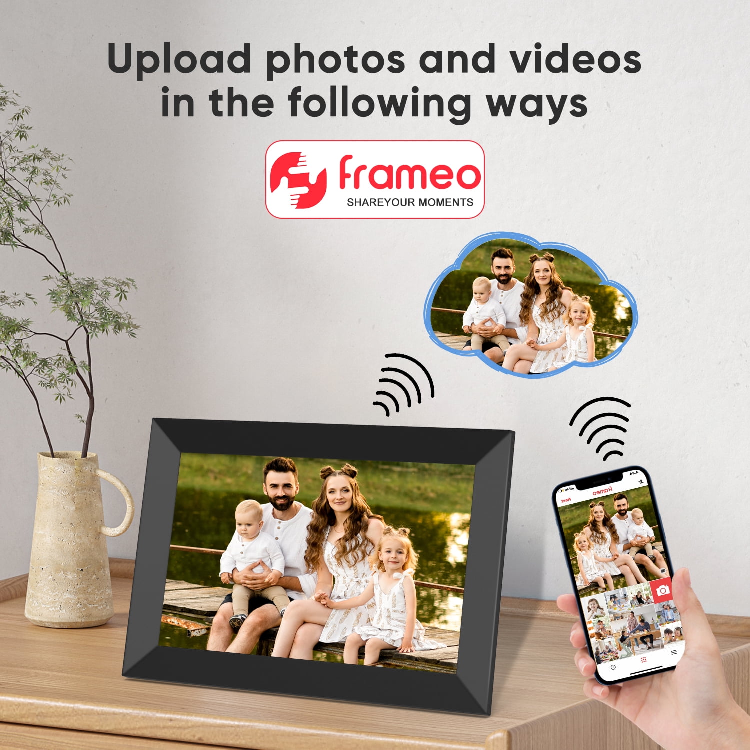 PRIVATELY & SAFELY: DR.J Professional’s new digital picture frames’ cloud servers are secure, encrypted, and compliant, so you can rest assured that your photo stream is secure and private. Invite unlimited users to share photos to your frame and share photos and videos to their frames as well. Send precious photos or playlists to separate frames and build your private family-sharing network. 10.1” IPS HD TOUCH SCREEN: 10.1-inch digital picture frames load from a phone with a 1280*800 IPS high-resolution touchscreen ensures you a high-quality image display from full angles. Intuitive design with a mounting hole so it can be easily mounted on the wall for better viewing experience. The photo frame also can be used as an advertising board for the purpose of product marketing. The User-friendly interface makes it easier for all ages than ever. LARGE STORAGE: Send a memorable picture with a meaningful caption, this is sure to be a surprising way of telling feelings or making a confession. The auto-rotation function allows the pictures to adjust the directions in either portrait or landscape orientation to fit the smart digital picture frame as you want. Built-in 16GB storage with an expandable SD card slot allows you to share 20000+ photos with ZERO subscription fees. SENT BY FRAMEO APP: WiFi digital photo frame shares photos or short videos(up to 15 seconds) from your phone via the ‘Frameo’ App. The WiFi photo frame supports picture format by JPG/JPEG/BMP/PNG and video format by MP4. Our WiFi photo frame and App both are available in English, German, Spanish, French, Italian, and Japanese. SINCERE GIFT TO THE LOVED ONE: Our digital picture frame WiFi is a perfect gift idea for your loved ones of all ages such as parents, grandparents, newlyweds, graduates, or family separated by distance. It is also a great gift choice for Mother’s Day, Father’s Day, Thanksgiving, Christmas, Birthday, Wedding Anniversary, and other big days. Capture every precious moment and hold onto memories lasting forever. SUPPORT MULTIPLE FORMATS: Our digital photo frame supports multiple formats. Video formats: MEPG1/2/4, H.263/H.264, RMVB, WMV/VC-1, MVC, AVS, MJPEG (UP TO 1080P). Audio formats: MP3, WMA, WAV, OGG, FLAC, ALAC, APE, AAC, AC-3, DTS (need license). Image format: JPG, BMP, PNG. WARRANTY SERVICE: We provide a 3-YEAR sales service promise, 30 days of no reason to return, a 100% money-back guarantee, and professional customer service and technical support. You can contact us anytime by e-mail, call, or our brand website, and will be answered within 24 hours. PACKAGE CONTENT: 1*Digital Picture Frame, 1*Charger, 1*Bracket, 1*User Manual.