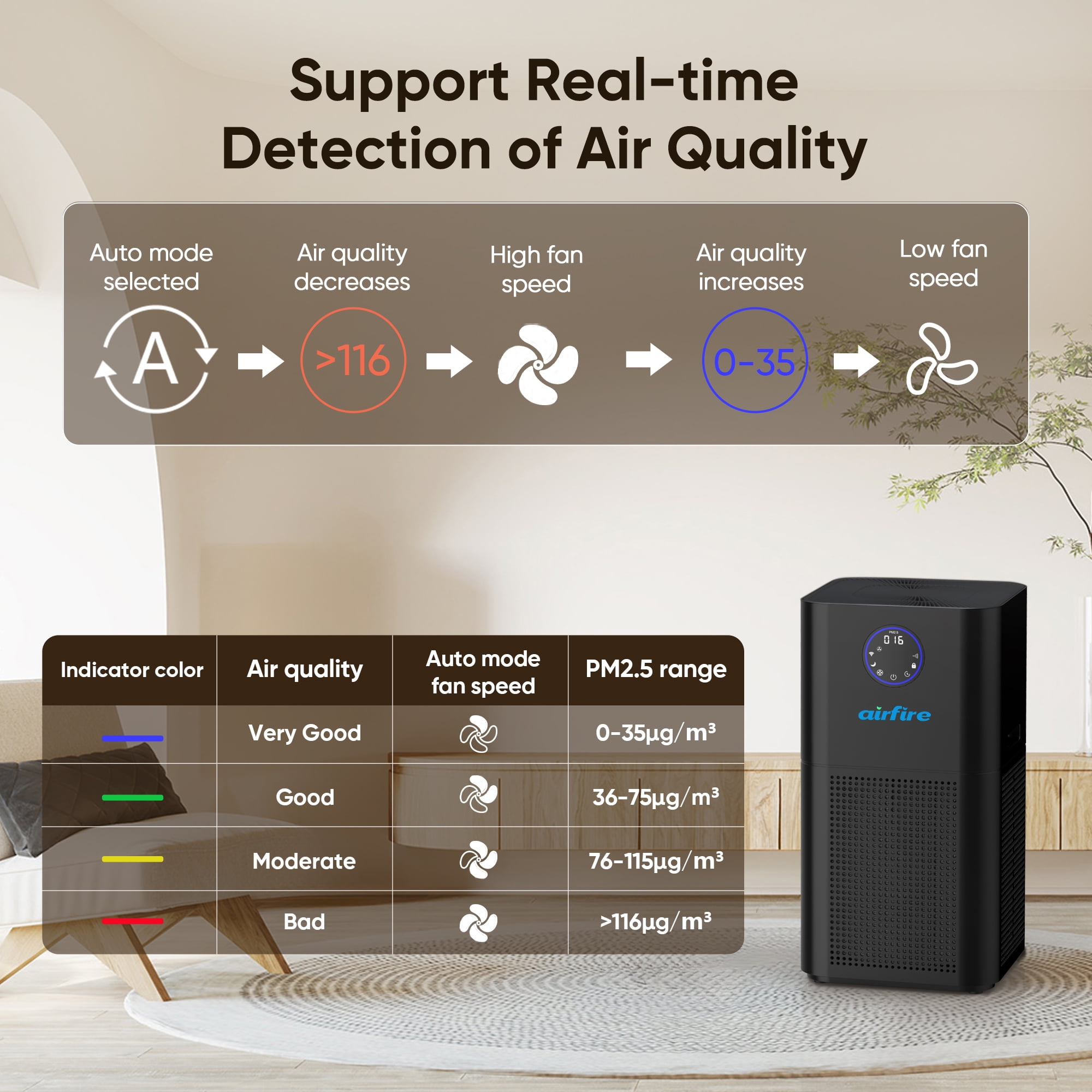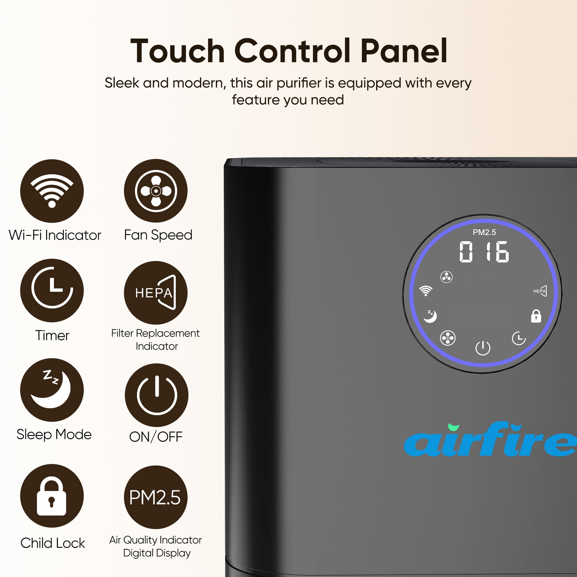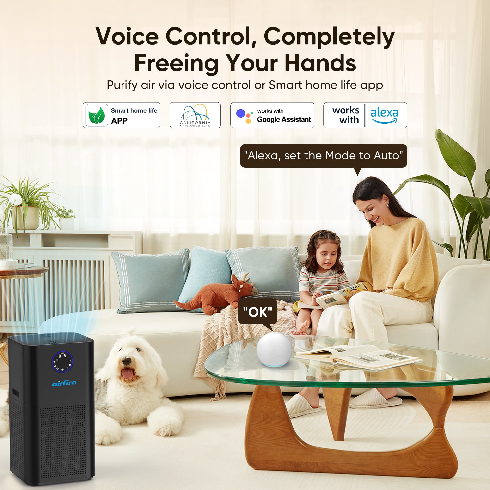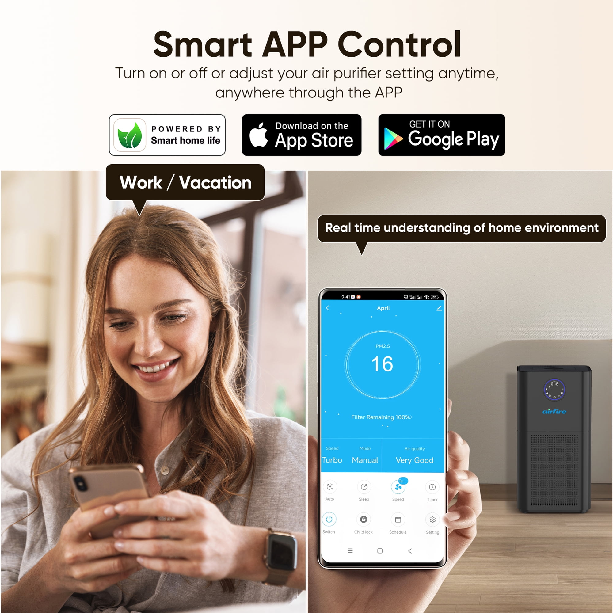 Support 3500 Sq. ft Room: Our air purifiers for home large room can purify a 3500 sq. ft. room once and a 700 sq. ft room five times within an hour. In addition, it is equipped with the latest tech motor and 360°air inlet in 2024, which can quickly and efficiently clean pet dander & odor, smoke, volcanic ash, dust, etc. Our air purifiers for smoke odors can bring you clean and fresh indoor air and protect you and a good body for your family. Equipped with H13 Level Advanced HEPA Filter: This air purifier for bedroom is equipped with a true H13 HEPA air filter. Our true air purifiers for dust is equipped with a four-layer filtration system: pre-filter, H13 HEPA filter, carbon filter, and non-woven fabric. Our air purifier for home can help you remove 99.97% of small dust, as well as pet hair/odor as small as 0.3 microns, smoke, volcanic ash, car exhaust, kitchen fumes. Provide you with a comfortable indoor environment to protect you from lung disease. Supports Smart APP Control: Our air purifier for pet dander support you remotely turn it on or off anytime and anywhere, whether you are at home or not. Just download the “Smart Home Life” APP. Control your HEPA air purifier through the APP. The APP product is rich in functions to meet your various needs and provide you with multiple conveniences. Support Alexa or Google Assistant Control: Our air purifier for mold support you connect to Alexa or Google Assistant through our app. When you want to get up or go out, all you need to do is say a word like “Alexa, turn on/off the air purifier”. After that, our air cleaner will start working and purify the air for you. Sleep Mode and Ultra-Quiet: You can turn on the sleep mode of our air purifier for room when sleeping at night, so that only the sleep indicator light is on, and the noise in sleep mode is less than 23dB. Our home bedroom air purifiers can provide you with a comfortable sleeping environment, allowing you to sleep peacefully. 1-12 Hour Timer and Child Lock Function: Whether you take a lunch break or an evening break, you can set the schedule. On the machine interface, you can set the timer for 1-12 hours. On the APP side, you can also set a long timer, and even schedule to turn on the air purifier for dorm at a certain time in the future. In addition, Our WiFi air purifiers also has a child lock function to prevent children or pets from accidentally touching it. Smart Filter Replacement Reminder: Our portable home bedroom air purifier comes with a 3000H efficiency HEPA filter replacement reminder. You can also check the service life of the filter element through the APP. After the portable air purifier has been used for 3000 hours, the indicator light will flash. Depending on usage and air quality, it is recommended to replace the filter element every 6-8 months. To ensure the all results from your product, we recommend using official air filters. Must See: The power adapter, manual and remote control are all inside the filter, please rotate the bottom of the air purifier to take out the filter before usage to get all the accessories. Quality Assurance: This home air purifier for large rooms is FCC certified, CARB approved ETL Listed and 100% OZONE FREE, totally environment friendly. Besides, we provide 3-Years Warranty & Lifetime Service Support. What’s Included: 1* Air Purifier withH13 Level HEPA Air Filter, 1* Power Adapter, 1* Remote Control, 1* User Manual