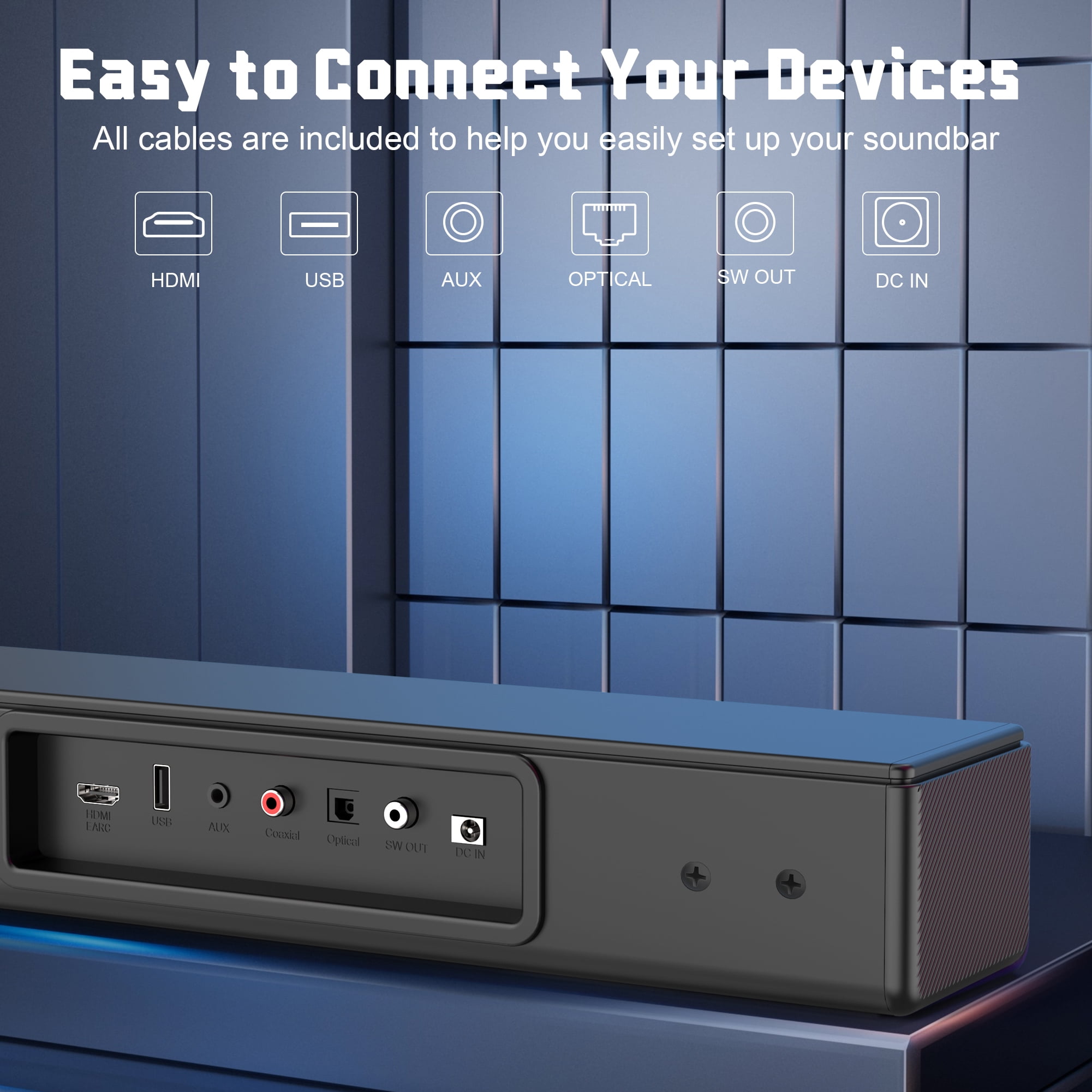 【Dolby Atmos Soundbar】Dolby Atmos technology enhances 3D audio, providing a more immersive and spatial sound experience. 【2.1 CH Soundbar with Subwoofer】Two 2.25” full-range speakers and a 5.25” subwoofer deliver 200W of powerful and clear sound, perfect for music, movies, and gaming. 【Wireless Bluetooth 5.3】The latest Bluetooth 5.3 ensures stable and efficient connections to smart devices, allowing you to stream your favorite content seamlessly. 【Bass and Treble Adjustable】Equipped with three EQ modes, the soundbar lets you customize the bass and treble to suit your preferences. 【Multiple Connectivity Options】HDMI, Optical, and AUX inputs make it easy to connect the soundbar for TV to various devices like TVs, PCs, and gaming consoles, ensuring a simple and convenient setup. 【What’s Included】 1* Sound Bar 1* Subwoofer 1* Remote Control (2 AAA Batteries Not Included) 1* DC Adapter 1* Aux Cable 1* HDMI ARC cable 1* Optical Cable 【Specifications】 Size : 17.2 x 12.8 x 5.9 inch Weight : 9.48lbs Power : 200W EQ modes : GAME, NEWS, MUSIC, MOVIE Bluetooth : 5.3 Support : Bluetooth、AUX、OPTICAL、Coaxial、USB