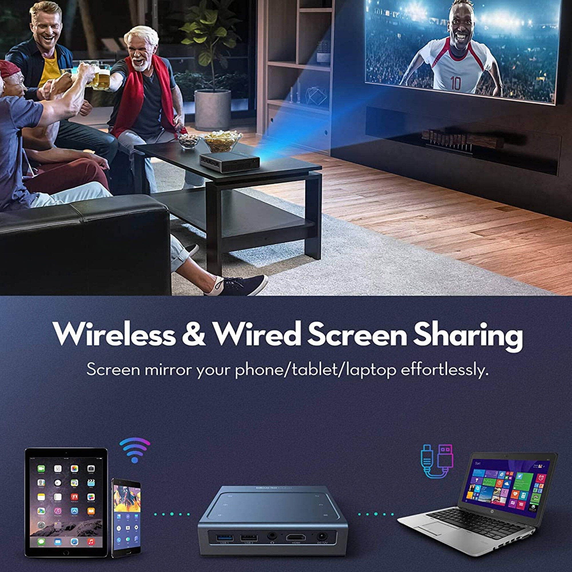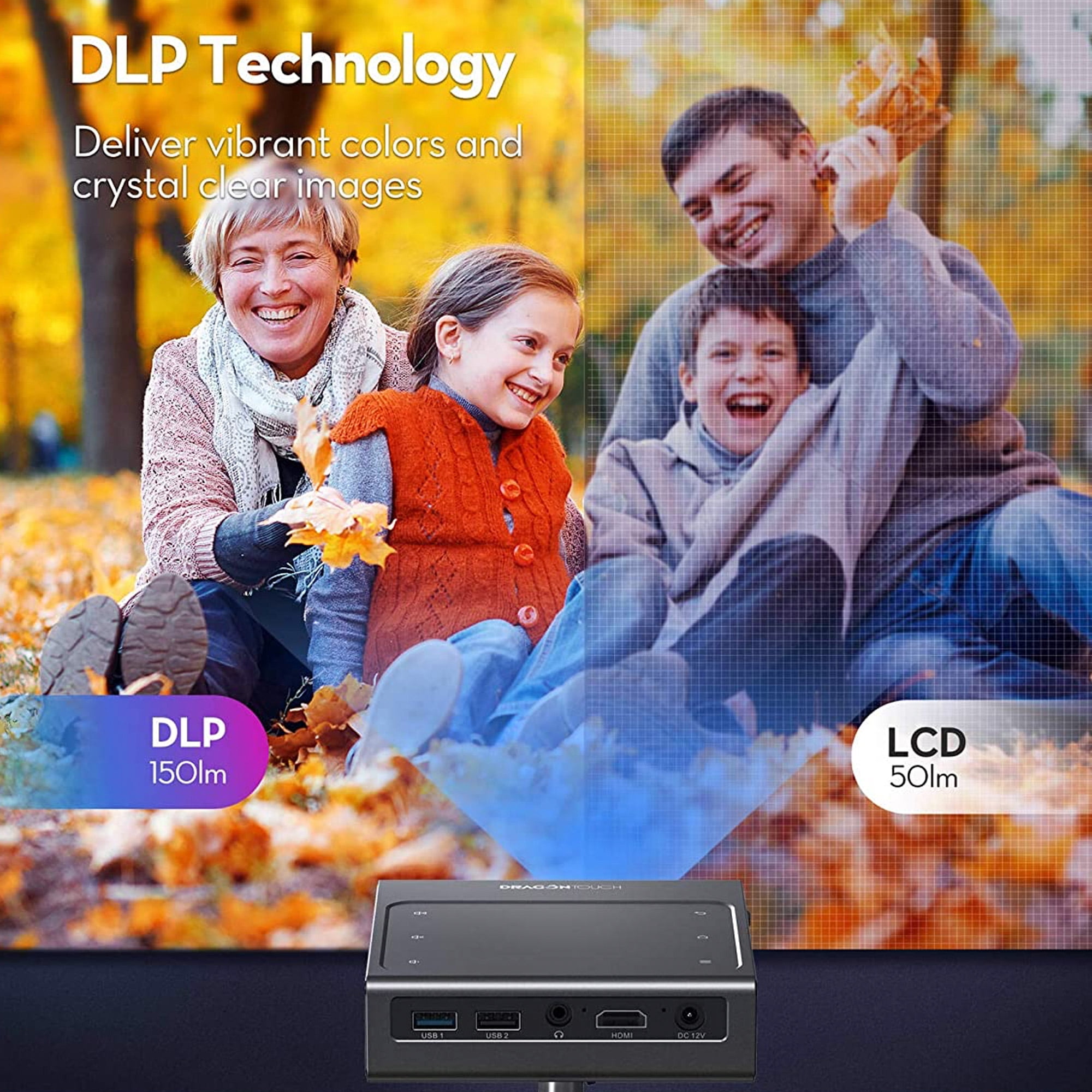 Dragon Touch Portable Mini Projector, 150 ANSI Lumen 1080P Supported DLP Home Theater Projector with Android 7.1 OS, 150″ Display Trackpad Design, Wireless and Wired Screen Sharing
