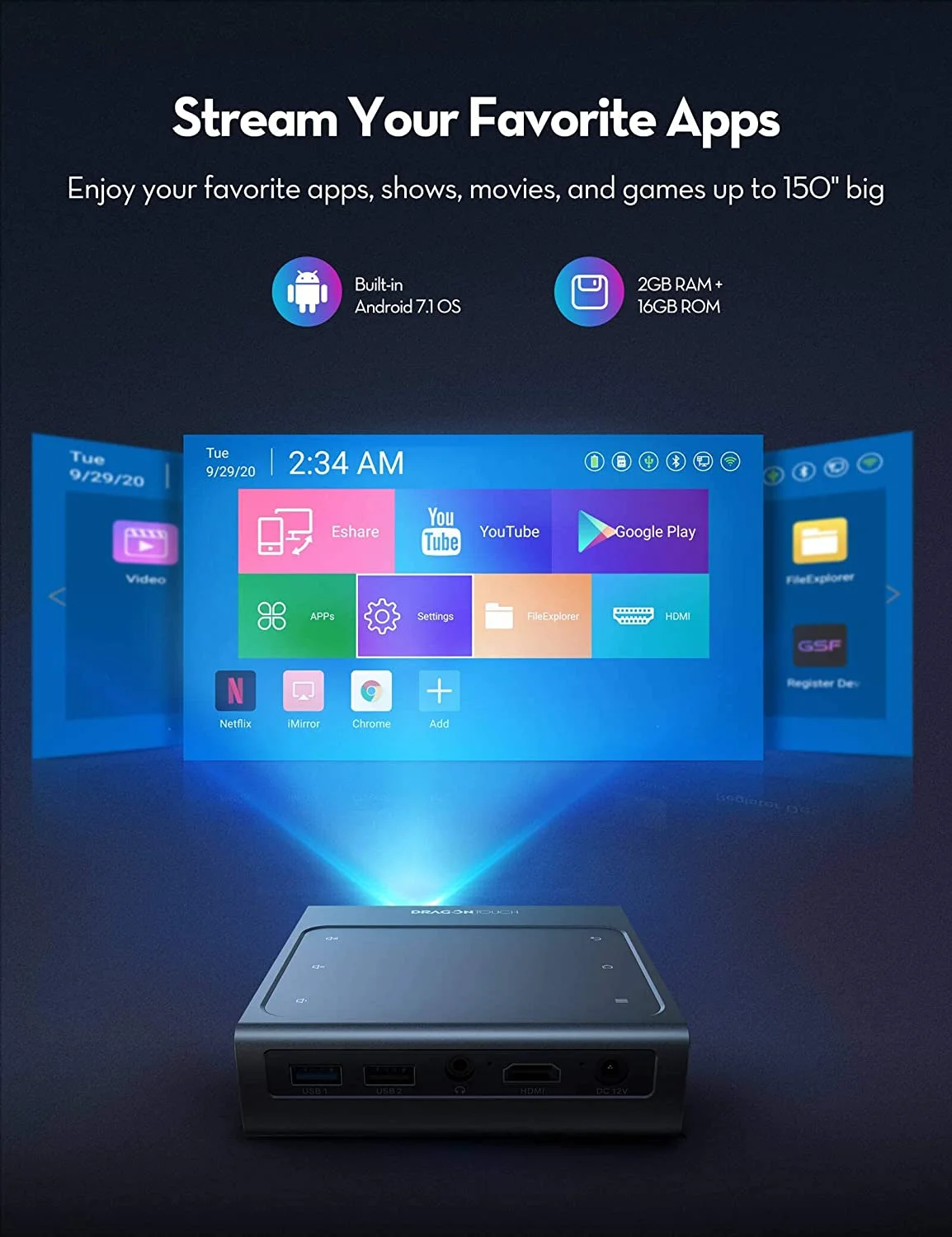FEATURES: Go-Anywhere Mini Projector – The compact and lightweight design (4.4*4.4*1.1 inches, 2.1lbs) and the 360° rotatable projector tripod stand make it a great portable projector for outdoor movies and camping trips, as well as a home theater. With multiple input interfaces (USB, HDMI, 3.5mm AUX, and slot for microSD card), it can be easily connected with your smartphone, PS4, Xbox One, external speakers, and more. This video projector is great for playing movies, TV shows, video games, sports games. High Resolution Crystal Clear Image – Advanced DLP technology (0.3DMD Optically processed chip) delivers vibrant colors and crystal-clear images, and supports up to 1080p resolution. The RGB LED bulb with 150 ANSI lumens of brightness ensures a bright picture. Soft lighting prevents glare and protects against radiation and eye injury. Convenient Touch Control – With a sensitive touch panel, you can easily set up and operate the video projector at the touch of a button. Its touchscreen allows you to select your media, apps, and more with drag-and-click simplicity. You can project from virtually any angle with the easy-to-use auto keystone correction system. Wireless & Wired Screen Sharing – This smart movie projector adopts the latest Multi-screen technology and supports AirPlay, Miracast, EShare and DLNA. You can wirelessly connect your smartphone with this mini projector via Wi-Fi or by using an HDMI cable. Shorter throw lens projects up to 150 inches, letting you enjoy your own home theater wherever you go. Built-in Android 7.1 Operating System – Easily access all the contents you love and download your favorite apps and games from Google Play. Dragon Touch home theater projector’s 2GB of RAM and 16GB of internal storage allows you to directly download apps like Netflix, YouTube, and Hulu to stream copyrighted content. SPECIFICATION: Mounting Type: Tripod Mount Brand: Dragon Touch Controller Type: Button Control Display Resolution: 854 x 480 Connectivity Technology: USB, HDMI Display Technology: DLP Image Contrast Ratio: 1000:1 Resolution: Full HD 1080p Batteries: 1 A batteries required. (included) Internal Storage: 2GB RAM + 16GB ROM G-sensor: Auto Keystone