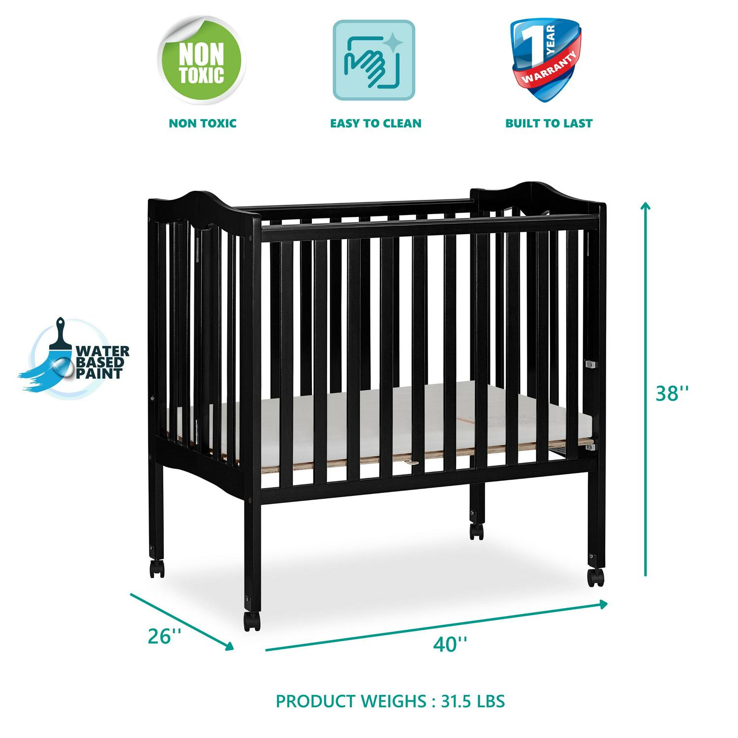 The Dream On Me 2-in-1 Lightweight Portable Folding Crib features unique hinges that allow the crib to fold flat for compact storage or travel. The stationary rail design provides the utmost in product safety. Made of solid pine and having a beautiful non-toxic finish, this portable lightweight crib has safety-hooded, locking wheels and can be converted from a crib to playpen with one hand. Weighing only 32 pounds, this lightweight crib is easy to maneuver and handle.