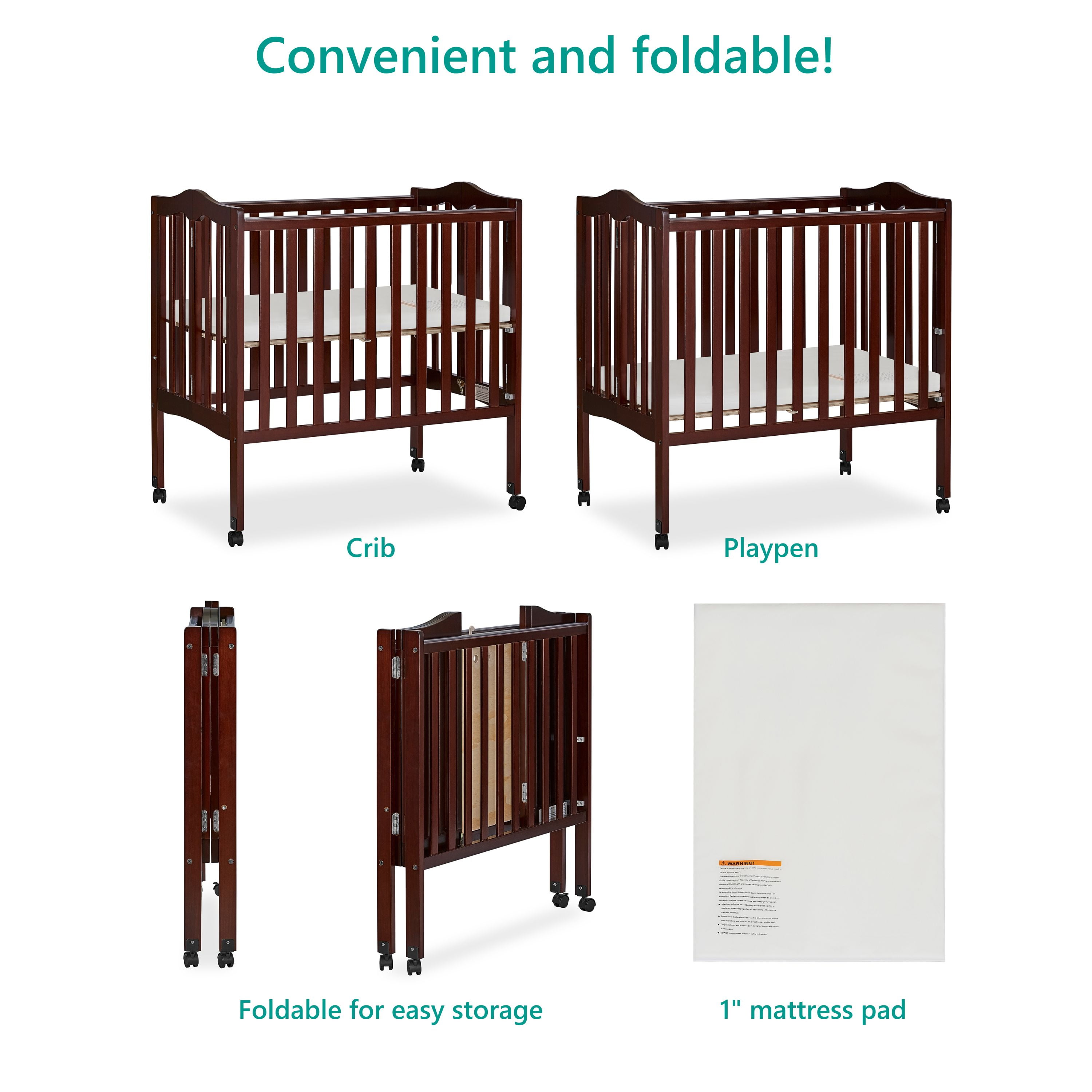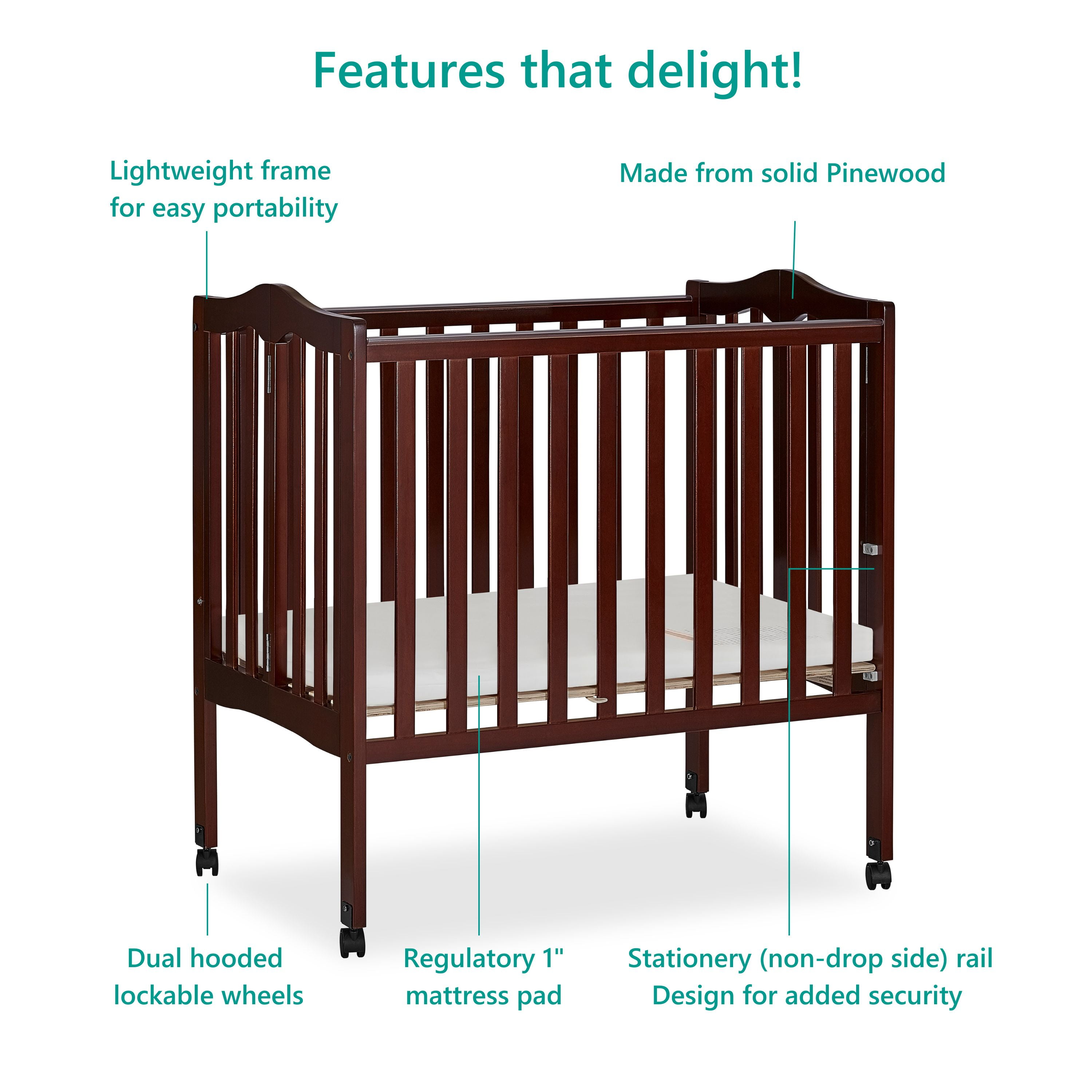 The Dream On Me 2-in-1 Lightweight Portable Folding Crib features unique hinges that allow the crib to fold flat for compact storage or travel. The stationary rail design provides the utmost in product safety. Made of solid pine and having a beautiful non-toxic finish, this portable lightweight crib has safety-hooded, locking wheels and can be converted from a crib to playpen with one hand. Weighing only 32 pounds, this lightweight crib is easy to maneuver and handle.