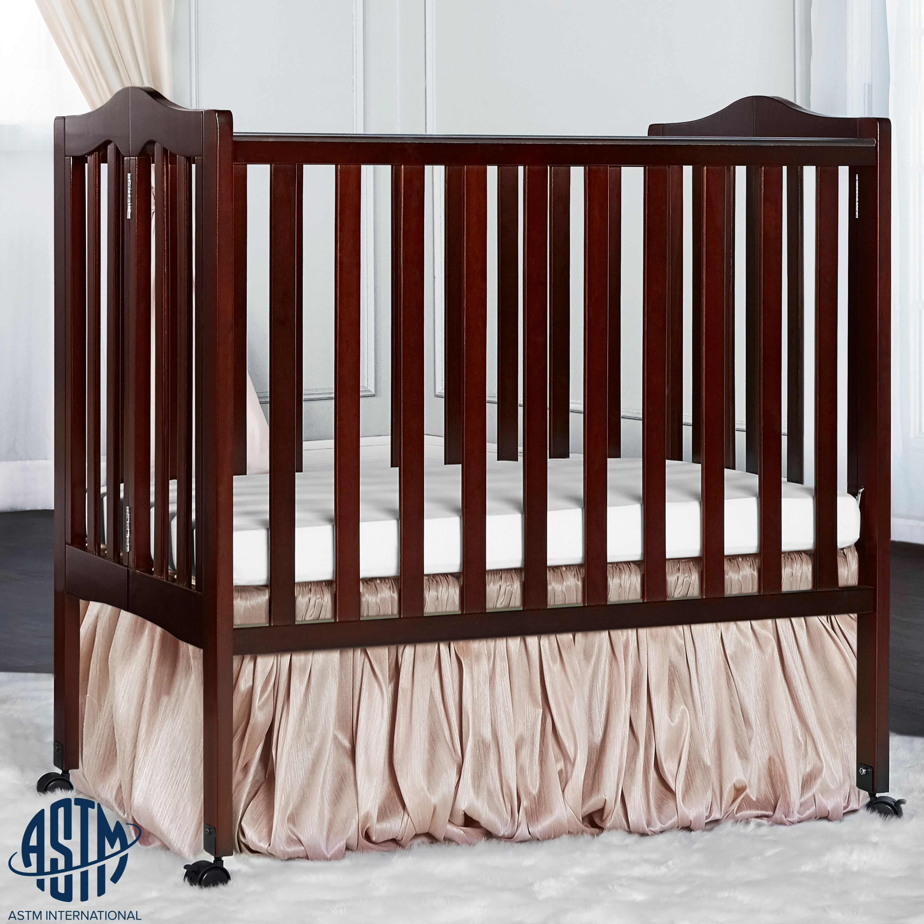 This crib delights with its functionality for your newborn! The crib assembly is quick and the U S patented rail design easily helps convert it from a crib to a playpen in seconds, making it a nursery must-have! The unique hinge system allows it to fold flat for compact storage. Its lightweight frame with wheels allows easy maneuverability and portability, making it the ideal travel companion. Product weight is 31.5 lbs. The stationary (non-drop side) rail system and dual hooded, locking wheels provide the utmost in product safety It meets applicable ASTM/CPSC standards Made of pinewood, it’s lean, minimalist design and six stylish finish options give it a versatile appeal, allowing it to mix and match into any room decor One-inch crib mattress and tools for easy assembly included Crib dimensions are 40L x 26W x 38H Maximum baby weight limit is 35 lbs