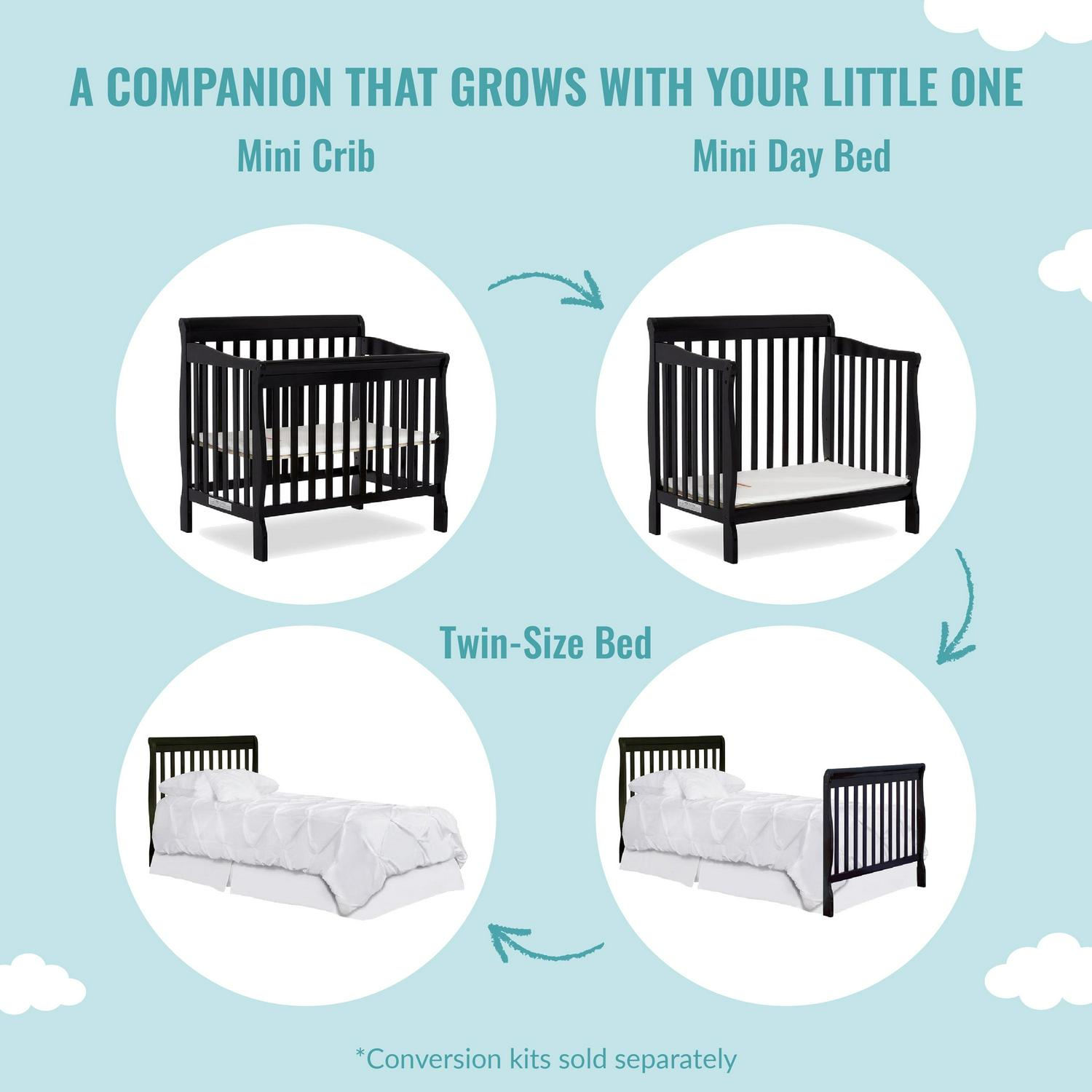 The Dream On Me Aden convertible 4-in-1 mini crib is a beautifully designed crib that gracefully matures gracefully with your child from infancy, through childhood to adulthood. With its robust good looks and solid frame, this crib features a stationary ( non-drop side) rail design which provides the utmost in product safety. For ease in reaching your baby, it sits low to the floor and features the convenience of a 3 position, adjustable mattress support system. Stylish and sturdy, this lovely piece of nursery furniture grows with your child transitioning easily into a toddler daybed, and twin size bed (twin size bed frame and twin mattress not included). Available in a variety of stylish finishes, coordinates with the Dream On Me.