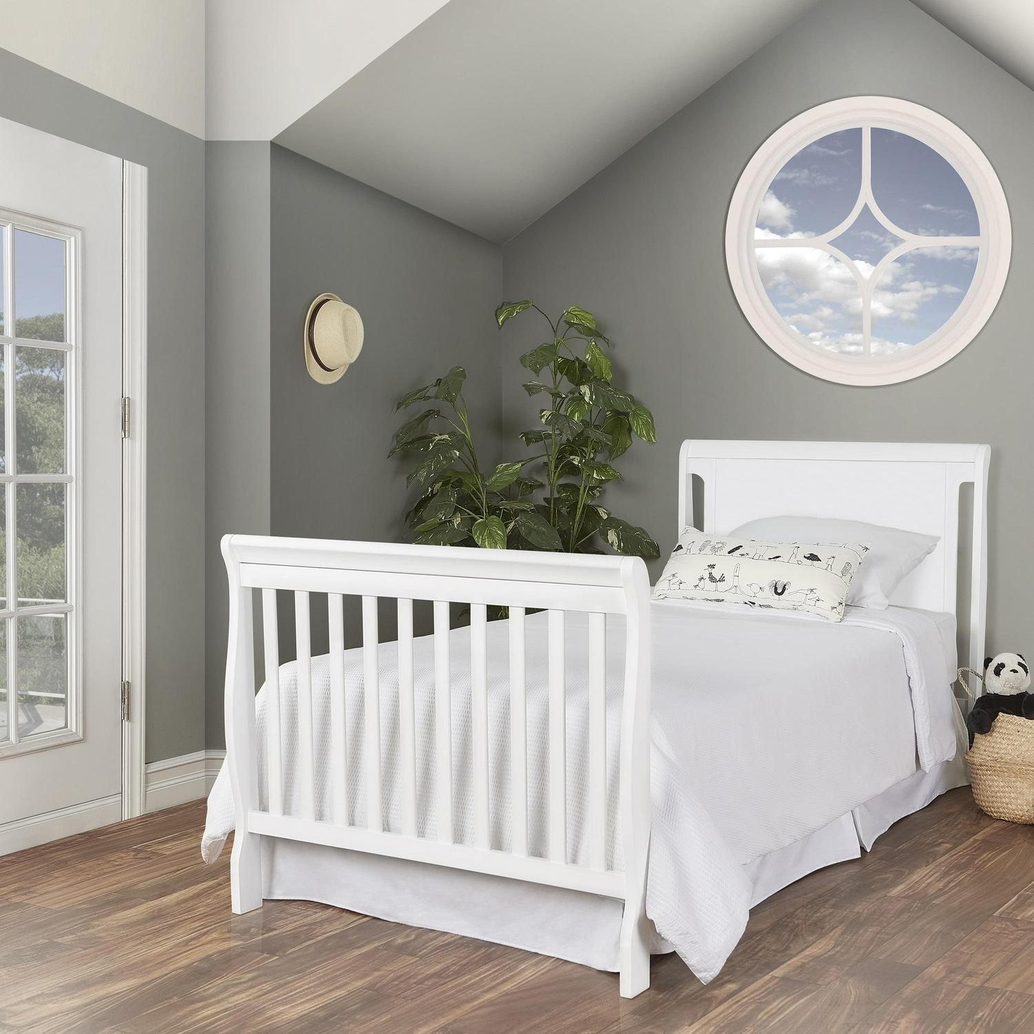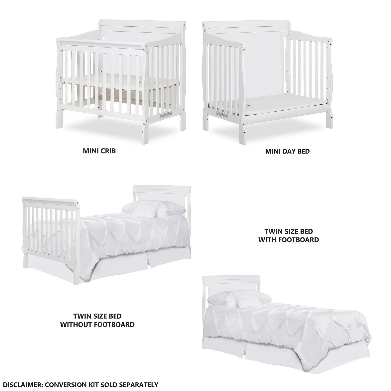 – Cribs coverts into a daybed and twin size bed. Twin Size Rail sold separately