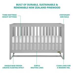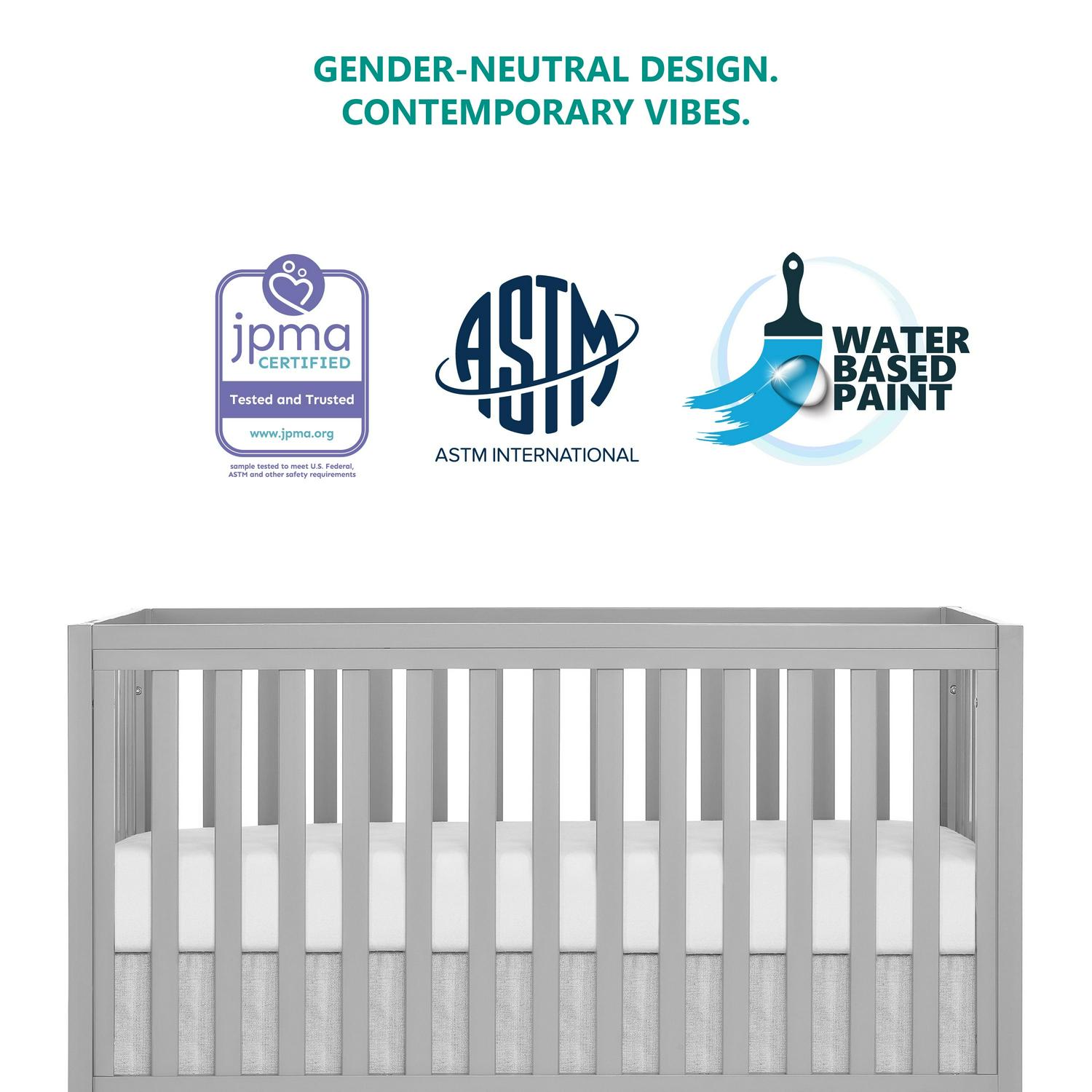 Introducing the Dream On Me Arlo 5 In 1 Convertible Crib which offers a unique but stylish choice for a modern nursery. It features a distinguished base that creates a floating effect for a contemporary look. The adjustable mattress heights allow this crib to grow alongside your little one, starting with the highest level then lower it as your baby begins to sit or stand. The Arlo crib can be converted into a toddler bed, daybed/sofa and full-sized bed (conversion kit, conversion toddler rail and bed rails sold separately). Built of durable, sustainable and renewable New Zealand pinewood, the Arlo design is minimalist and on-trend. Choose from single-tone as well as our dual-tone finishes that complement a variety of nursery and room decor themes. All our cribs are designed with a focus on safety, are JPMA certified and meet all applicable ASTM/CPSC standards. All tools for assembly included. For the best fit, we recommend any Dream on Me or Evolur standard, full-size, Greenguard Gold certified, crib mattress (sold separately).