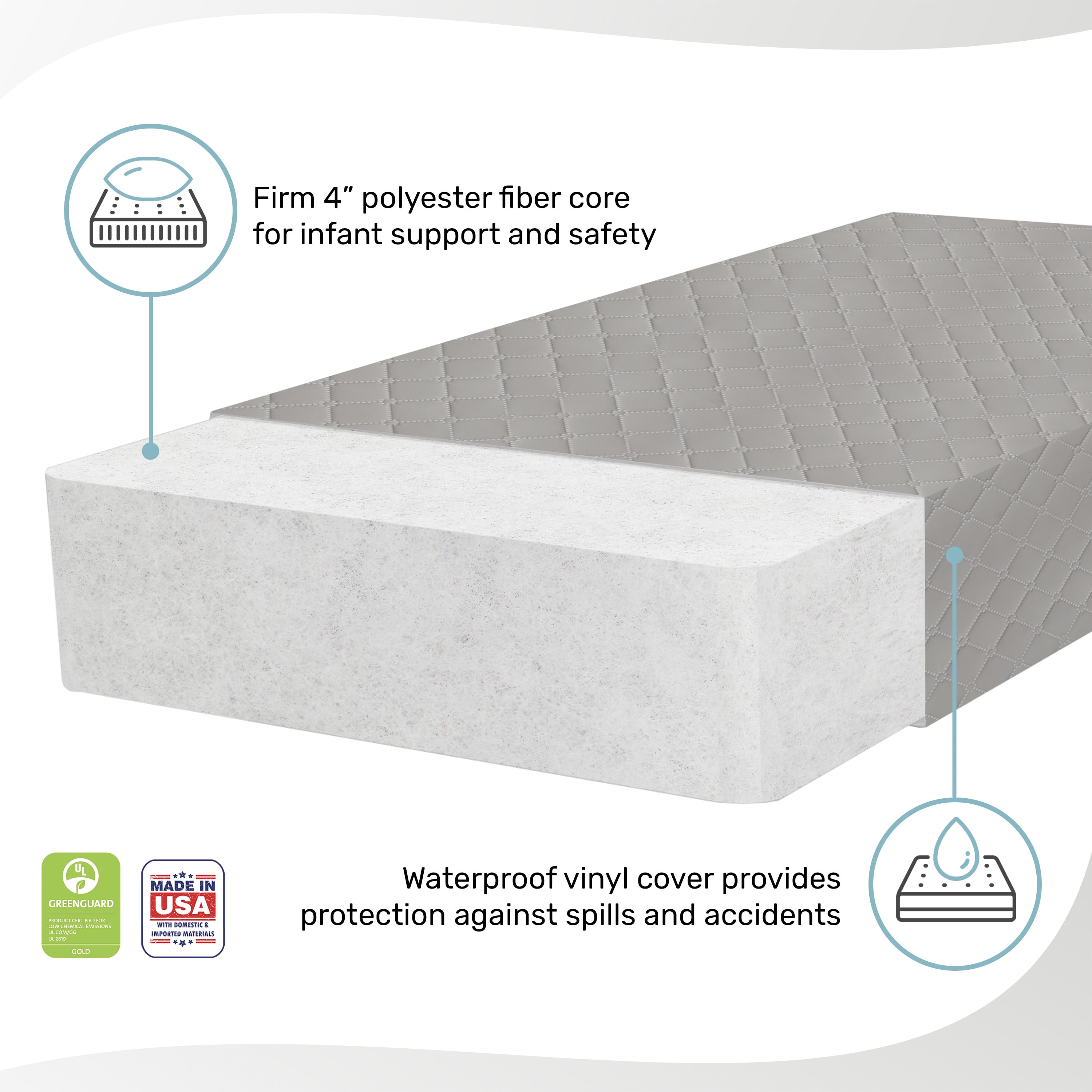 Dream On Me Asheville Firm Fiber Crib Mattress, Model #1A4-GREY provides added support that babies and toddlers need for good night. This mattress is built with a firm polyester 4”, a hypoallergenic, antibacterial, waterproof cover for a healthy sleep environment. Asheville Firm Fiber Crib Mattress, Model #1A4-GREY is durable, waterproof vinyl cover helps lock out stains and moisture keeping the mattress in top condition for long-lasting usage. All Dream On Me mattresses is constructed with quality materials.The Dream On Me Asheville Firm Fiber Crib Mattress, Model #1A4-GREY Meet the strictest standards offered by the GREENGUARD Certification, which recognizes products, contributing to improved indoor air quality.