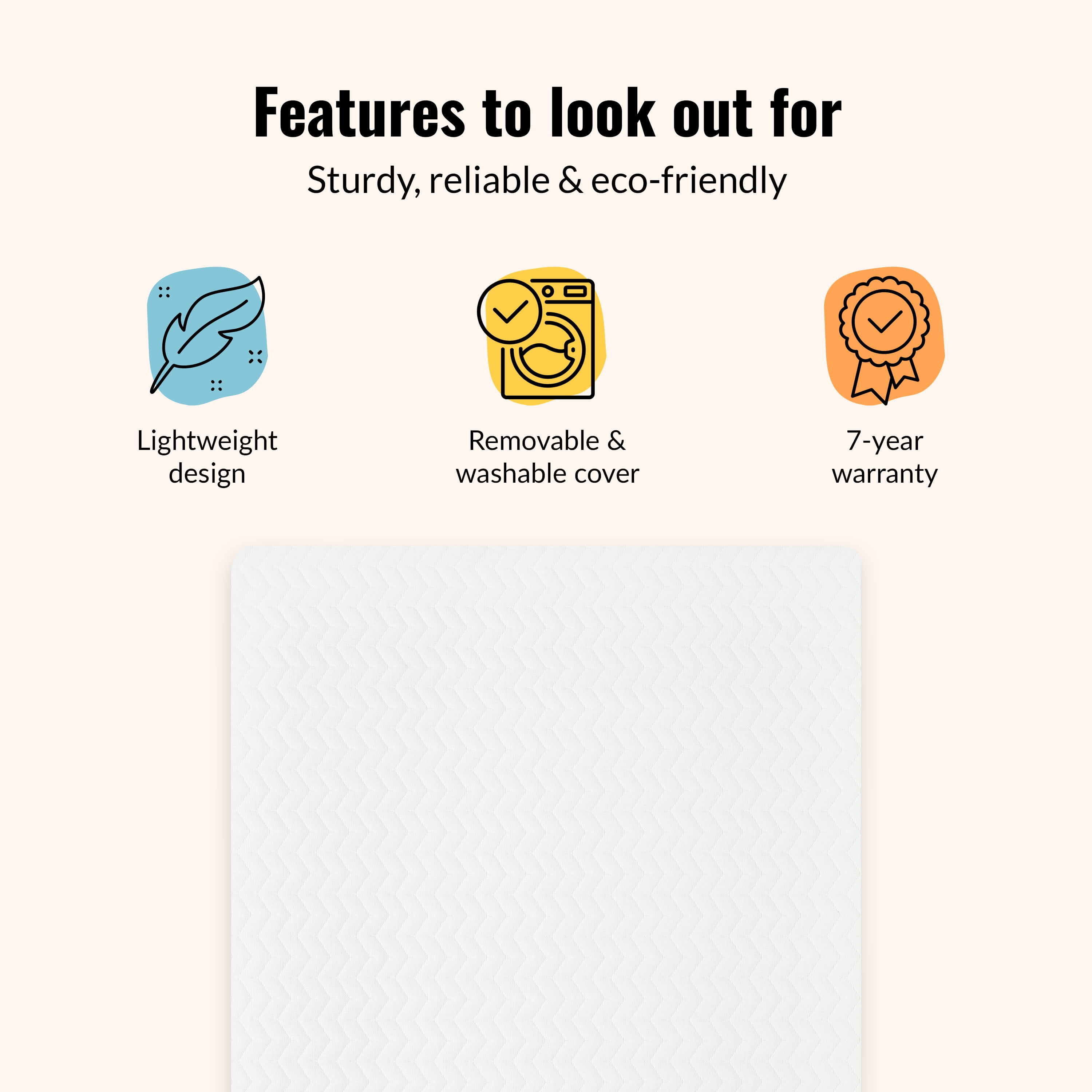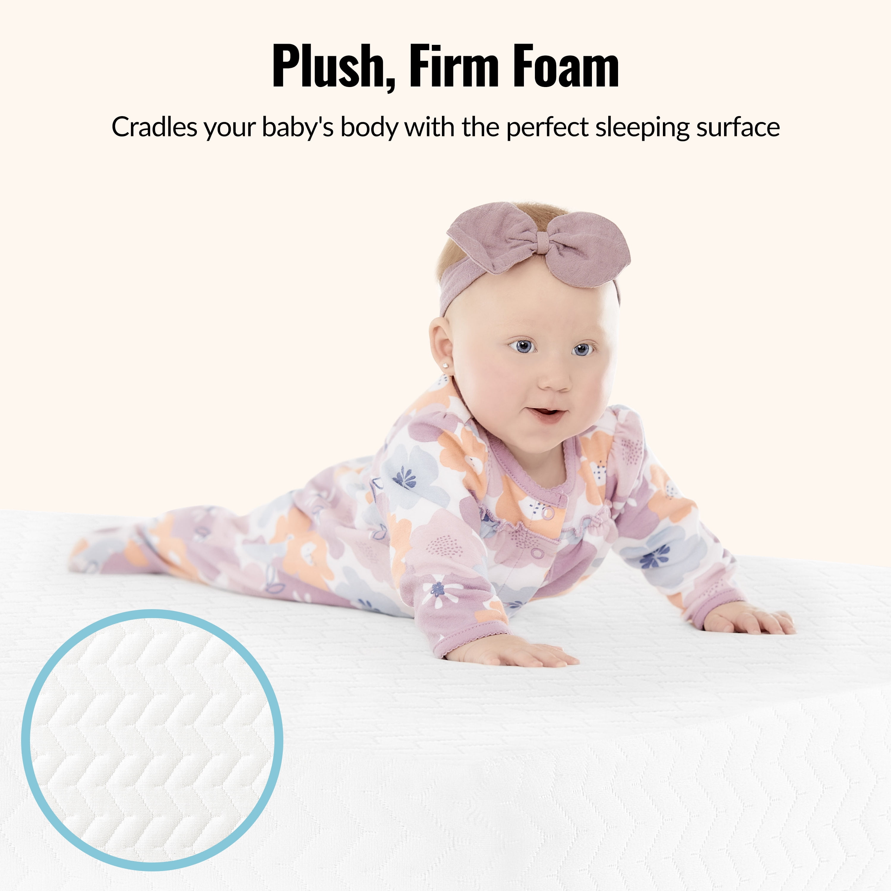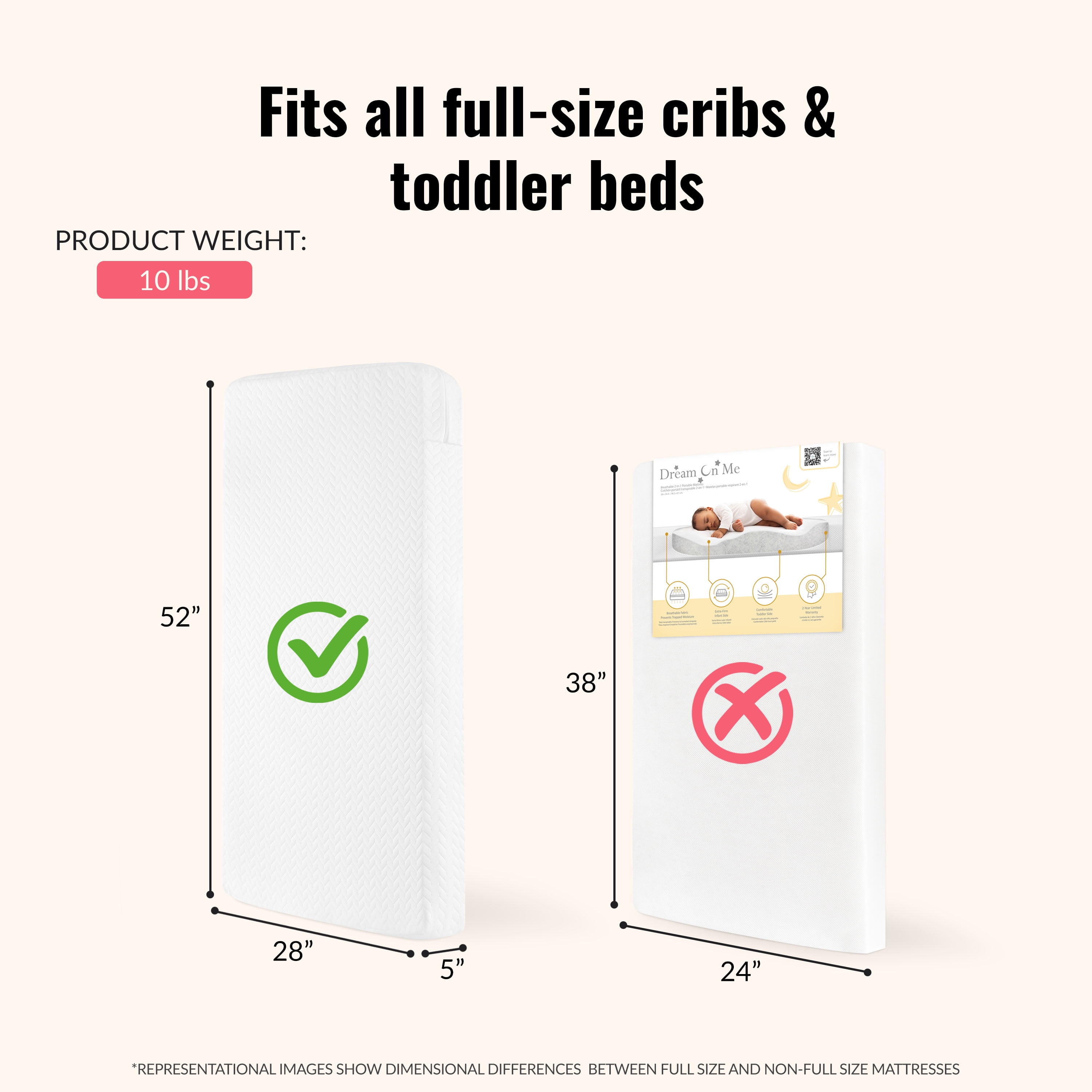 Dream On Me Baby Zzz 5″ Foam Crib & Toddler Bed Mattress: QUALITY BUILD: The Baby Zzz 5″ Mattress is plush yet firm breathable foam that fits a full-size crib & toddler bed. CONVENIENT & EASY TO CLEAN: The Mattress comes with a removable outer cover that’s machine washable. It’s also water-resistant & stain resistant. PRODUCT SPECS: 52″ L x 28″ W x 5″ H YOU-CONSCIOUS: The Mattress comes with a 7-Year Warranty. It has a flat surface without any incline. SAFETY-FIRST: The Baby Zzz Mattress comes in the recommended firmness for infants, is JPMA-certified, and is constructed of quality, fireproof fiber.