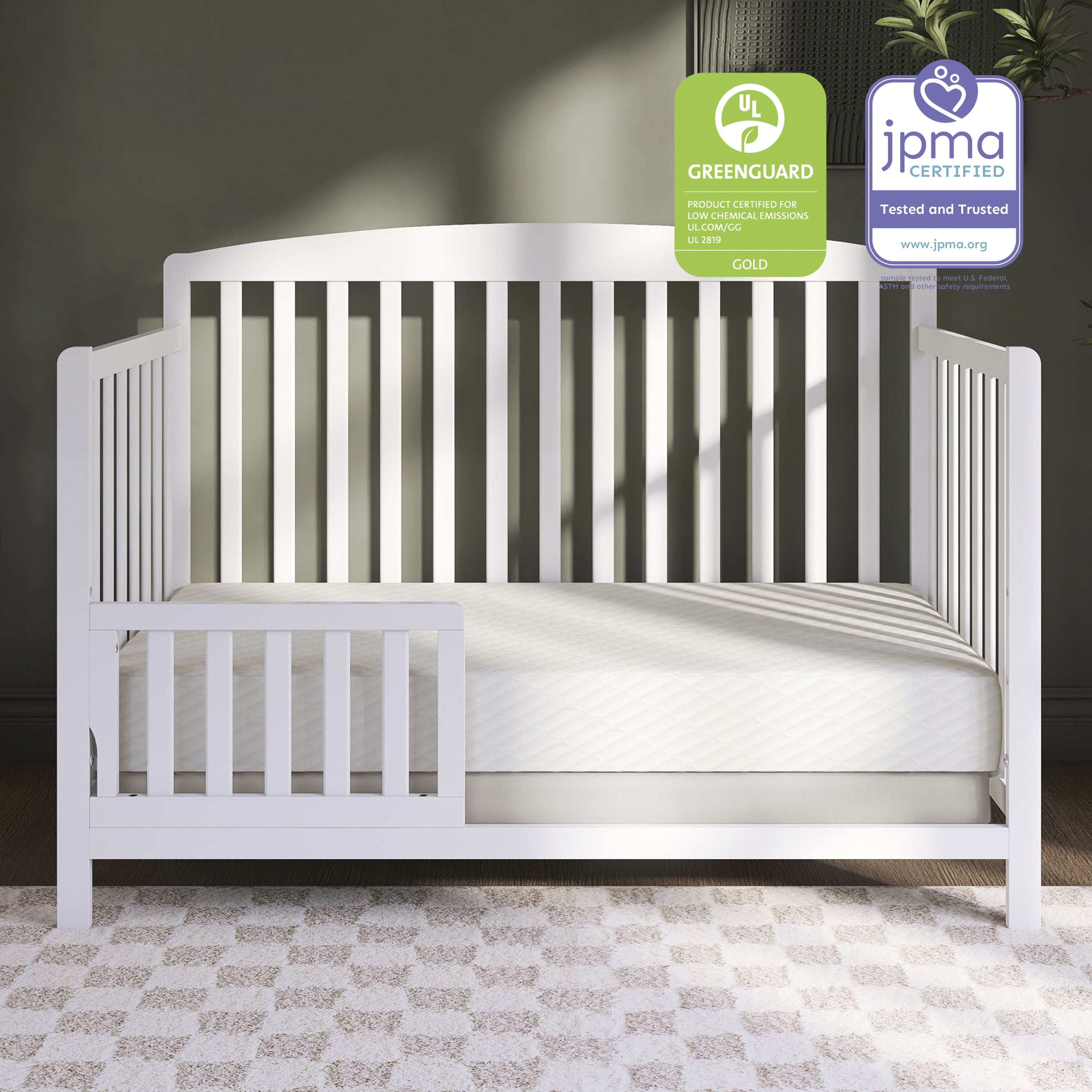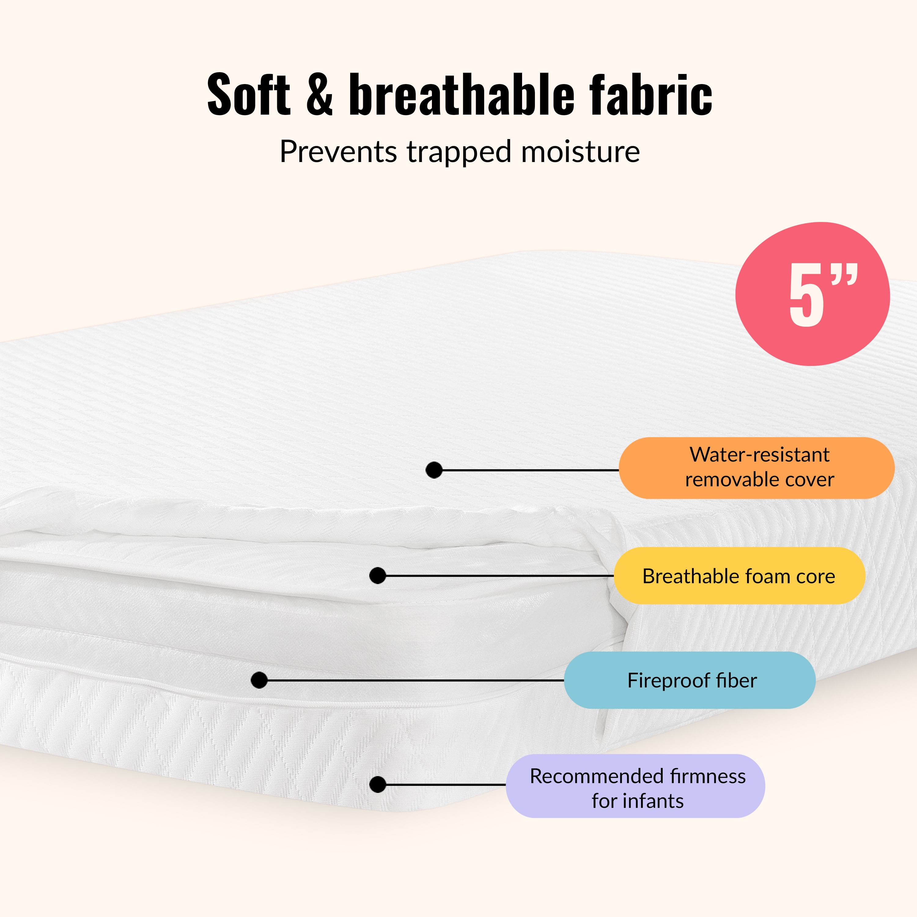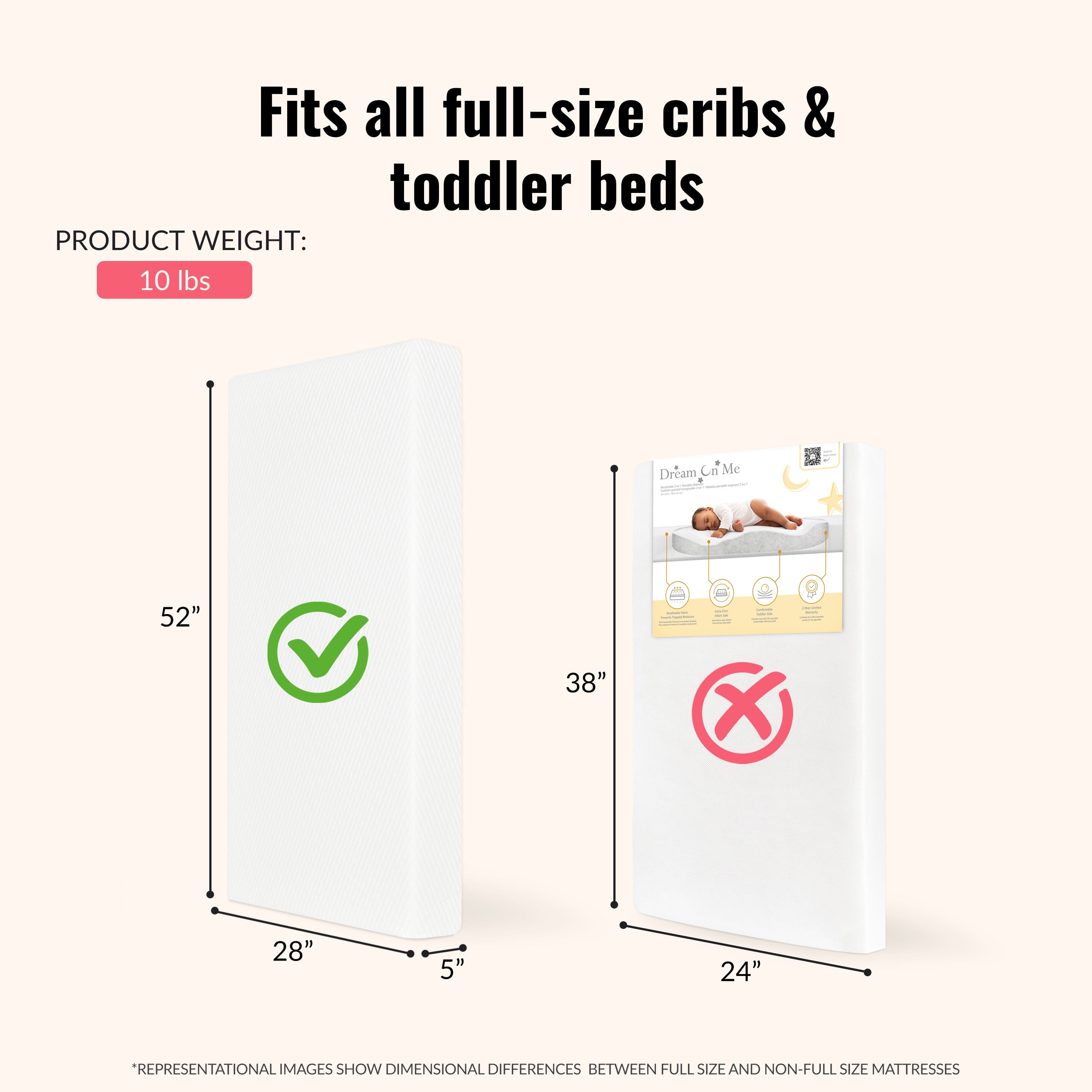 Dream On Me Baby Swan 5″ Foam Crib & Toddler Bed Mattress: QUALITY BUILD: The Baby Swan 5″ Mattress is made of plush yet firm breathable foam that fits a full-size crib & toddler bed. CONVENIENT & EASY TO CLEAN: The Mattress comes with a removable outer cover that’s machine washable. It’s also stain resistant. SAFETY-FIRST: The Baby Swan Mattress comes in the recommended firmness for infants, is JPMA-certified, and is constructed of quality, fireproof fiber. PRODUCT SPECIFICATIONS: 52″ L x 28″ W x 5″ H