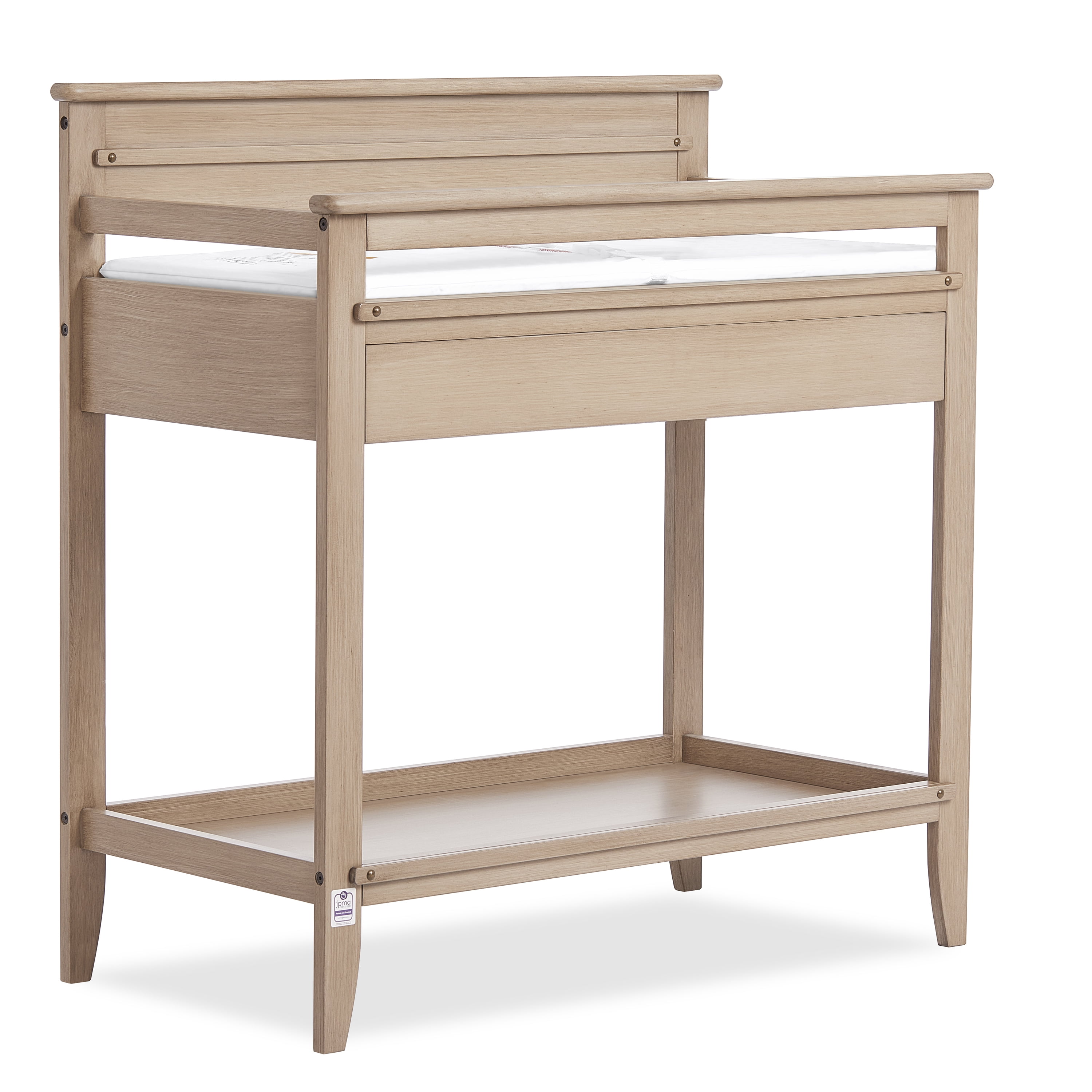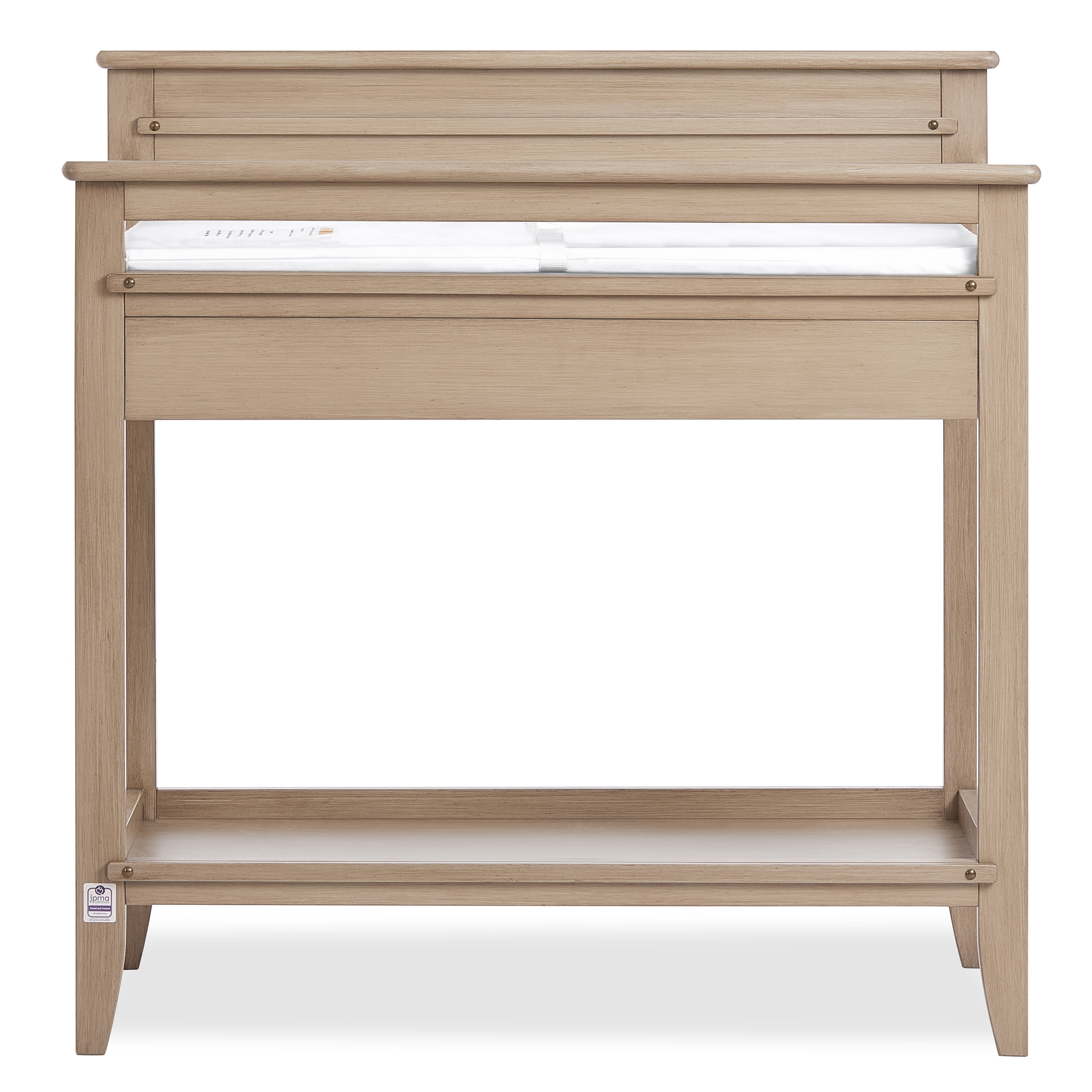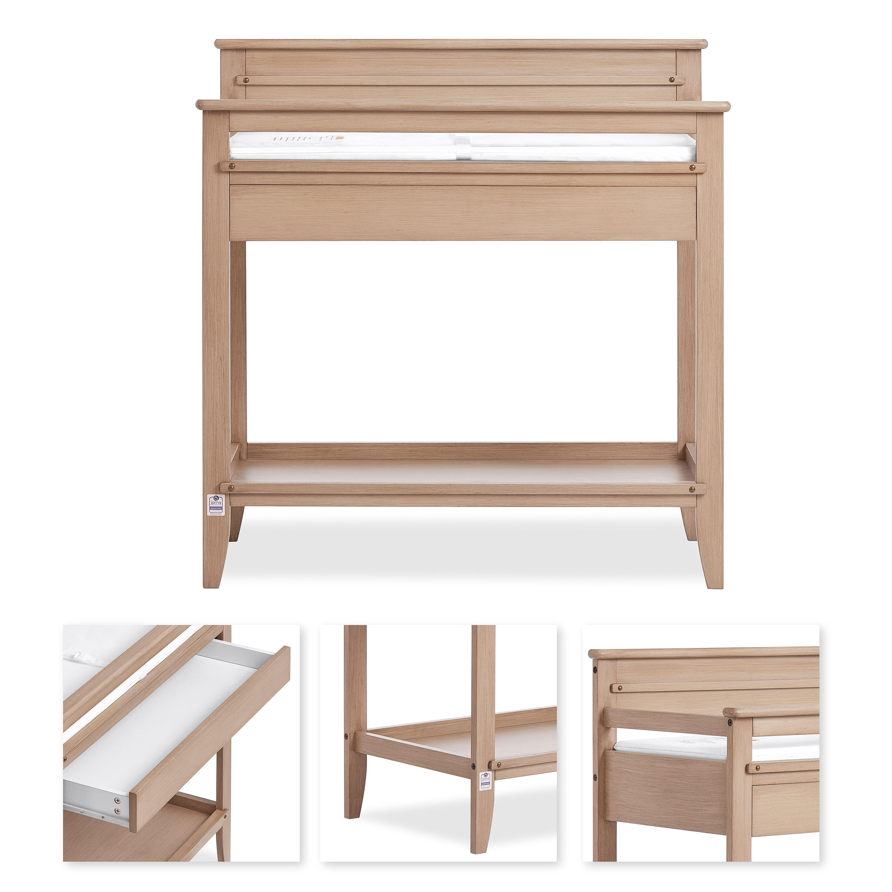 Keep your changing essentials organized with 2 open shelves for easy storage and access to all of your diapers, wipes, and creams. The Dream On Me Bayfield Changing Table is JPMA & Greenguard Gold certified Comes with a secure restraint harness for your little one and meets/exceeds ASTM & CPSC standards Made of sustainable New Zealand pinewood Easy-to-assemble changing table comes with a 1” thick, water-resistant mattress pad and is easy to spot or wipe clean. This solid changing table comes in 2 charming, non-toxic finishes – Glazed Brush White & Sand Dunes Product dimensions are 38.4 L x 19.7W x 39.5H, with a weight of 44 Lbs