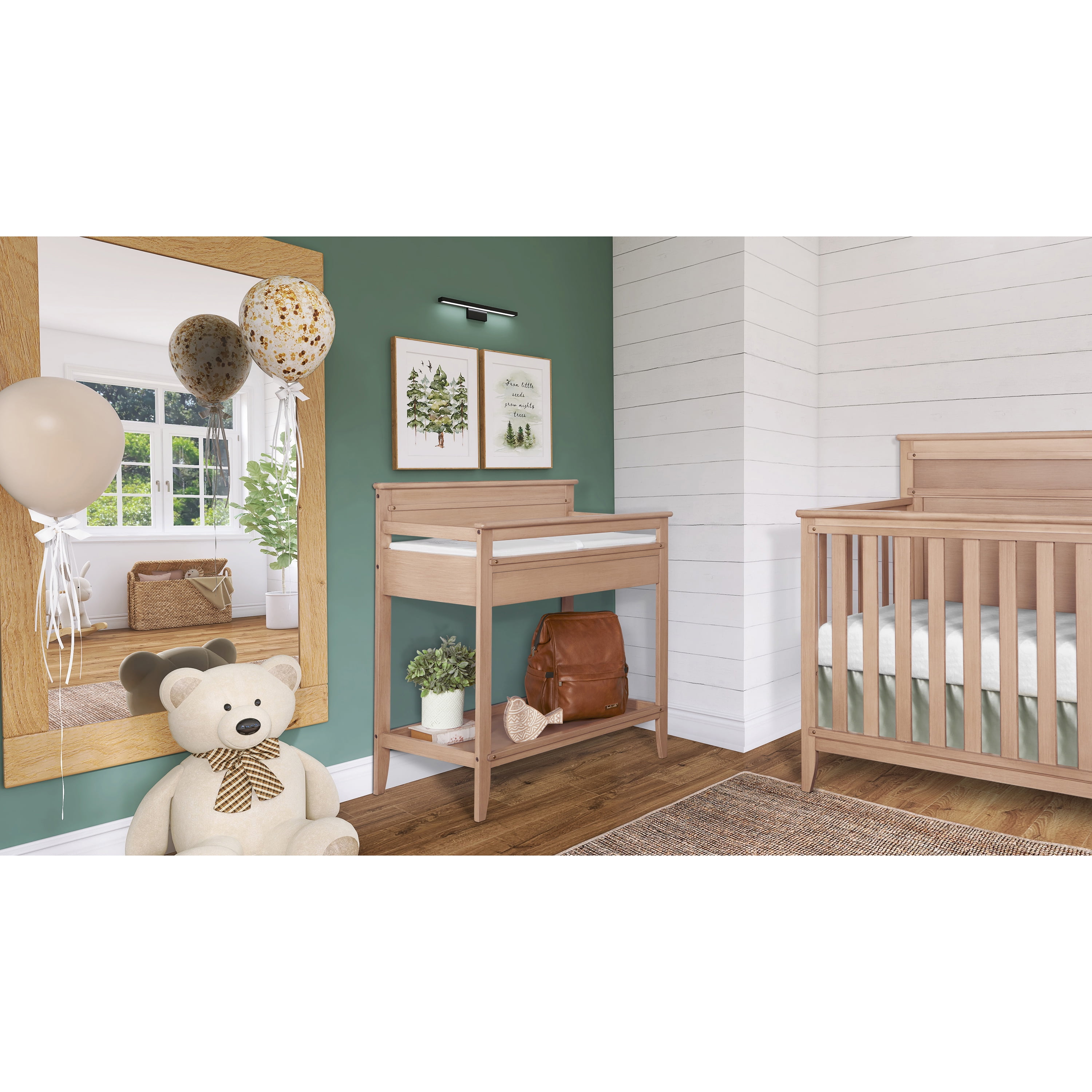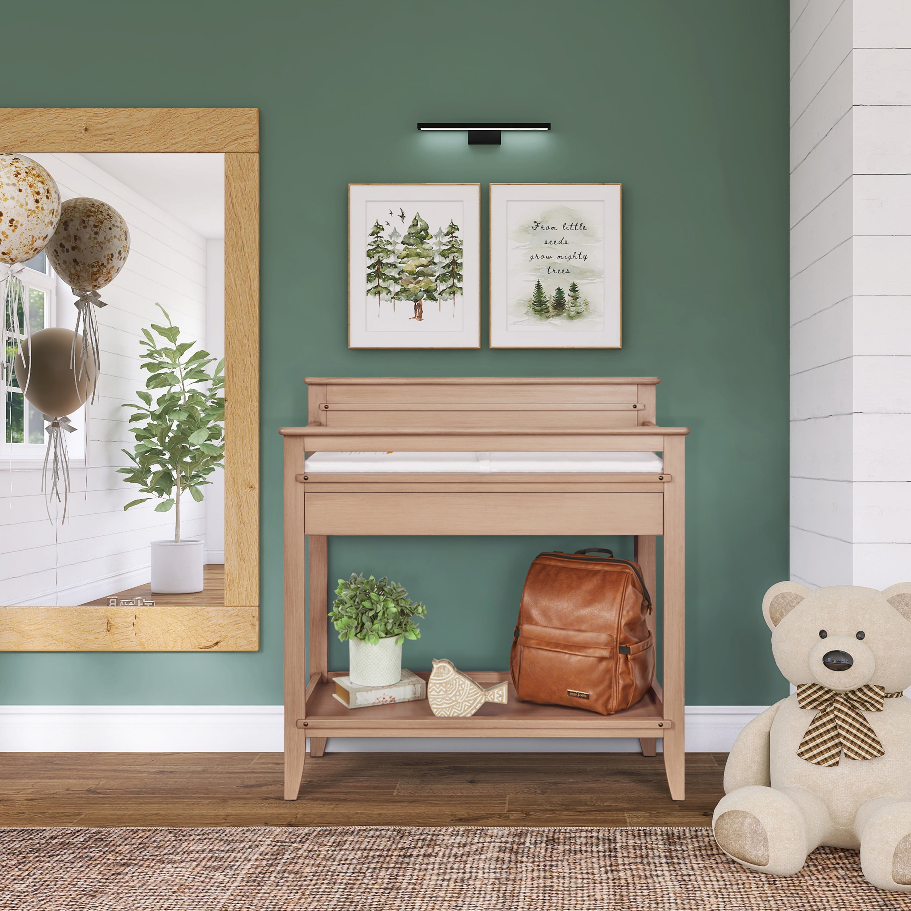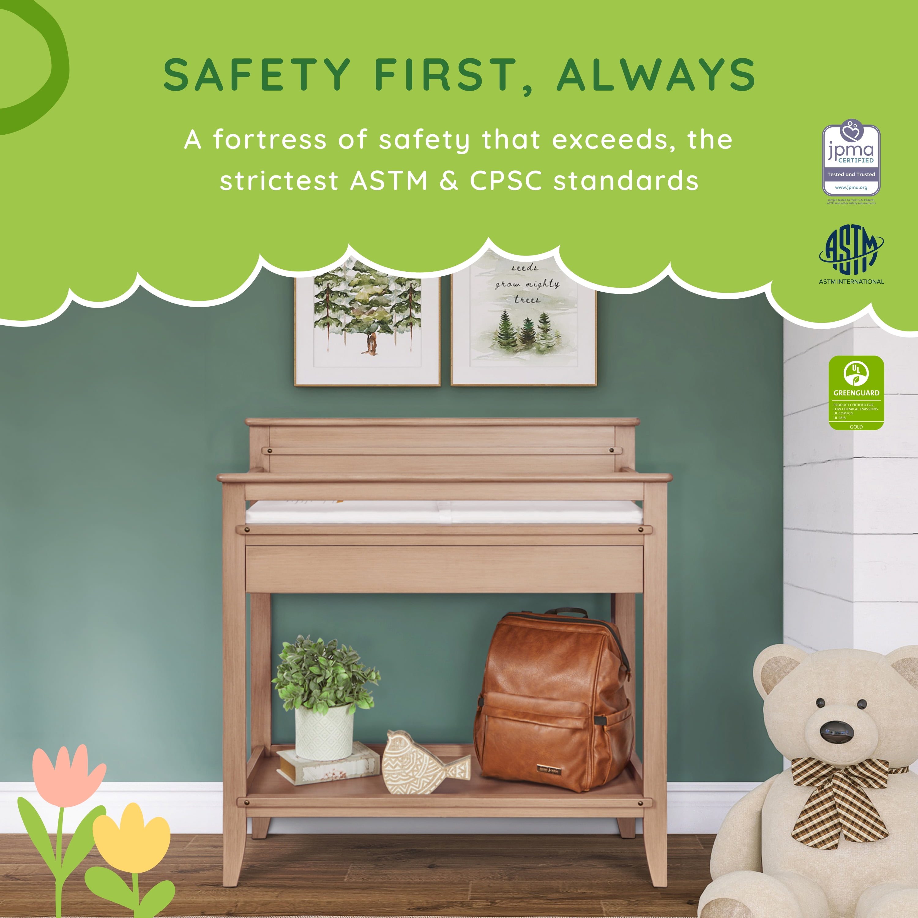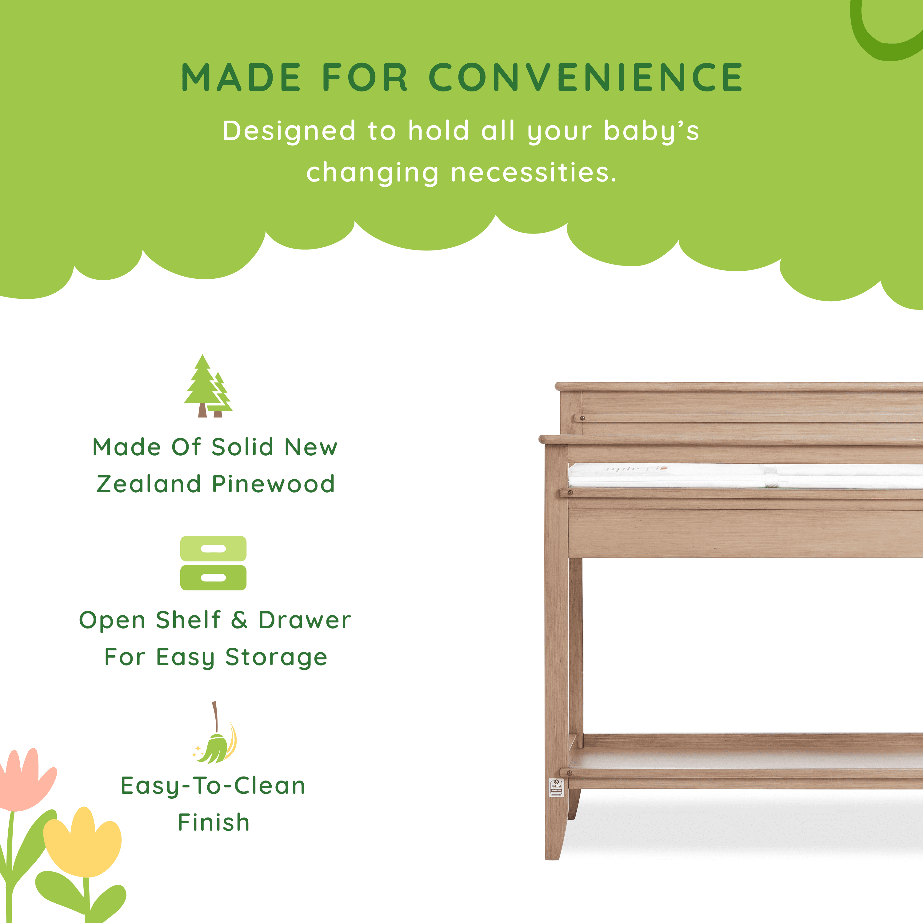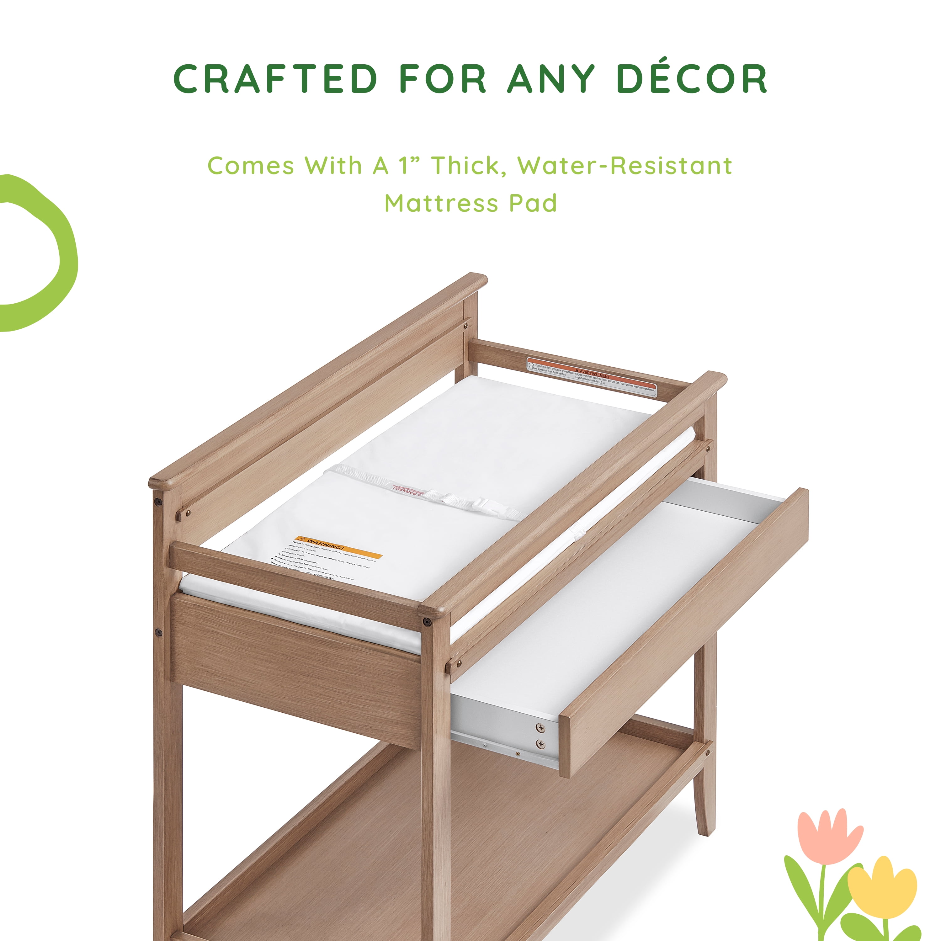 Functional, elegant & crafted to match perfectly with your baby’s nursery – say hello to the Bayfield Changing Table from Dream On Me. Keep your changing essentials organized as you comfortably change and cradle your little one with this sturdy changing table. Made of sustainable New Zealand Pinewood, the Dream On Me Bayfield Changing Table comes with 2 open shelves for easy storage and access to all of your diapers, wipes, and creams. Keeping in mind your convenience, this easy-to-assemble changing table comes with a 1” thick, water-resistant mattress pad and is easy to spot or wipe clean. What’s more, the safety-conscious Dream On Me Bayfield Changing Table is not only JPMA & Greenguard Gold certified, but also comes with a secure restraint harness for your little one and meets/exceeds ASTM & CPSC standards. A must-have in your nursery, this solid changing table comes in 2 charming, non-toxic finishes – Glazed Brush White & Sand Dunes. Product dimensions are 38.4 L x 19.7 W x 39.5H, with a weight of 44 Lbs and a maximum weight limit of 30 Lbs.