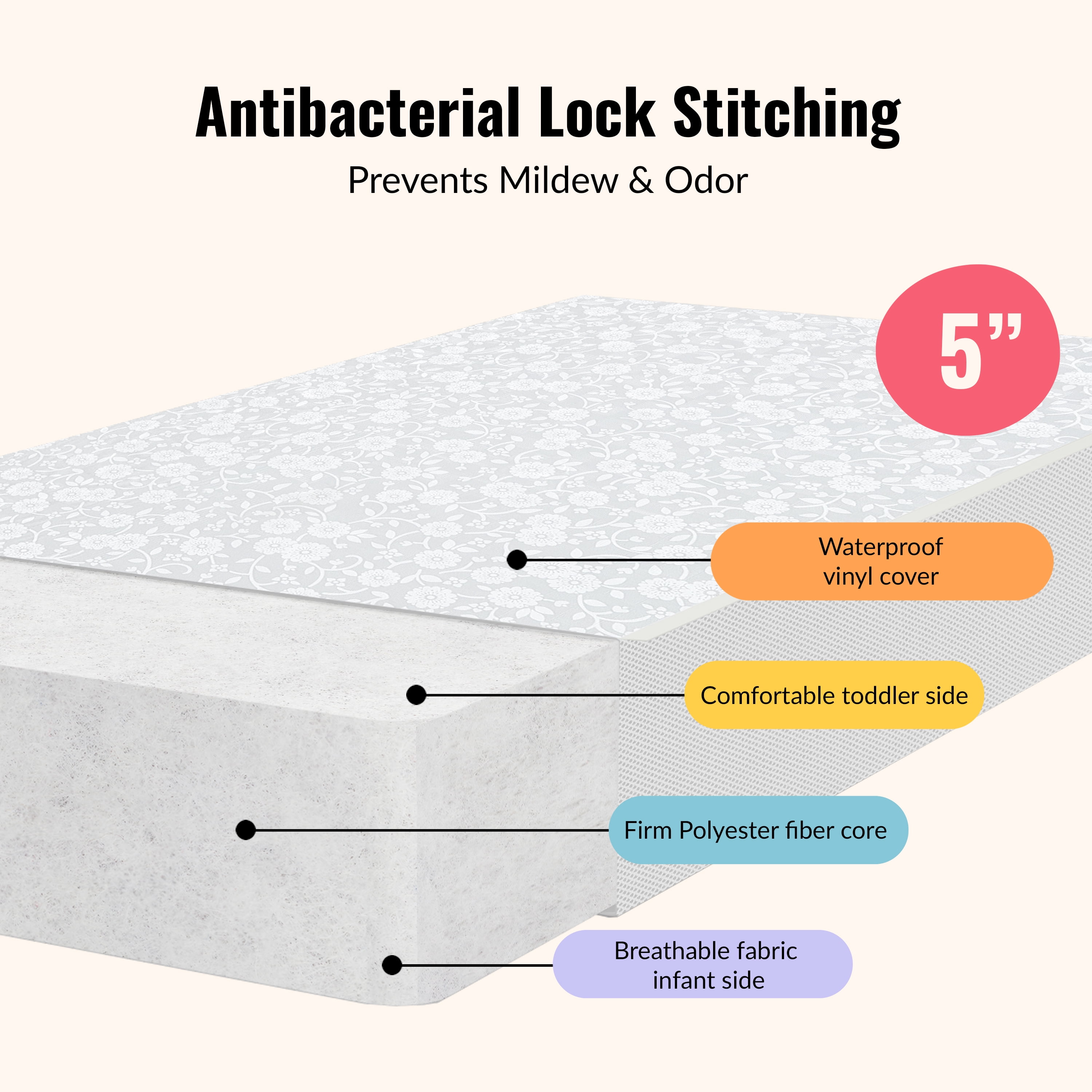 Dream On Me, Breathable Orthopedic Extra Firm Crib Mattress- features a 5“ core for your baby comfort which includes a breathe flow technology. The hypoallergenic, antibacterial, CertiPUR-US certified layers mattress is covered with a breath-flow material on the infant side and a waterproof cover on the toddler side with lock stitch seams. Dream On Me mattress meets the Federal Flammability Standard ,rest easy knowing this mattress is tested for phthalate and lead and constructed with quality materials and workmanship