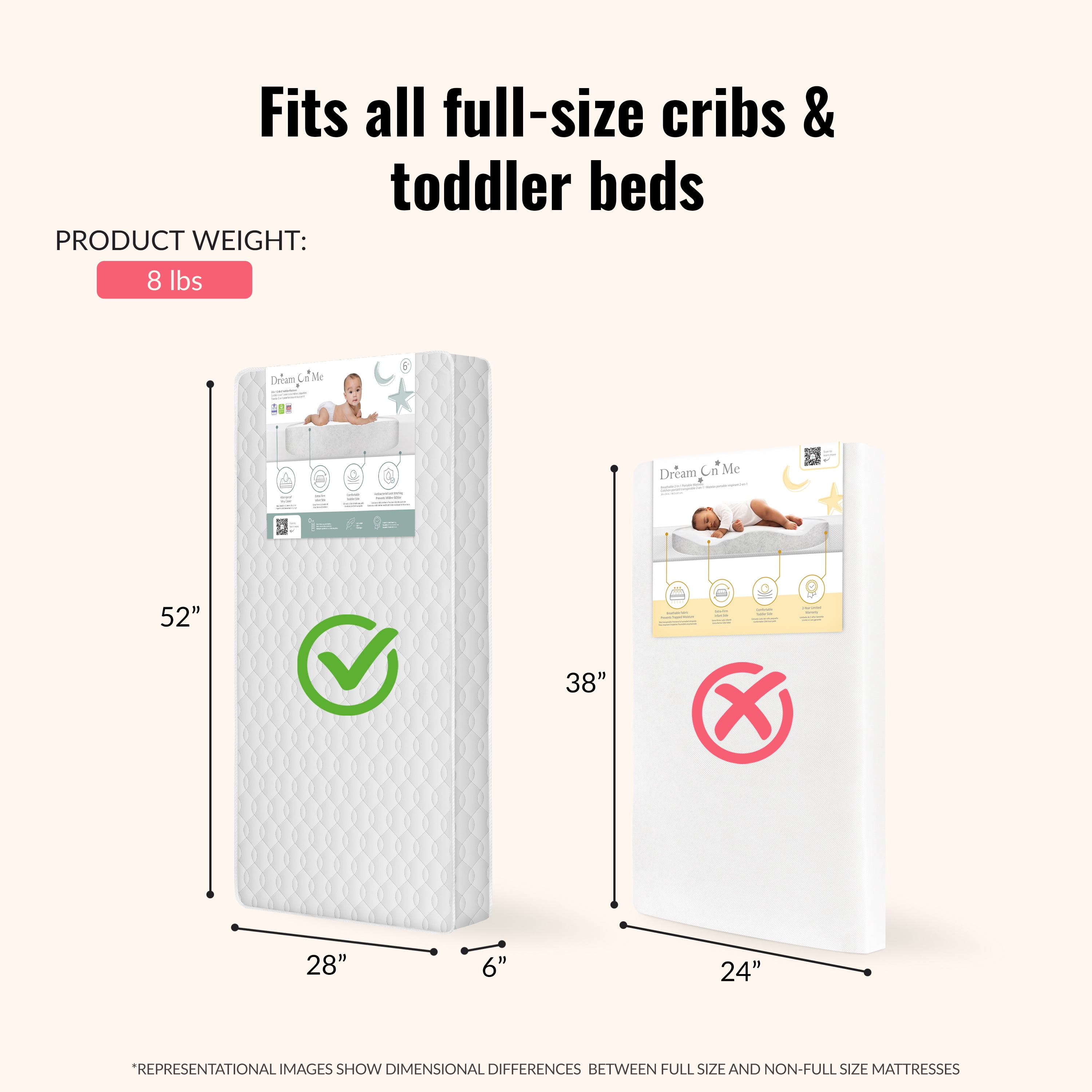 Dream On Me Carousel 6″ Full-Size Firm Foam Crib and Toddler Bed Mattress: Antibacterial, waterproof lock stitched binding helps prevent mold, mildew, and odor from seeping inside like cotton binding allows Airflow pocket helps keep crib mattress fresh without the use of small metal vents Reinforced waterproof cover and binding resist liquids and stains Fits all standard size cribs and toddler beds for years of use Wipe clean with mild soap and warm water Dimensions: 52″ x 27″ x 6″ Thickness: 5″ Reversible design allows mothers to choose a brown cloud print or a white side Flip and rotate mattress every 2-3 months Safety advice: Please ensure mattress covers or fitted sheets are not too tight or loose over a crib mattress to practice safe sleeping Passes all Flammability tests (16 CFR 1632 /1633) without the use of flame retardants and also pass phthalate, lead, and toxicity tests All Dream On Me mattresses are GREENGUARD Gold Certified for a healthy indoor environment for your baby JPMA is certified to meet or exceed all safety standards set by the CPSC and ASTM.