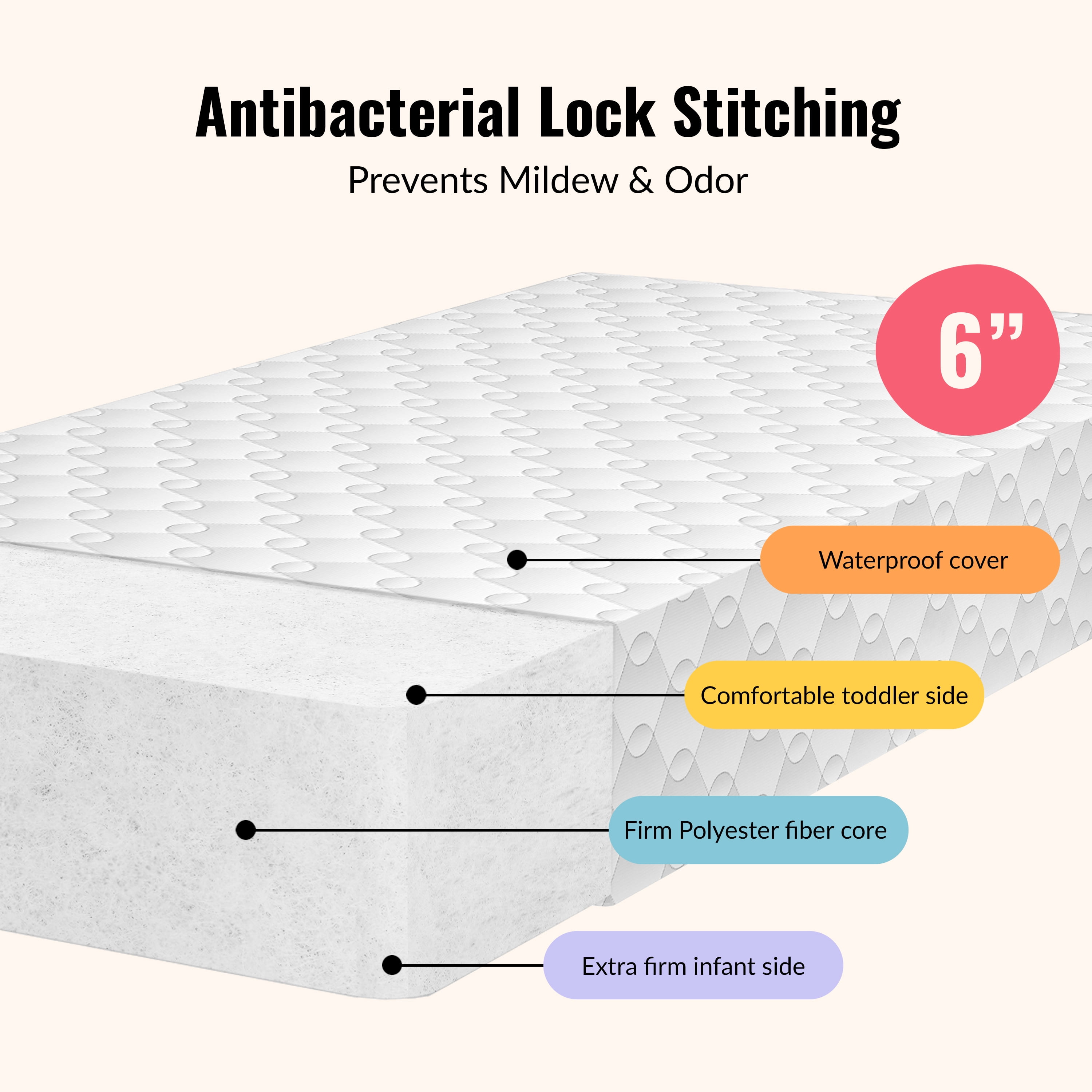 The Dream On Me Firm Foam Crib and Toddler bed mattress is the answer to your baby’s restful sleep. With six inches of firm foam at its core, this mattress is constructed of flame retardant, antibacterial, hypoallergenic quality materials that aids in the prevention of mold, mildew, and odor. Its waterproof cover wipes clean with warm water and mild soap. Lead and phthalate tested; this mattress passes the Federal Standard Flammability Standard 16 CFR 1633.