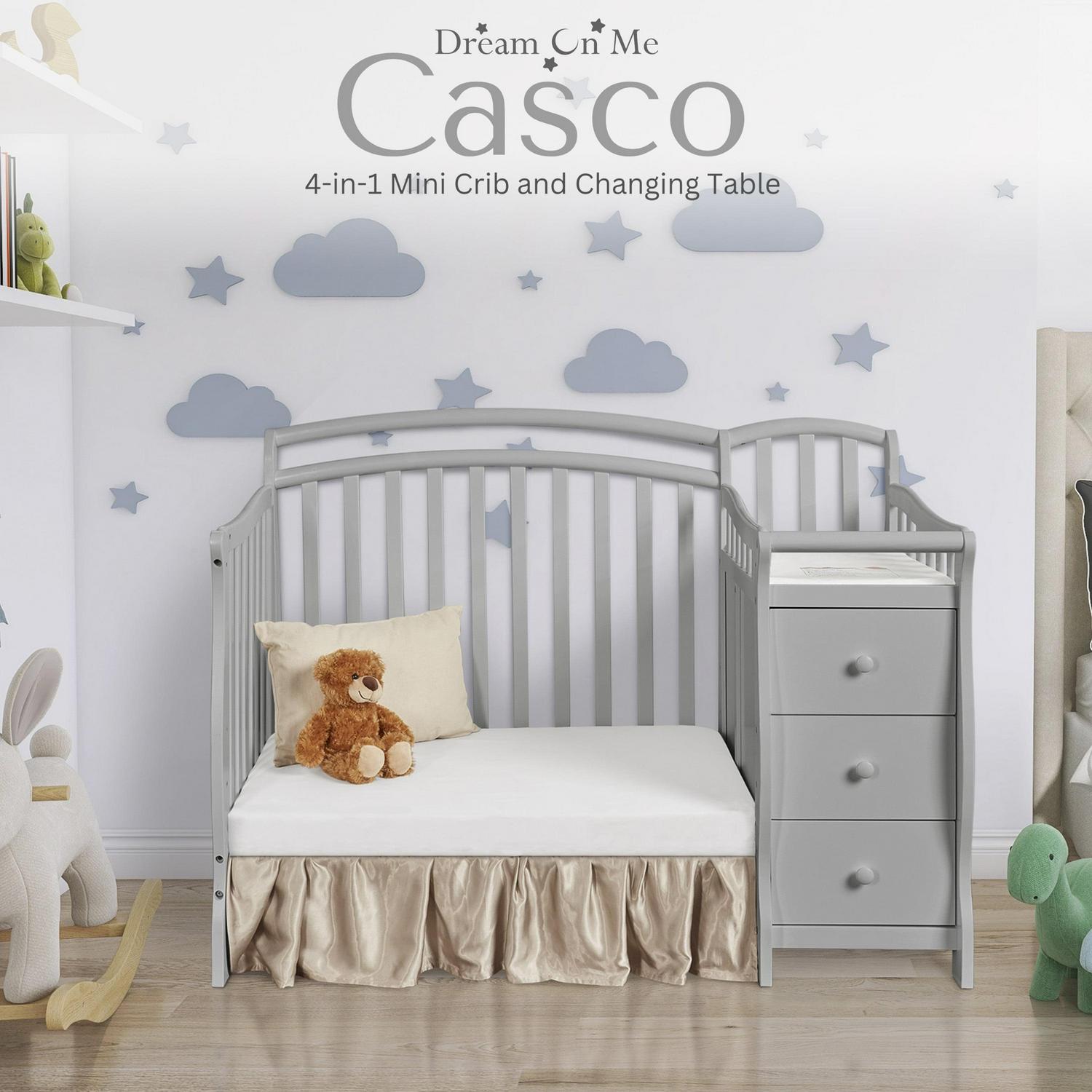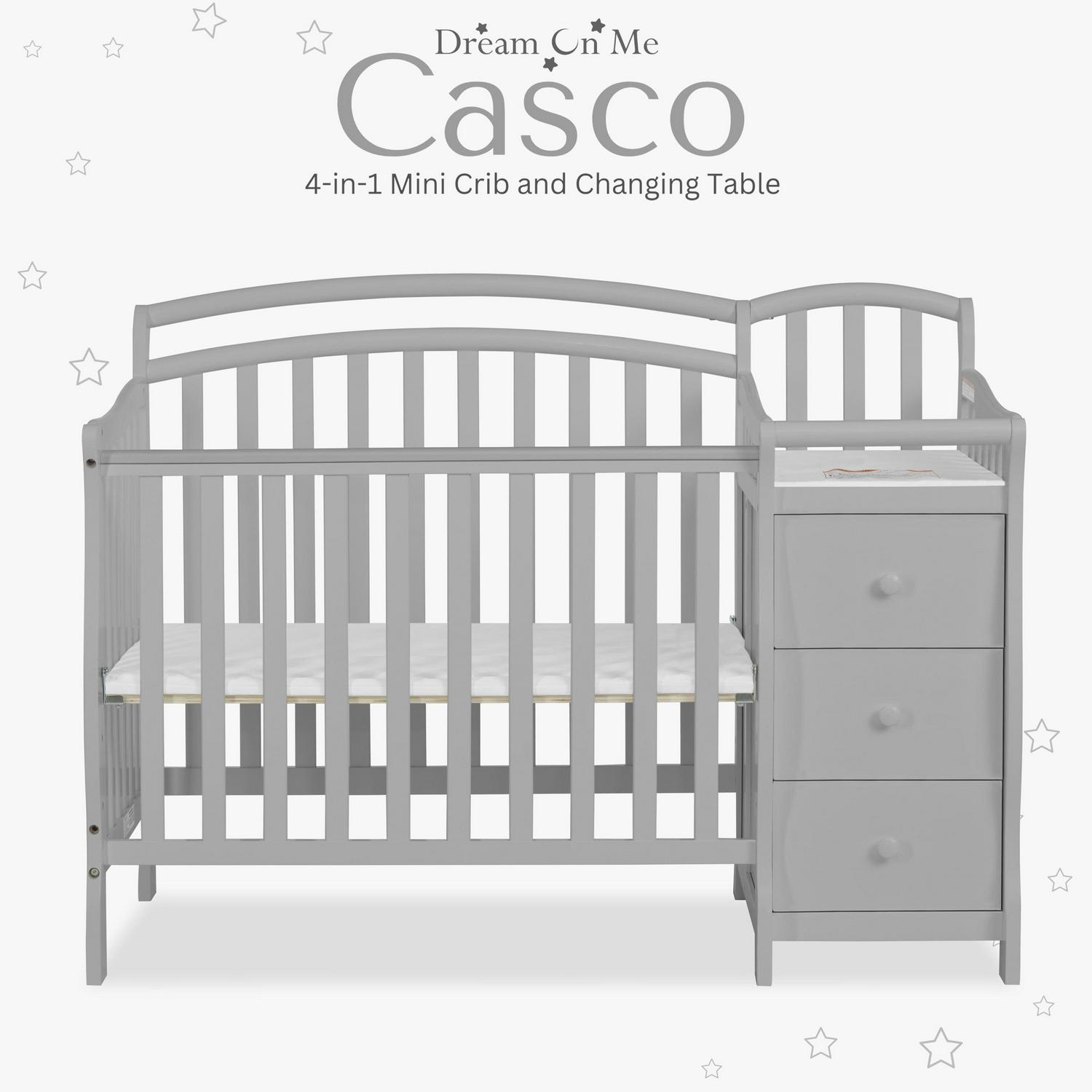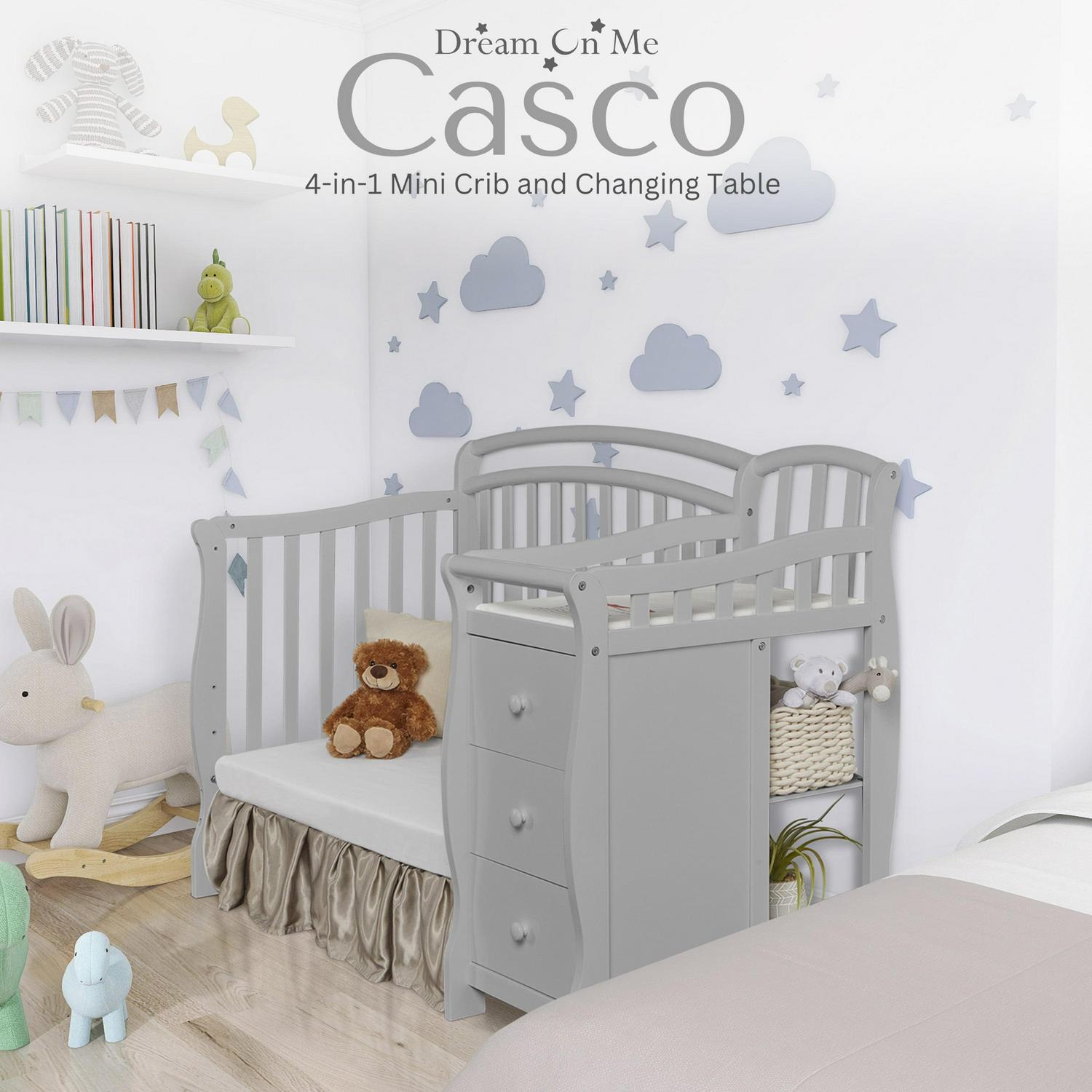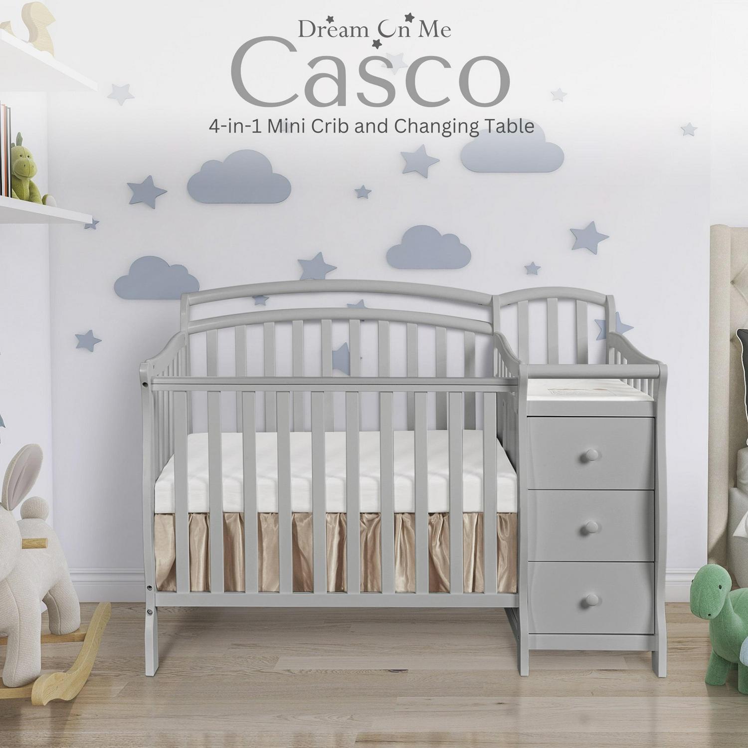 The Dream On Me Casco 4-in-1 Mini Crib & Dressing Table Combo marries style with functionality. It keeps pace with your growing child as it converts it from a mini crib to mini daybed and twin-size bed (bed rails sold separately). It also features a three-drawer changing table. This blend of compact size and utility makes it ideal for smaller spaces. The changing table is equipped with a changing pad and security strap that keep baby safe. Keep baby essentials handy and organized in 3 spacious drawers! Built of New Zealand pinewood, its minimalist design features gentle, smooth arches & sturdy spade feet. It comes in five striking finishes allowing it to blend beautifully with any nursery or growing child s room. It also has a convenient 3-position, adjustable mattress support system. Our mini cribs come with the regulatory one inch mattress pad and we recommend the Dream On Me non-toxic, Greenguard Gold certified mini or portable crib mattress for the perfect fit. All tools/assembly instructions included. All our cribs are designed with a focus on safety, are JPMA certified and meet all applicable ASTM/CPSC standards. Product dimensions are 56.8Lx29Wx41H inches, maximum weight limit is 50 lbs.