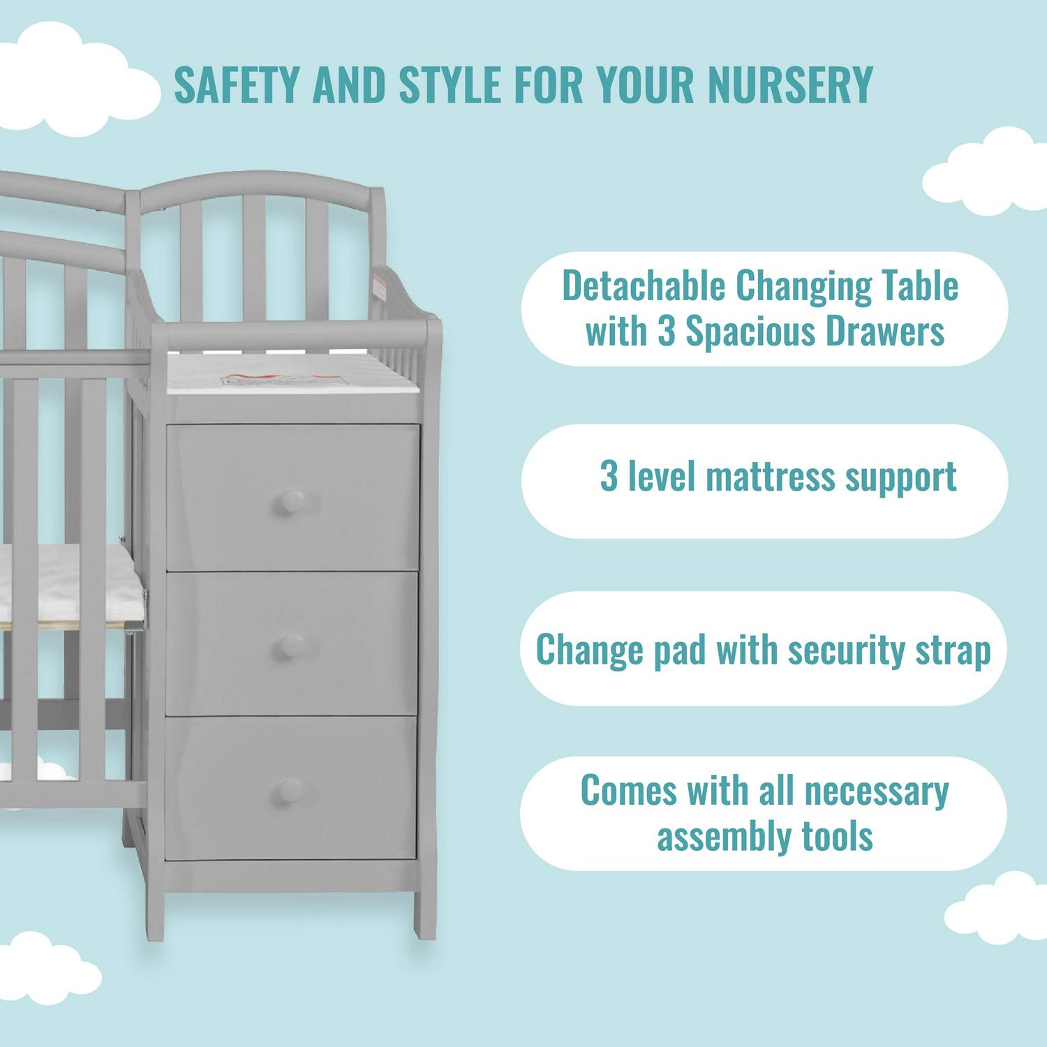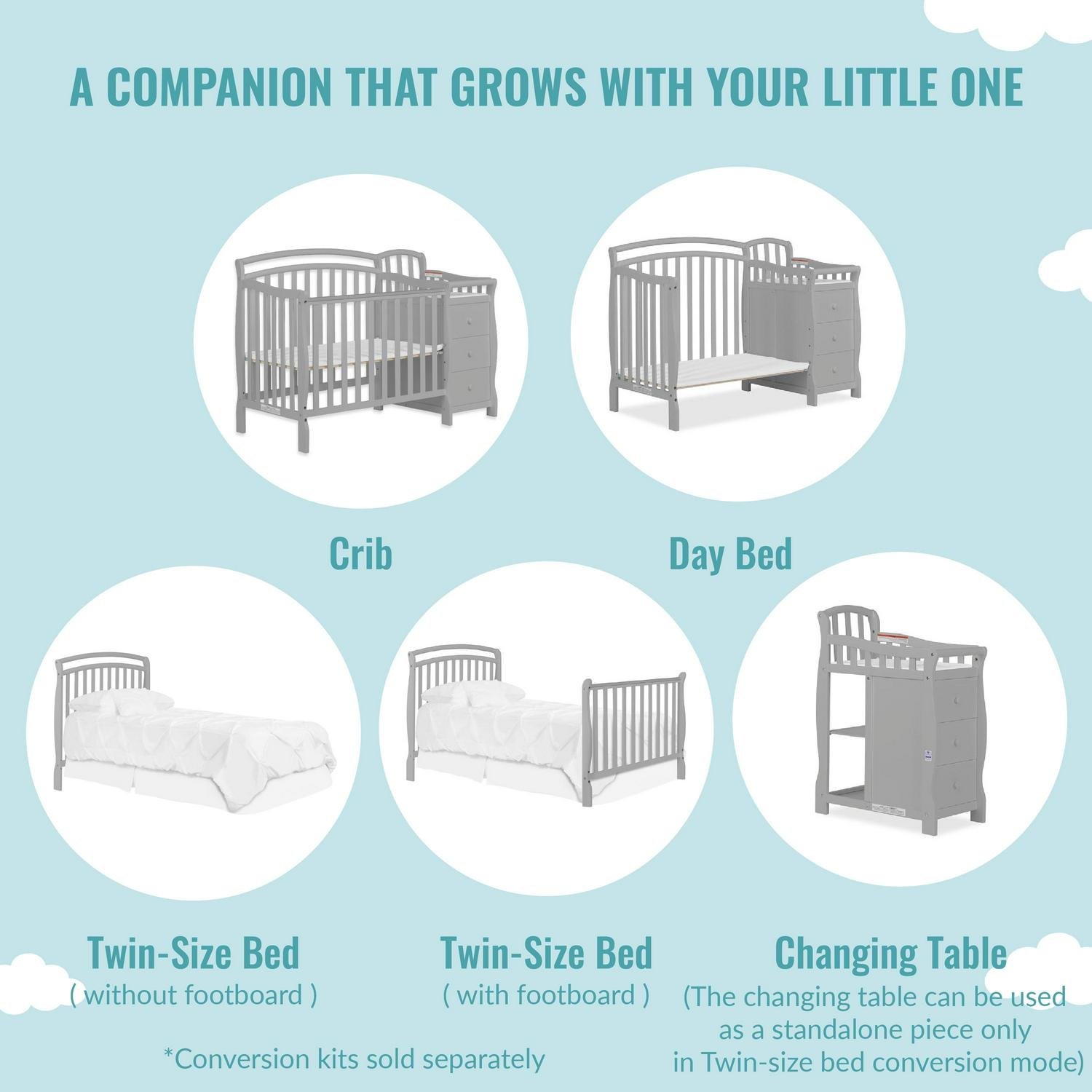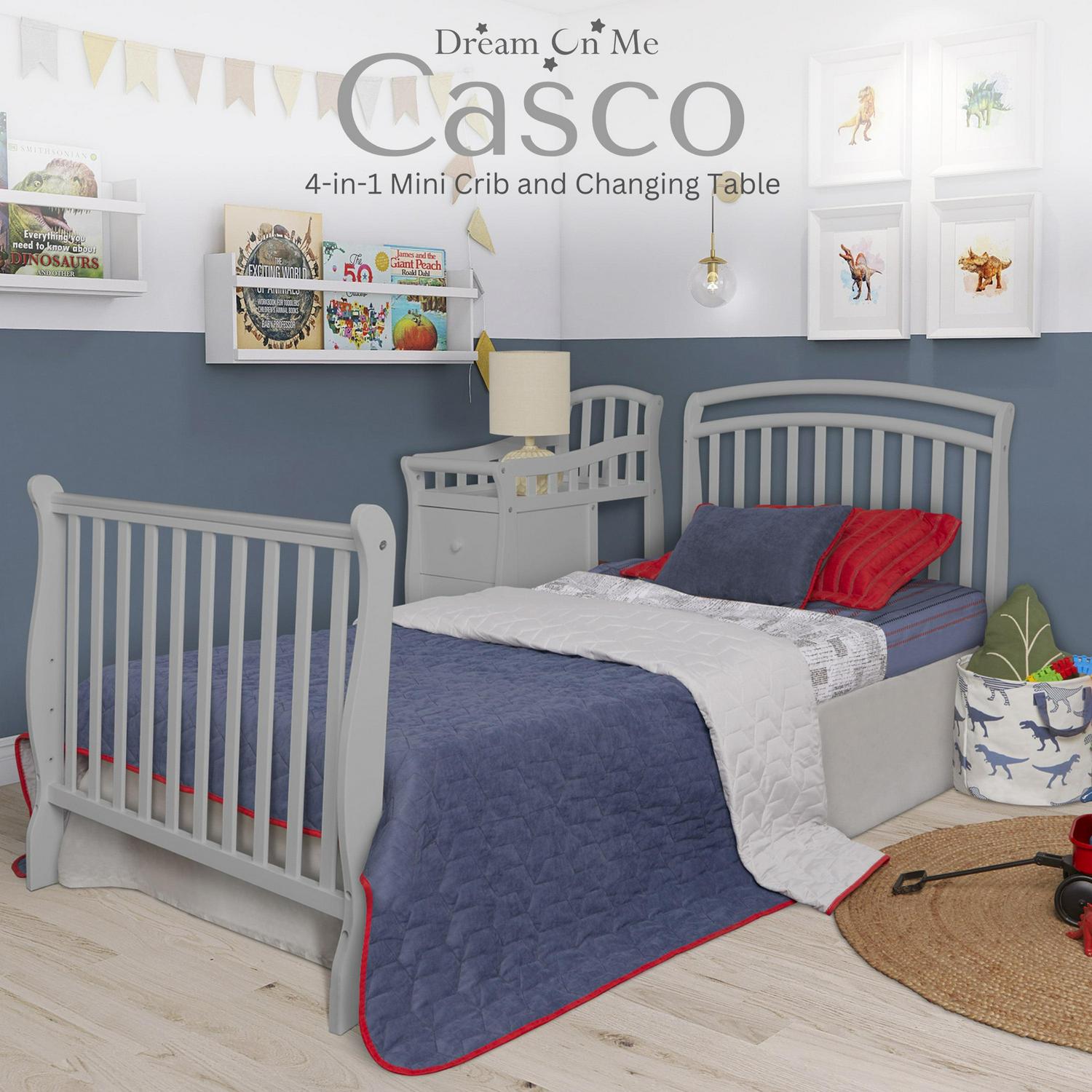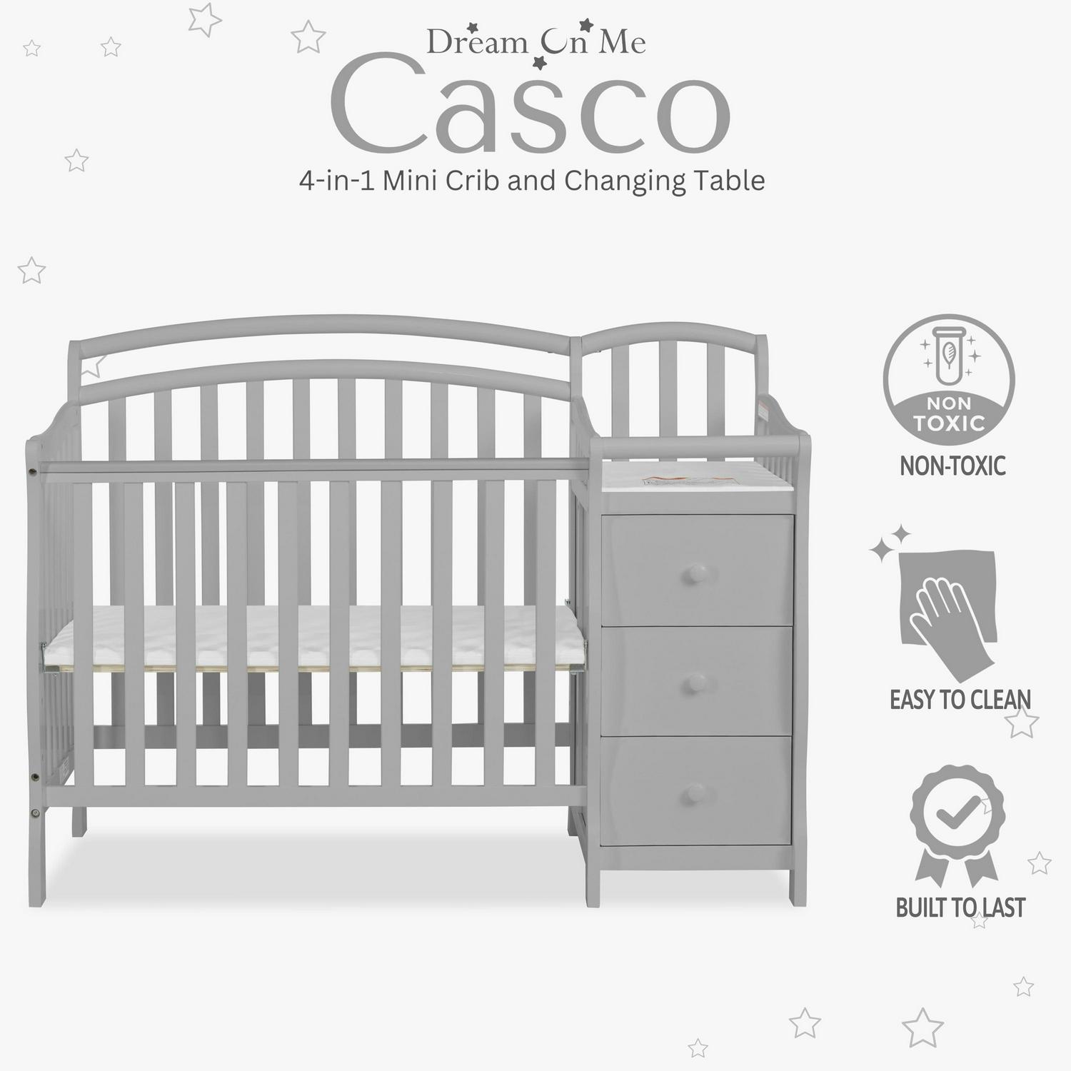 The Dream On Me Casco 4-in-1 Mini Crib & Dressing Table Combo marries style with functionality. It keeps pace with your growing child as it converts it from a mini crib to mini daybed and twin-size bed (bed rails sold separately). It also features a three-drawer changing table. This blend of compact size and utility makes it ideal for smaller spaces. The changing table is equipped with a changing pad and security strap that keep baby safe. Keep baby essentials handy and organized in 3 spacious drawers! Built of New Zealand pinewood, its minimalist design features gentle, smooth arches & sturdy spade feet. It comes in five striking finishes allowing it to blend beautifully with any nursery or growing child s room. It also has a convenient 3-position, adjustable mattress support system. Our mini cribs come with the regulatory one inch mattress pad and we recommend the Dream On Me non-toxic, Greenguard Gold certified mini or portable crib mattress for the perfect fit. All tools/assembly instructions included. All our cribs are designed with a focus on safety, are JPMA certified and meet all applicable ASTM/CPSC standards. Product dimensions are 56.8Lx29Wx41H inches, maximum weight limit is 50 lbs.