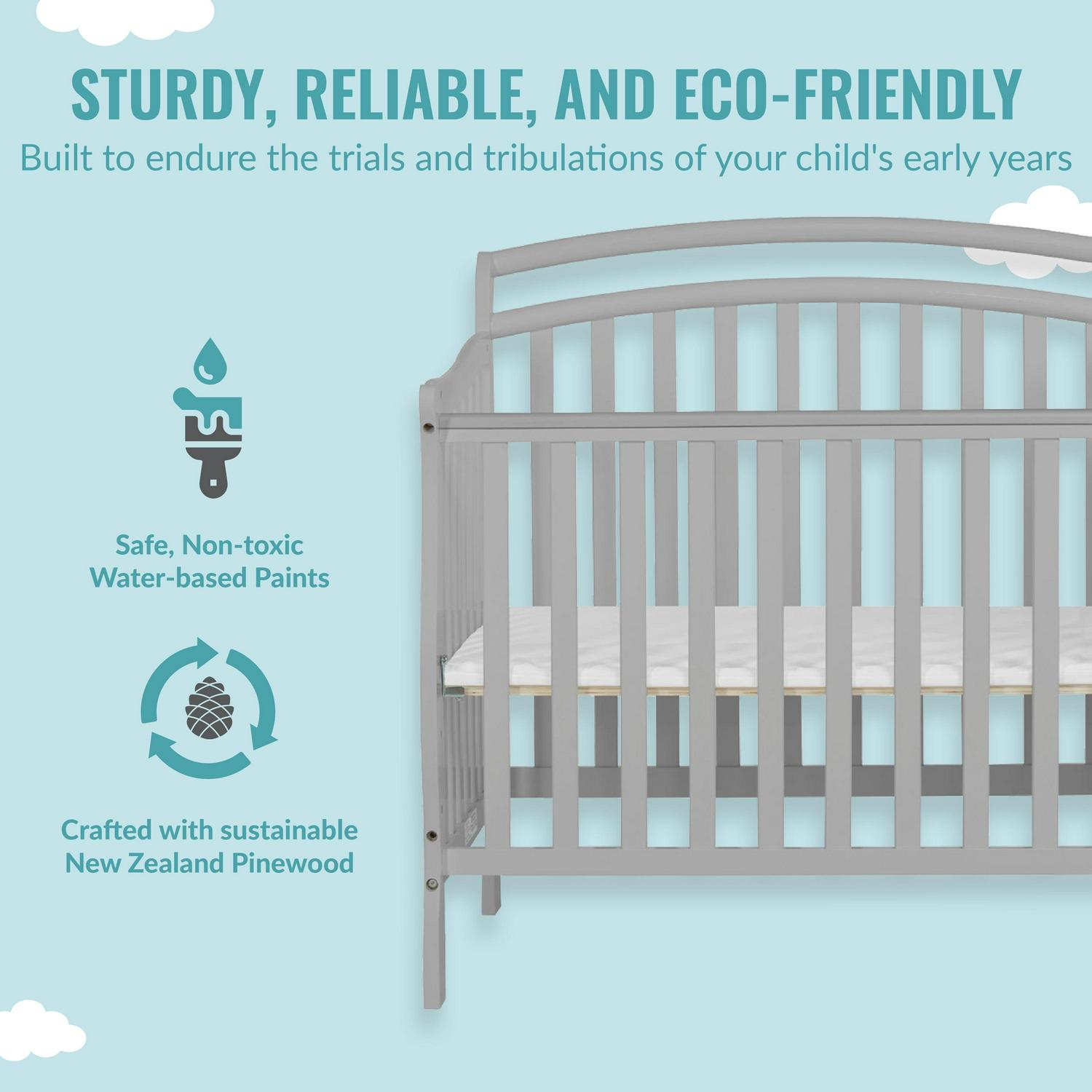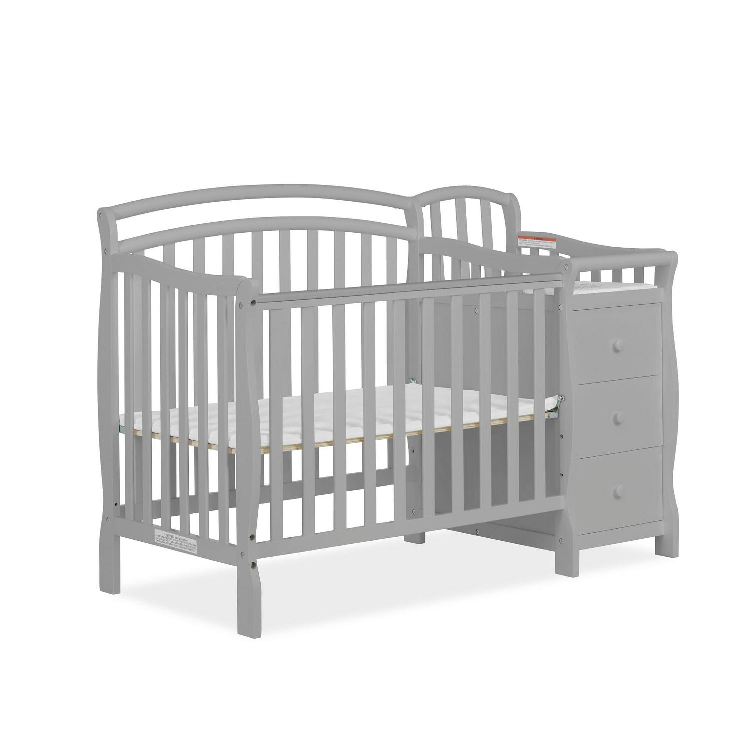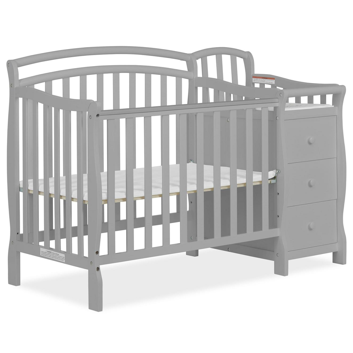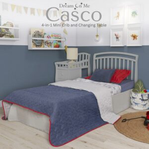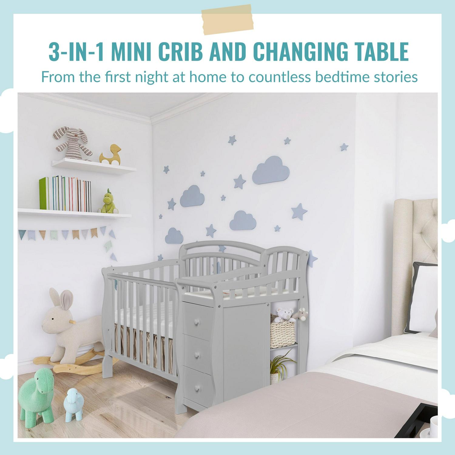 The Dream On Me Casco 4-in-1 Mini Crib & Dressing Table Combo marries style with functionality. It keeps pace with your growing child as it converts it from a mini crib to mini daybed and twin-size bed (bed rails sold separately). It also features a three-drawer changing table. This blend of compact size and utility makes it ideal for smaller spaces. The changing table is equipped with a changing pad and security strap that keep baby safe. Keep baby essentials handy and organized in 3 spacious drawers! Built of New Zealand pinewood, its minimalist design features gentle, smooth arches & sturdy spade feet. It comes in five striking finishes allowing it to blend beautifully with any nursery or growing child s room. It also has a convenient 3-position, adjustable mattress support system. Our mini cribs come with the regulatory one inch mattress pad and we recommend the Dream On Me non-toxic, Greenguard Gold certified mini or portable crib mattress for the perfect fit. All tools/assembly instructions included. All our cribs are designed with a focus on safety, are JPMA certified and meet all applicable ASTM/CPSC standards. Product dimensions are 56.8Lx29Wx41H inches, maximum weight limit is 50 lbs.