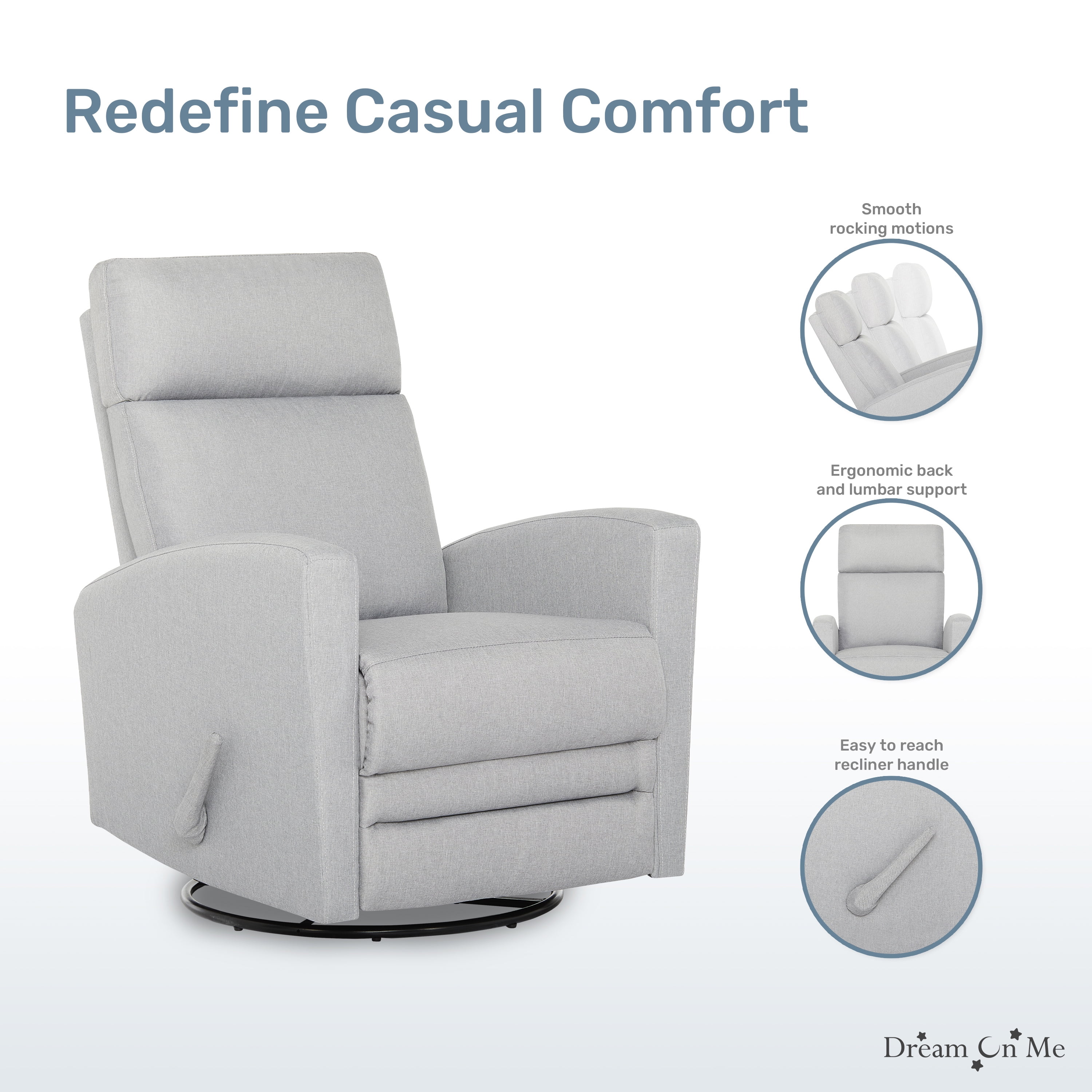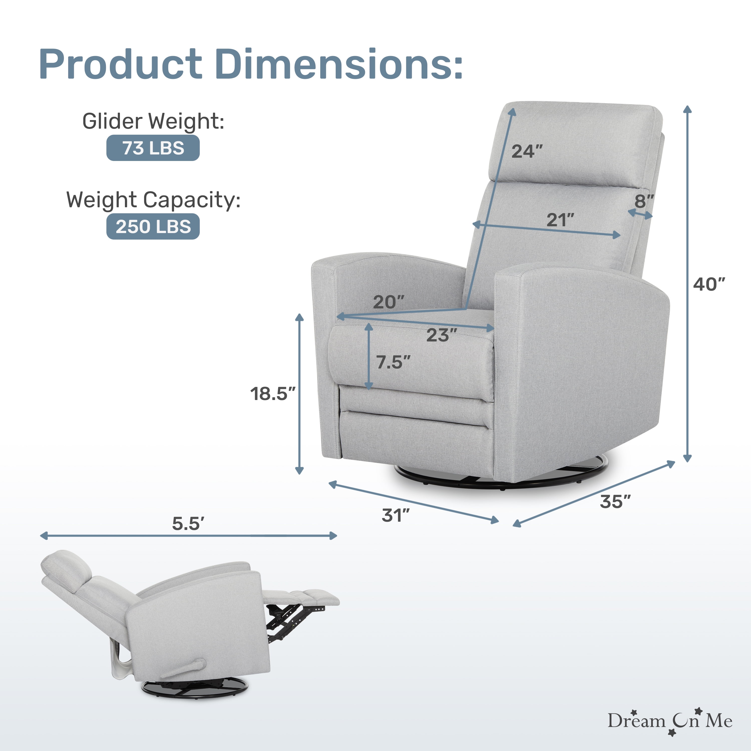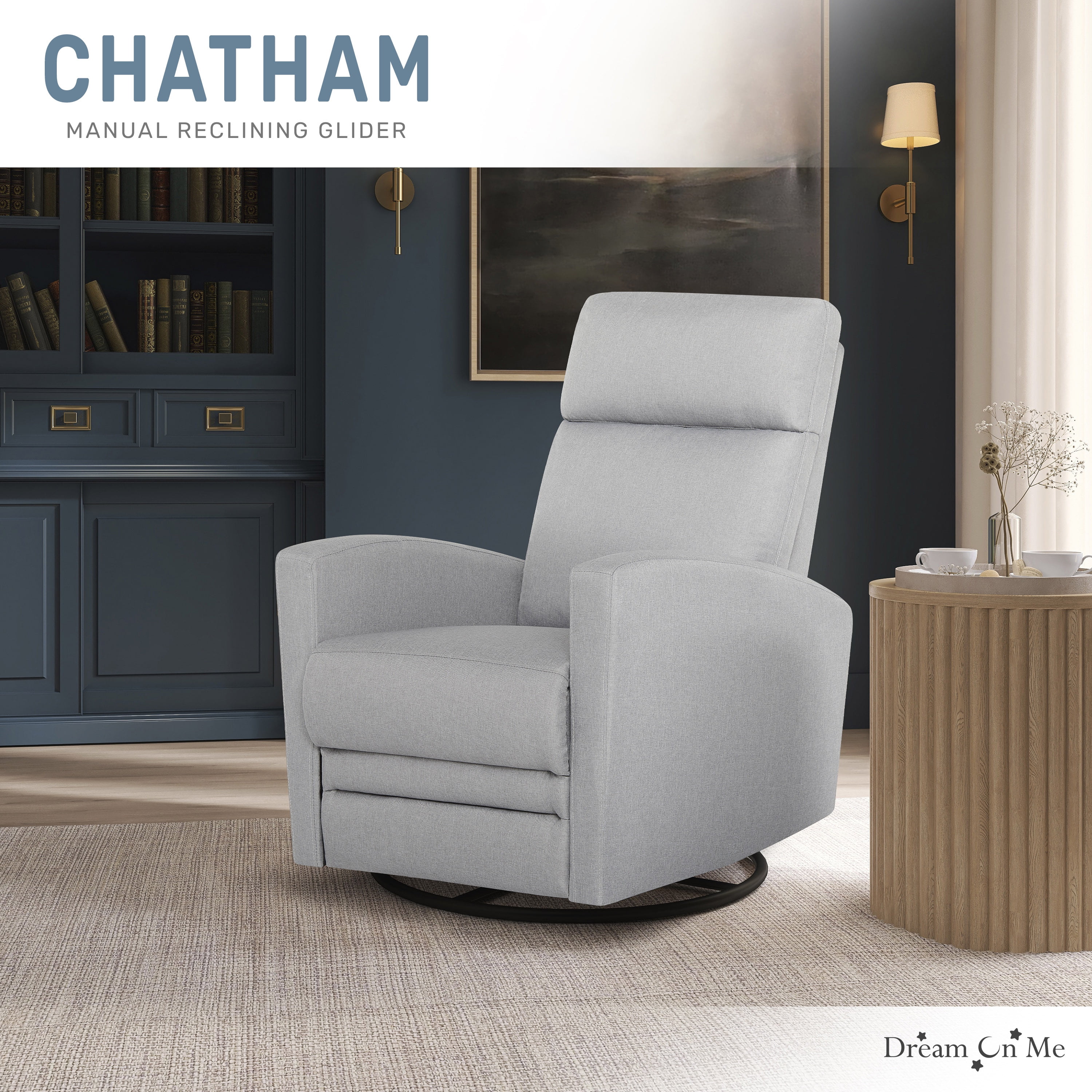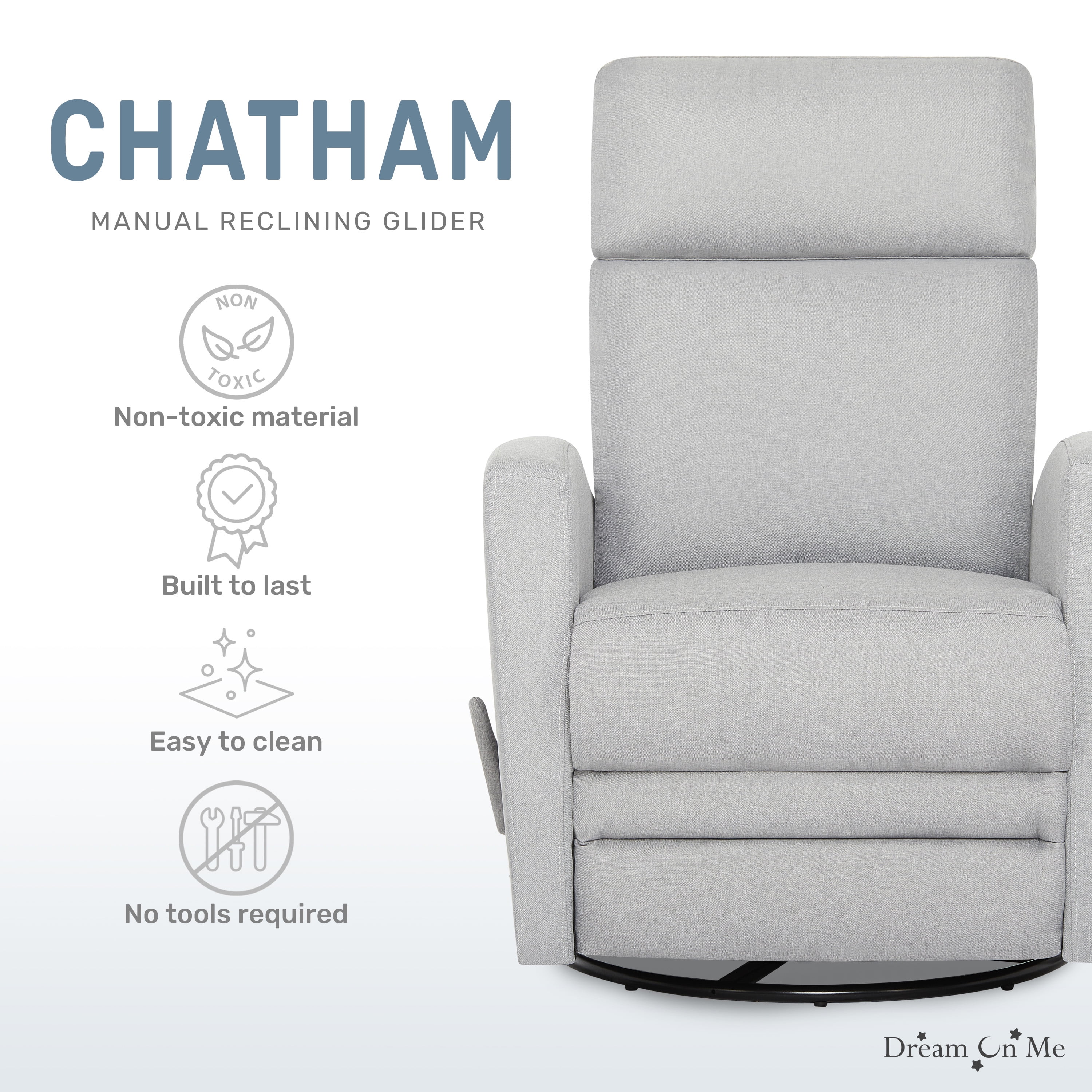 UNLIMITED COMFORT: With ergonomic backrest support, comfortable side rests, 360° swivel and smooth gliding motions, the Chatham is designed to provide full relaxation to your body. EASY TO USE: Setting up the Chatham is easy and requires No Tools! This Glider is covered with an easy-to-clean, durable polyester fabric with foam filling. CONVENIENT FEATURES: The Glider comes with an easy-to-reach-and-use lever on the armrest and has convenient side pockets. STURDY BUILD: The Chatham has a solid metal base that easily supports 360° swivel rotation and gliding capabilities. It meets all CA TB117-2013 flammability requirements, is Greenguard Gold certified and has a 6-month Limited Manufacturer’s Warranty. PRODUCT SPECS.: The Chatham Glider weighs 73 lbs. and has a weight capacity of 250 lbs. Dimensions: 26L x 35W x 40H (inches)