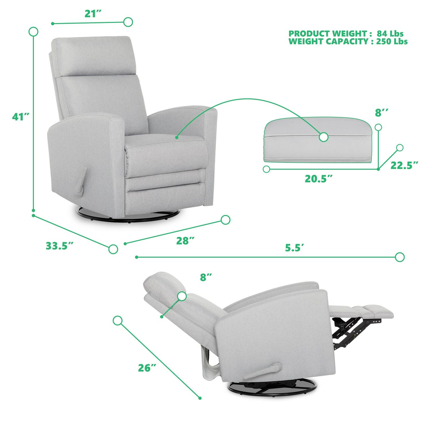 Pamper those aching muscles, nurse your baby or simply enjoy some downtime in the warm embrace of the Dream On Me Chatham Basic Glider , Recliner , Rocker. From plush seating to smooth rocking and gliding motions and an easy to use reclining feature, the Chatham spells luxury and comfort like no other! The Chatham features an ergonomic backrest support for Adults, comfortable side rests and smooth gliding, 360° swivel and rocking motions, designed to provide maximum comfort to your body. Reclining is a breeze thanks to the convenient, easy-to-reach and use lever on the armrest. Enjoy the advantages of a no-tool assembly with the Chatham ! The Chatham is covered with an easy-to-clean durable polyester fabric with foam filling. The Chatham weighs 80.5 lbs and has a weight capacity of 250 lbs. It meets all CA TB117-2013 flammability requirements and has 6 months Limited Manufacturer s Warranty.