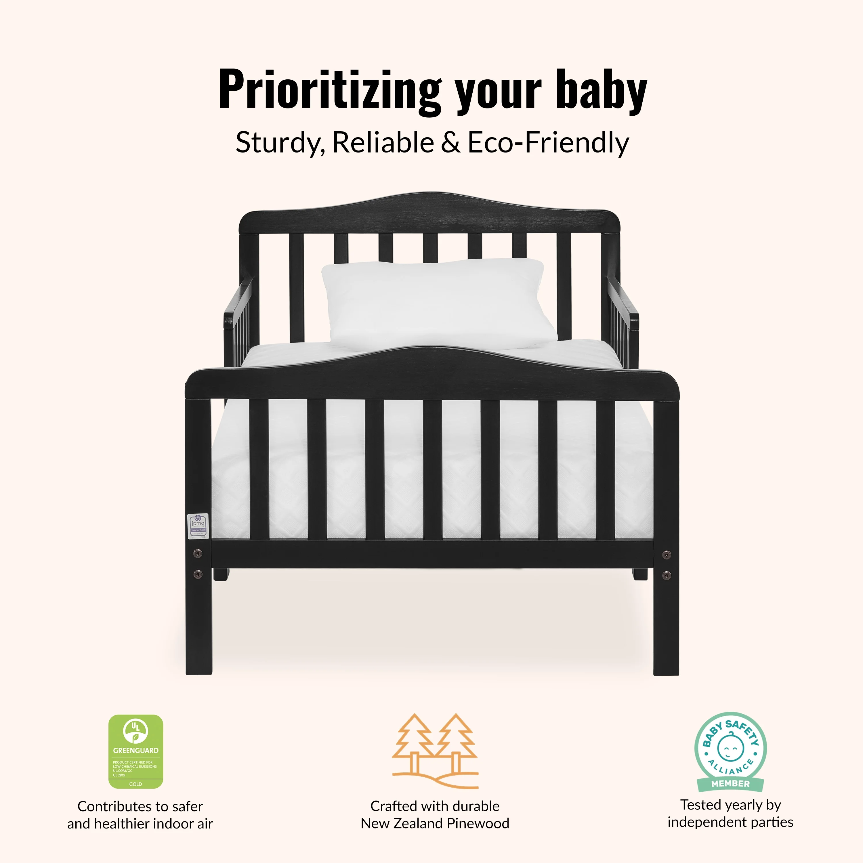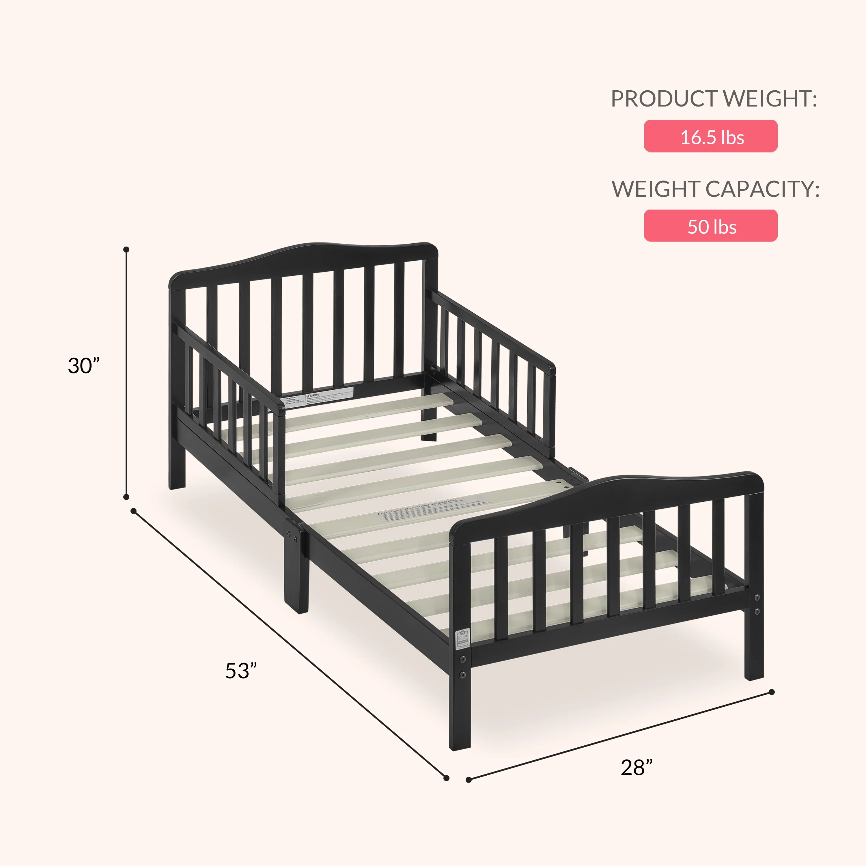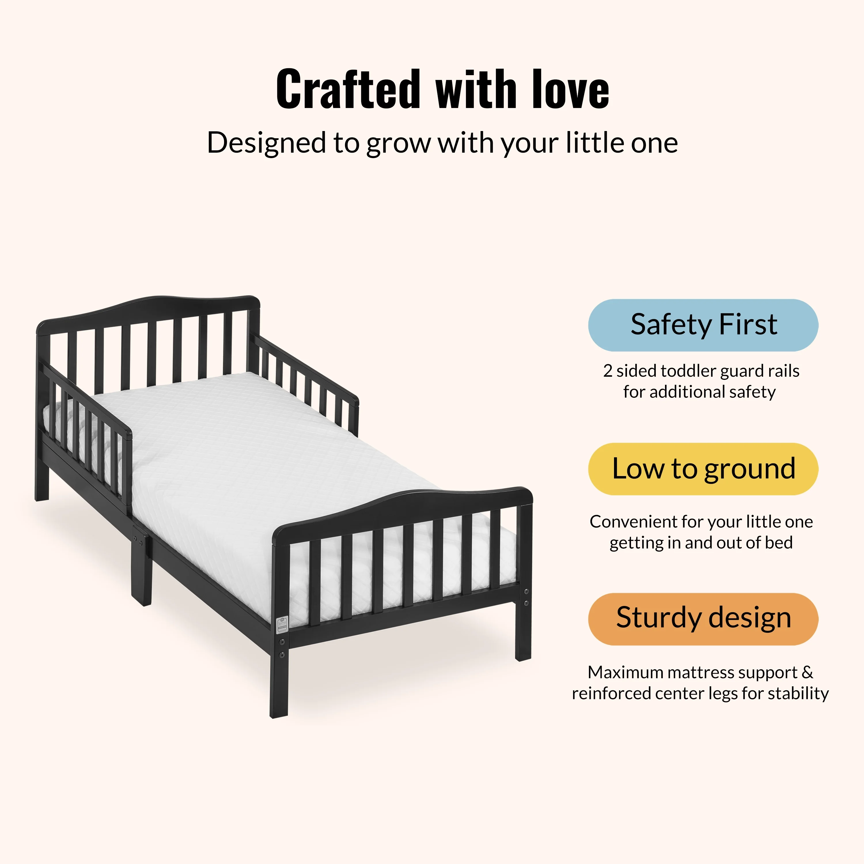 Dream On Me Classic Design Toddler Bed, Black: Two side safety rails Sits low to the floor Fits the standard Dream On Me Crib mattress (sold separately) All tools needed for easy assembly are included Model: 624-C Mattresses are sold separately.