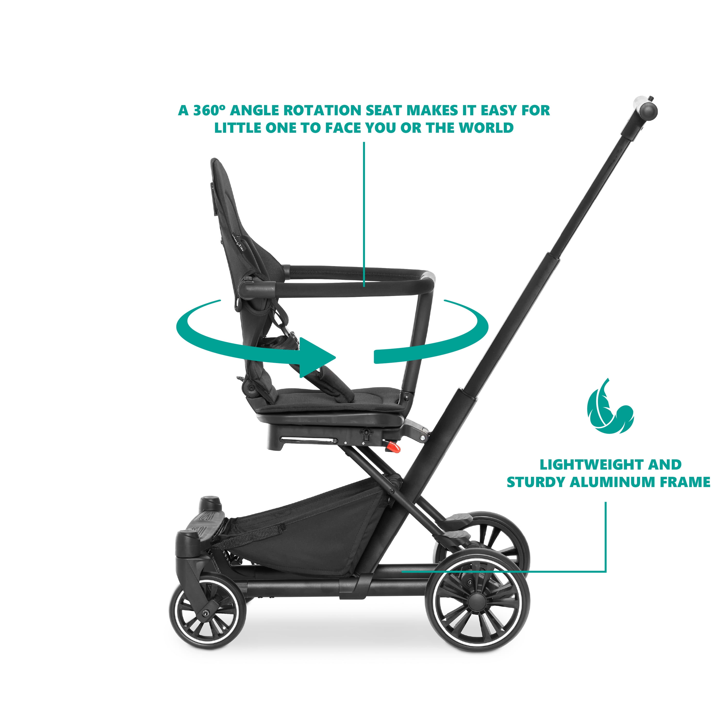 Dream On Me Drift Rider Stroller with Canopy: 360-angle rotation seat makes it easy for little one to face you or the world. Lightweight and sturdy Aluminum frame. Waterproof Fabric seat cover. Folds inward like a book with just one hand. Soft Ride wheels for less pushing effort and comfortable for child. Can be used as a sit-down scooter. Included canopy to protect from harmful rays. Wipe clean with mild soap and water if needed. Folded dimensions: 28 x 16.5 x 9.5″.