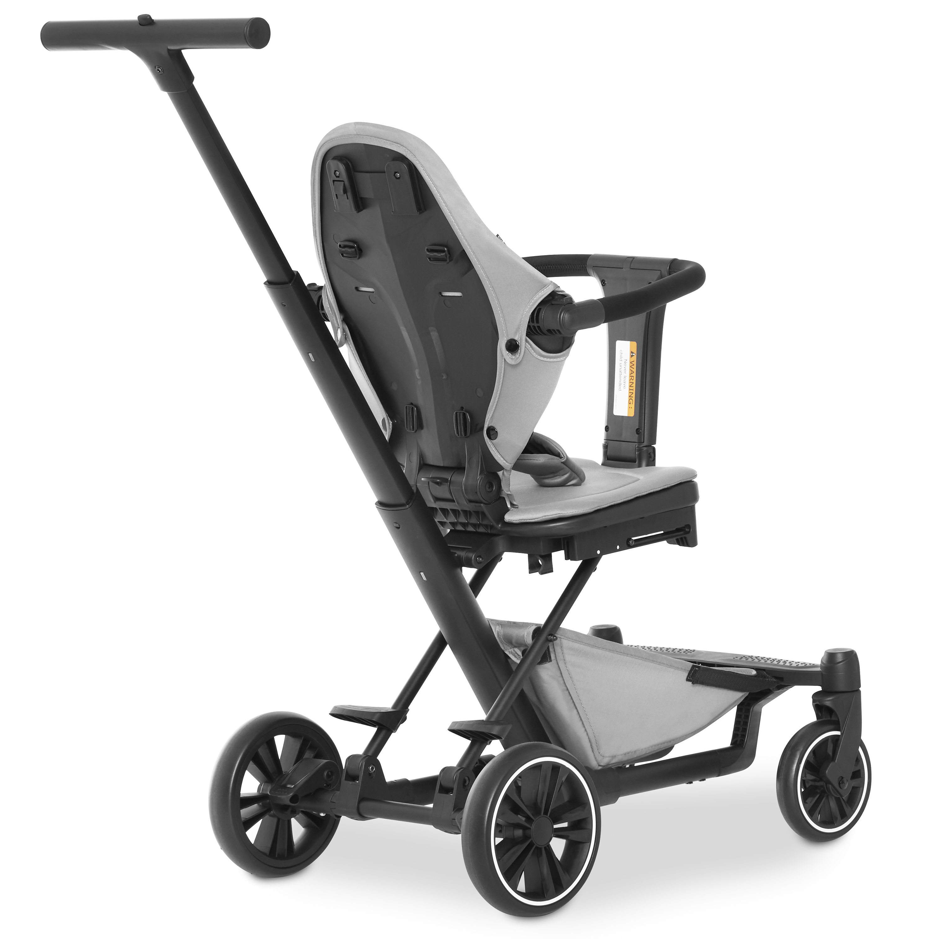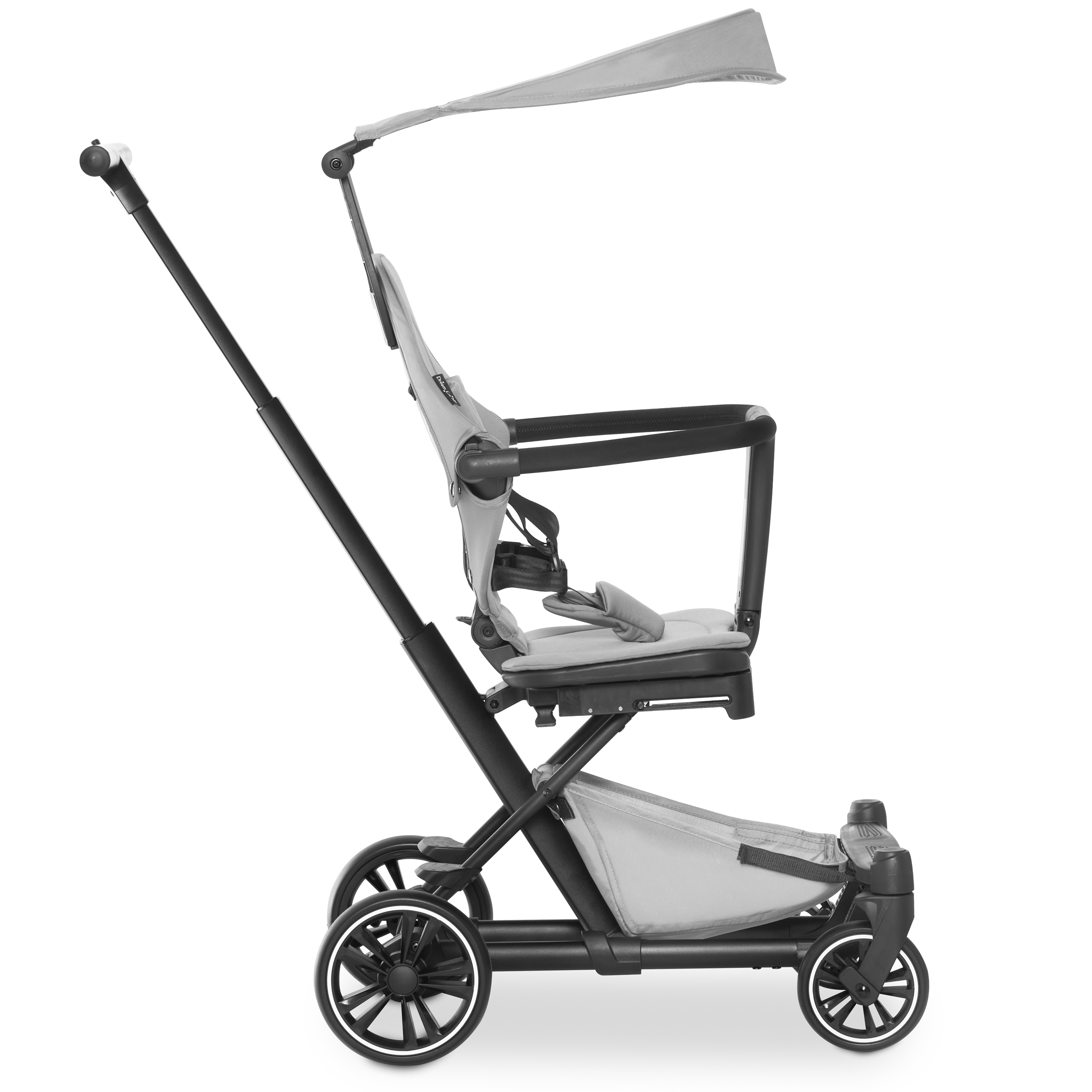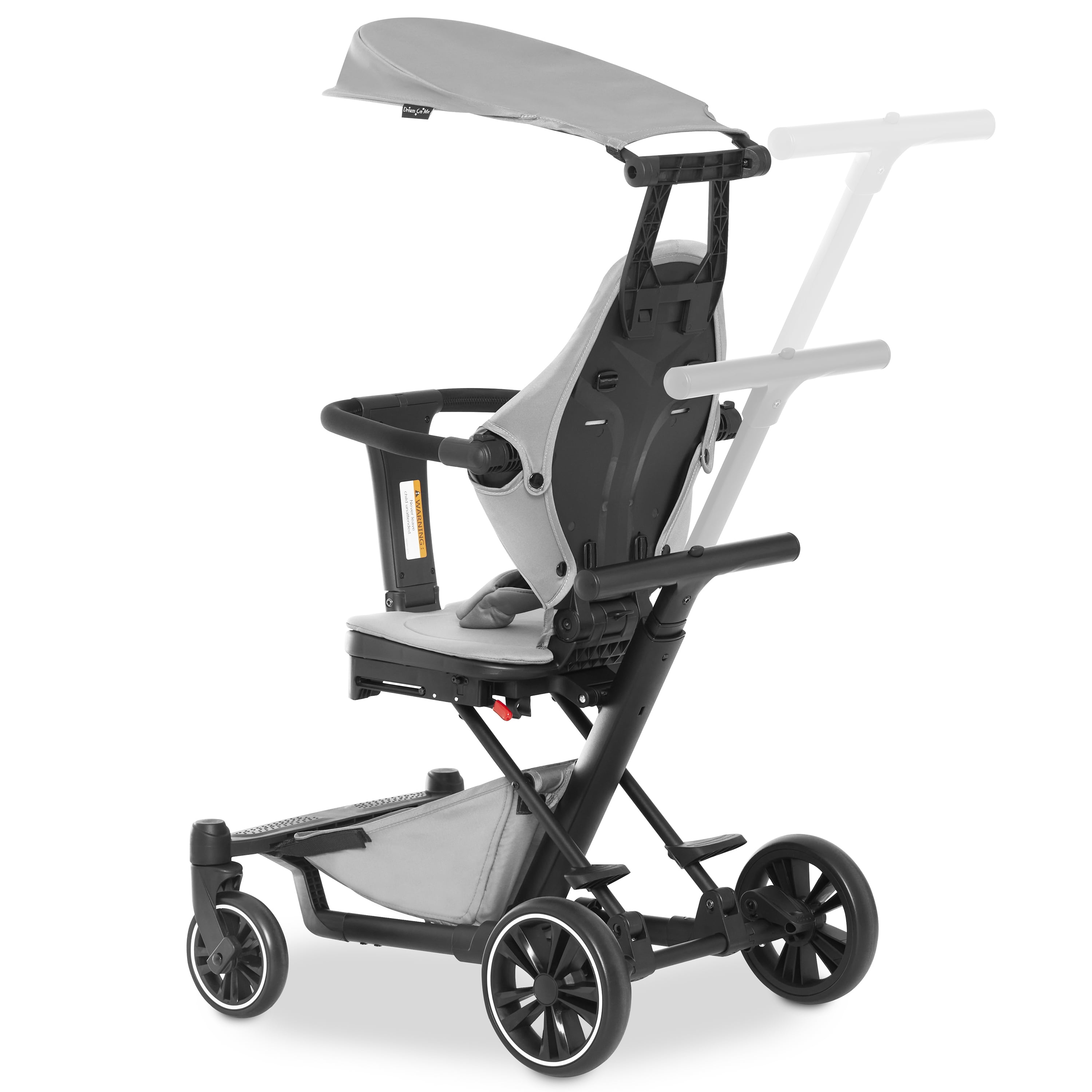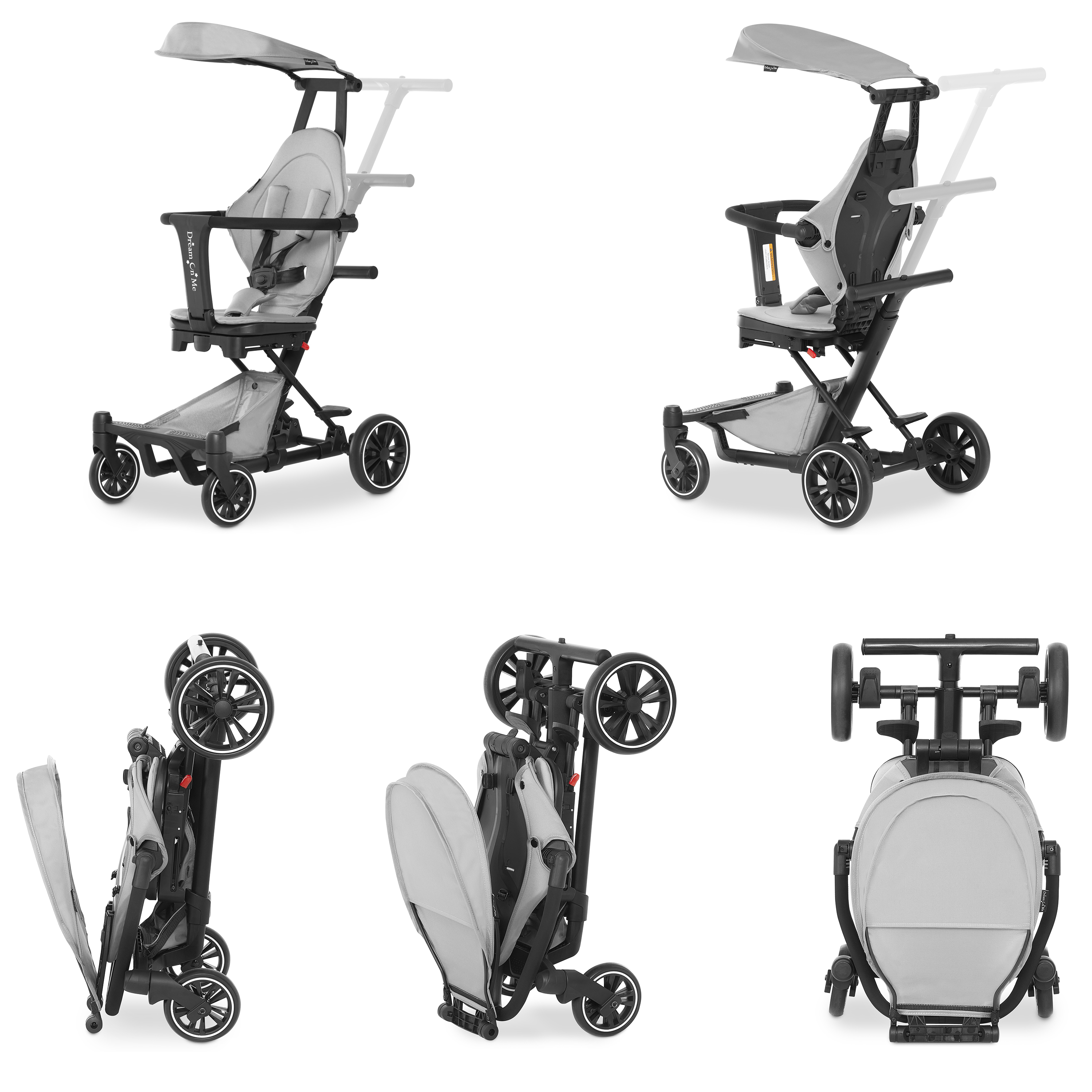 360-angle rotation seat makes it easy for little one to face you or the world. Lightweight and sturdy Aluminum frame. Waterproof Fabric seat cover. Folds inward like a book with just one hand. Soft Ride wheels for less pushing effort and comfortable for child. Can be used as a sit-down scooter. Included canopy to protect from harmful rays. Wipe clean with mild soap and water if needed. Folded dimensions: 28 x 16.5 x 9.5″.