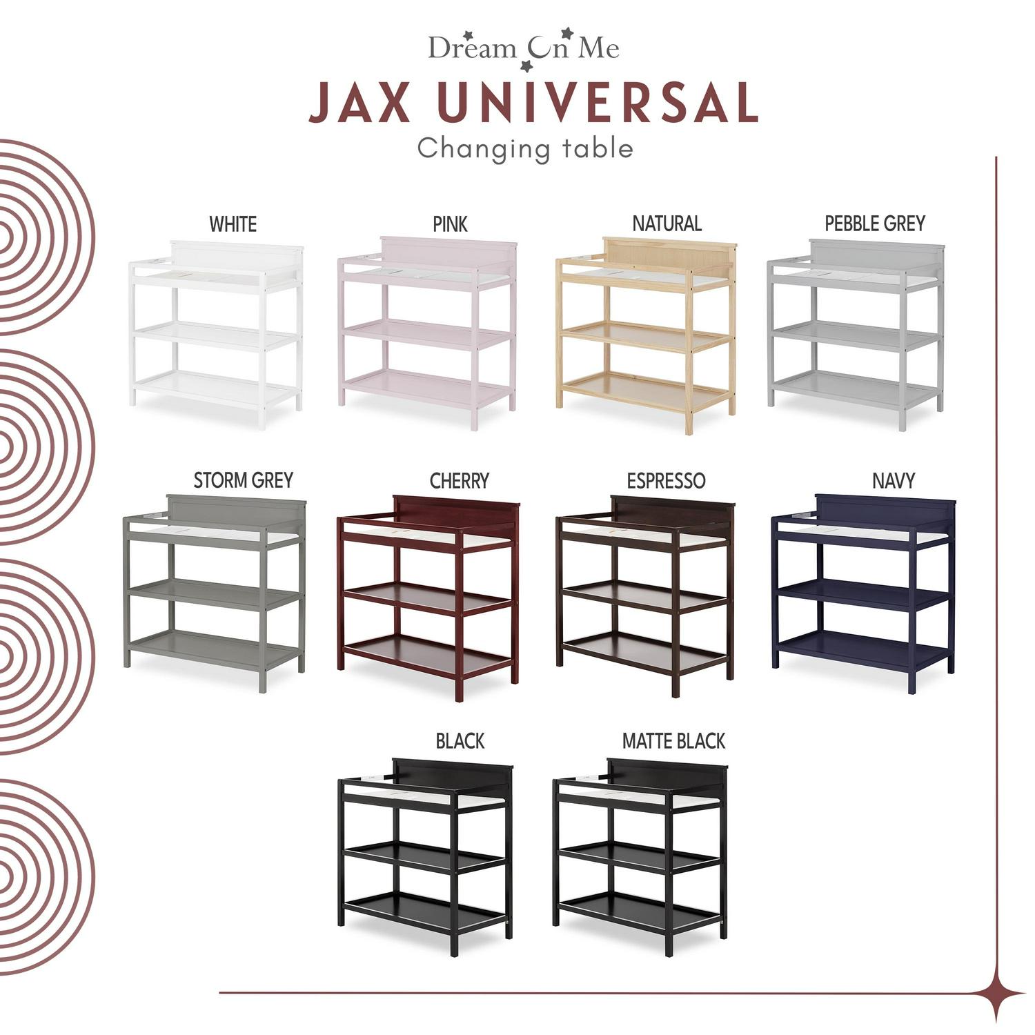 Dream On Me Jax Universal Changing Table is perfect for any nursery. This changing table has a clean modern line design, with a water resistant mattress pad for changing including a safety strap with a fully enclosed dressing area for extra security. Dream On Me Jax changing table has 2 fixed shelves for open storage which is ideal for diapers, wipes and other essentials. This changing table can transition into a night stand as your baby gets older. Dream On Me Jax changing table coordinates with All Dream On Me Crib. All Dream On Me products meets or exceeds government and ASTM safety Standard.