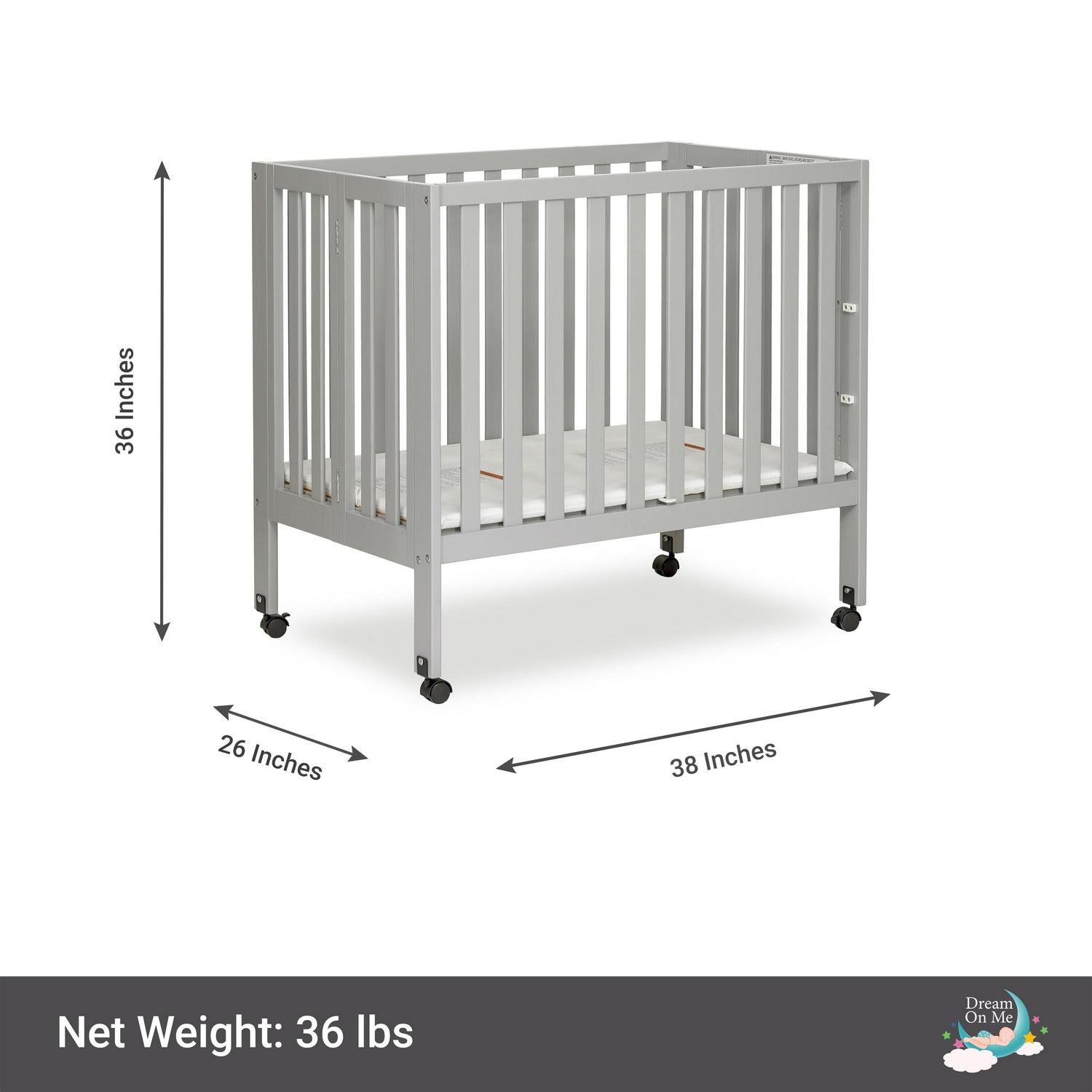 The Dream On Me Jett Non-full size folding crib combines sleek lines with contemporary style to match any nursery decor. This folding crib is a must-have for small spaces; it features three-position adjustment mattress support, built with patent functional folding mechanism that is designed to simply fold flat when more storage needed. This crib is ready to use again by simply unfolding and locking into place, its rolling feet allows for easy movement throughout your home making it perfect for guests with babies, grandparents, caregivers, daycare. The Dream On Me Jett is crafted from sturdy New Zealand pinewood, it s a durable and versatile addition to any modern nursery. All Dream On Me cribs is JPMA certified and meet all applicable ASTM and CPSC standards. Third-party labs for lead and other toxic elements to meet or exceed CPSC and ASTM safety standards test all of our products.
