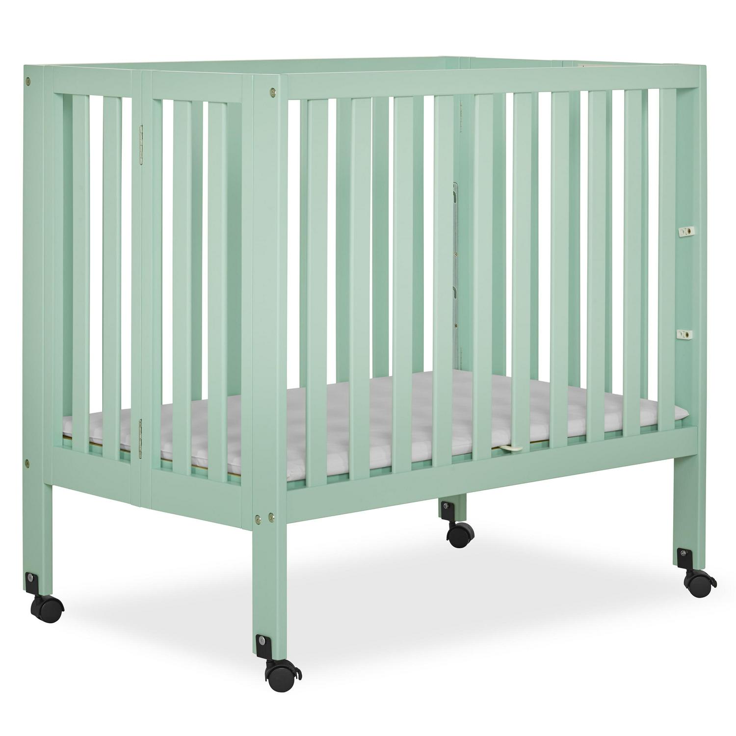 – PRODUCT SPECS: Dimensions: Crib includes casters for easy mobility; Folds flat for easy travel and storage;