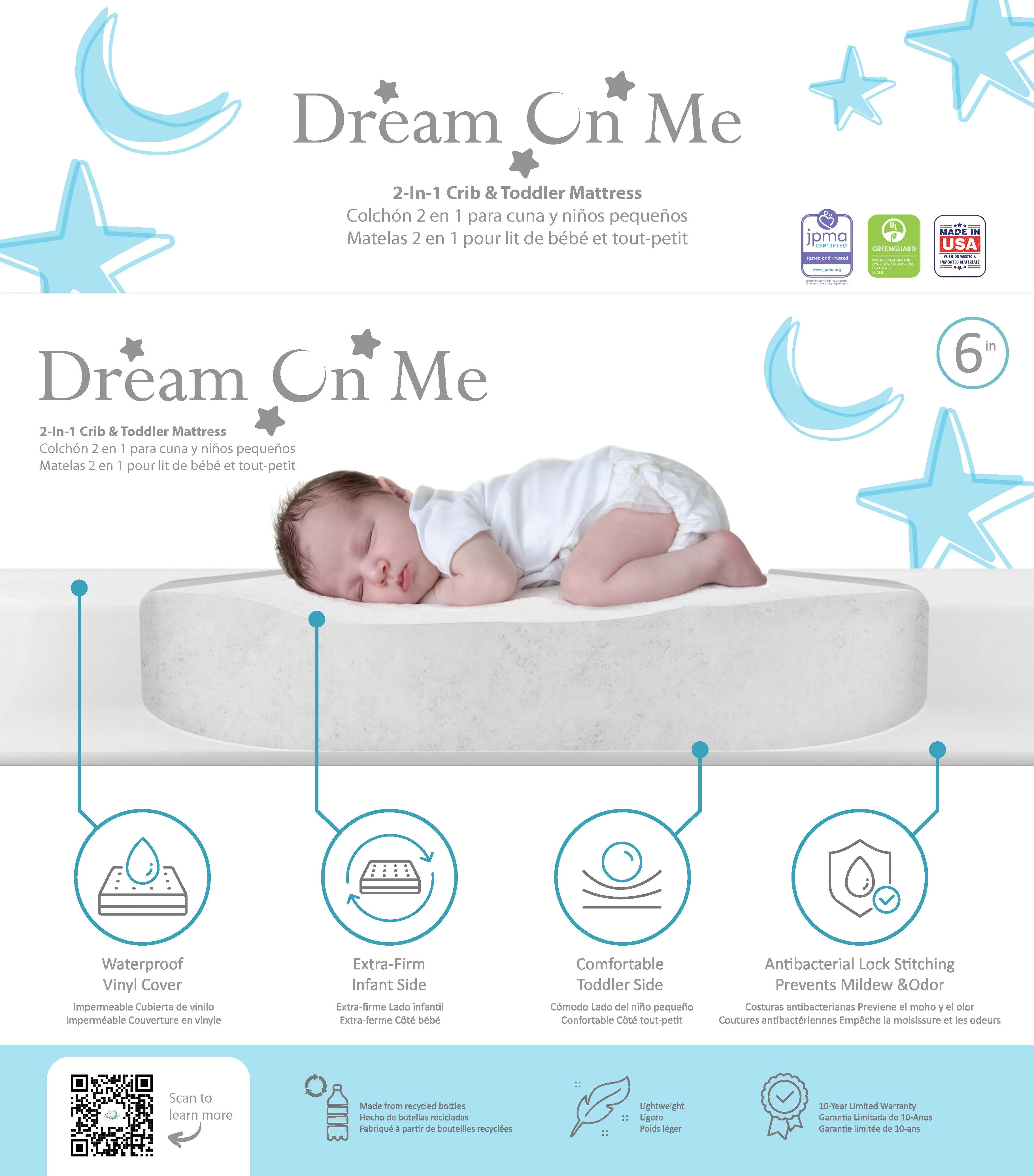 Dream On Me Little Baby 6″ Full Size Firm Foam Crib and Toddler Bed Mattress: Antibacterial, waterproof lock stitched binding helps prevent mold, mildew and odor from seeping inside like cotton binding allows Airflow pocket helps keep crib mattress fresh without the use of small metal vents Reinforced waterproof cover and binding resist liquids and stains Fits all standard size cribs and toddler beds for years of use Wipe clean with mild soap and warm water Dimensions: 52″ x 27″ x 6″ Thickness: 5″ Reversible design allows mothers to choice a brown cloud print or a white side 30 day Warranty Manufacture Flip and rotate mattress every 2-3 months Safety advise: Please ensure mattress covers or fitted sheets are not too tight or loose over a crib mattress to practices safe sleeping Passes all Flammability tests (16 CFR 1632 /1633) without the use of flame retardants and also pass phthalate, lead and toxicity tests All Dream on Me mattresses are GreenGuard Gold Certified for a healthy indoor environment for your baby Questions about product recalls? Items that are a part of a recall are removed from the site, and are no longer available for purchase. These items include items only, not those of Marketplace sellers. Customers who have purchased a recalled item will be notified by email or by letter sent to the address given at the time of purchase. For complete recall information, go to Recalls.