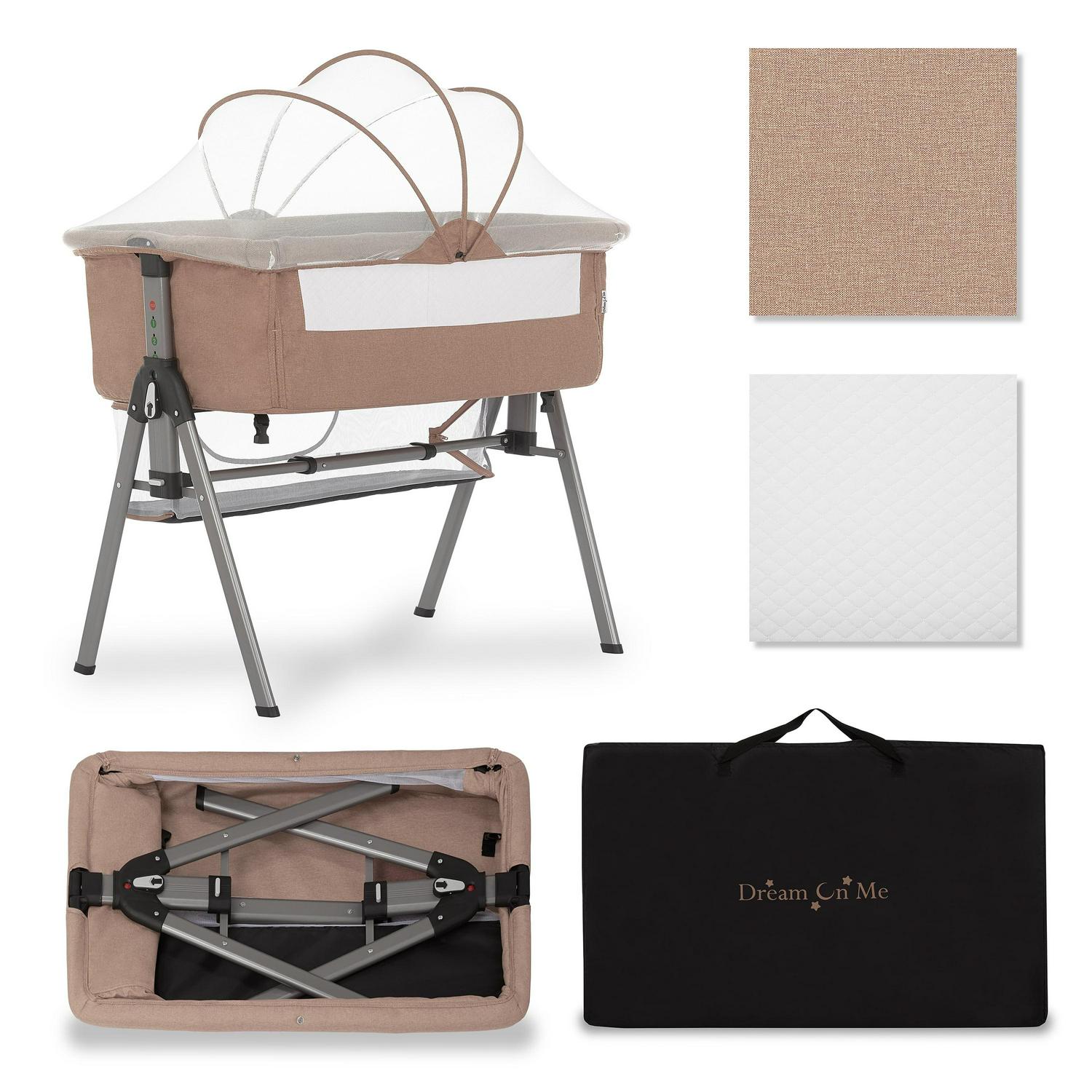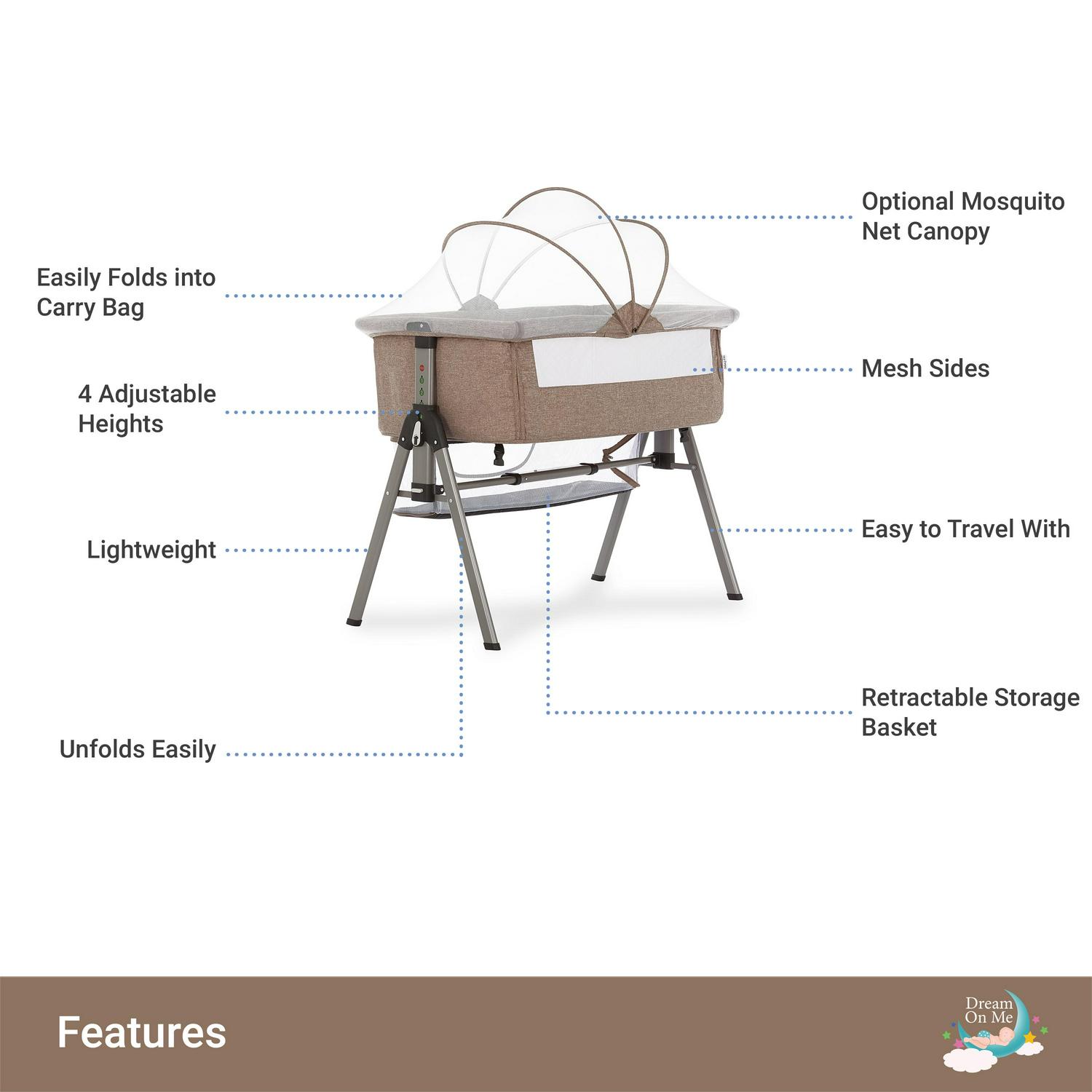 Dream On Me Lotus Bassinet and Bedside Sleeper in Brown, Lightweight, Carry Bag Included