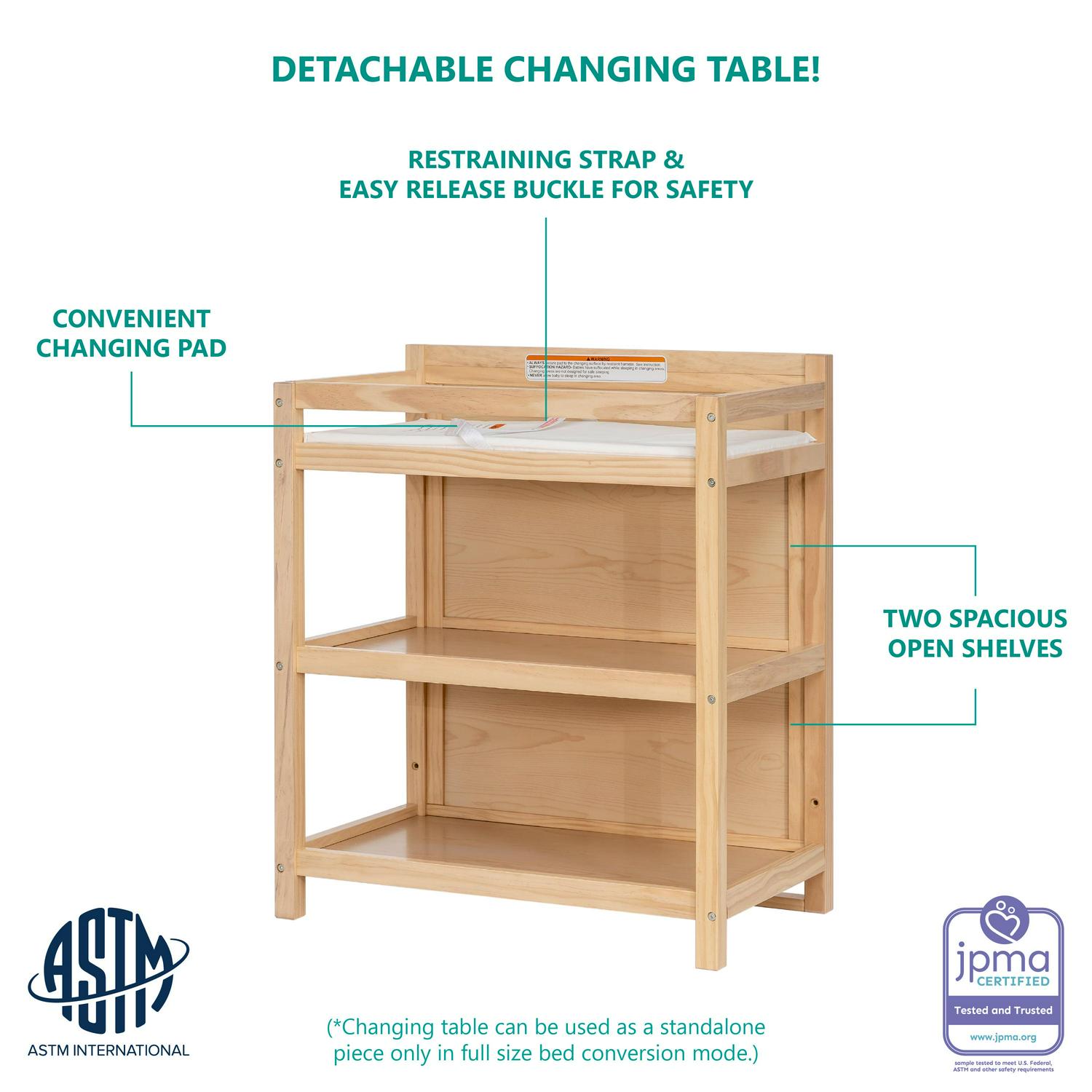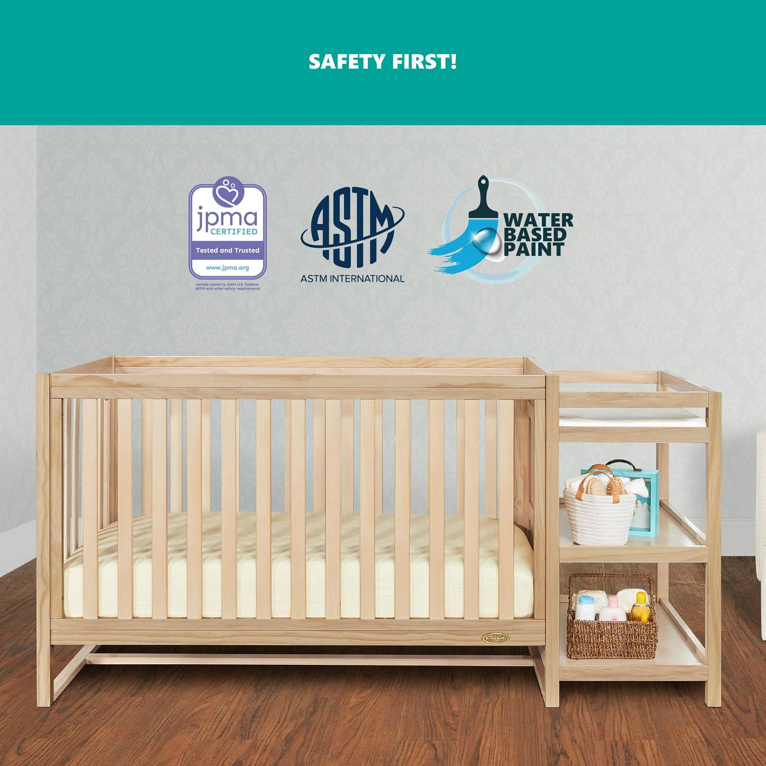 -5-IN-1 CONVERTIBILITY: The Milo easily converts from a crib into a toddler bed (conversion kit sold separately) and daybed. Changing table includes pad and 2 shelves for storage.-GROWS WITH YOUR CHILD: The Milo features the convenience of 3 mattress height positions that you can change as your baby grows. For the best fit use any Dream On Me/Evolur full-size, non-toxic, Greenguard certified crib mattress-TRENDY DESIGN: Built of sustainable, renewable, sturdy New Zealand pinewood, the Milo boasts a modern, gender-neutral vibe with subtle routing lines, square feet and soft fluting on the footboard & headboard. Pick from four solid/two-tone finishes-SAFETY FIRST: Side stationary rails mean added security. It s JPMA certified to meet /exceed all safety standards set by the CPSC/ASTM. All our products are tested by 3rd party labs for lead/other toxic elements to meet/exceed CPSC/ASTM safety standards