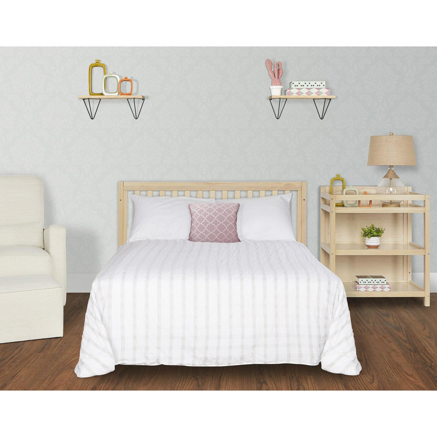 Introducing the Dream On Me Milo 5-In-1 Convertible Crib and changer table which offers a unique but stylish choice for a modern nursery. It features a distinguished base that creates a floating effect for a contemporary look. The adjustable mattress heights allow this crib to grow alongside your little one, starting with the highest level then lower it as your baby begins to sit or stand. The Milo crib can be converted into a toddler bed, daybed/sofa and full-sized bed (conversion kit, conversion toddler rail and bed rails sold separately). The full-size crib has a convenient changing table and pad attached, complete with shelves to make changing baby extremely convenient. The two generous shelves provide plenty of storage space for diapers, wipes and any other necessities right at your fingertips. Built of durable, sustainable and renewable New Zealand pinewood, the Milo design is minimalist and on-trend. Choose from single-tone as well as our dual-tone finishes that complement a variety of nursery and room decor themes. All our cribs are designed with a focus on safety, are JPMA certified and meet all applicable ASTM/CPSC standards. All tools for assembly included. For the best fit, we recommend any Dream on Me or Evolur standard, full-size, non-toxic, Greenguard Gold certified crib mattress (sold separately).
