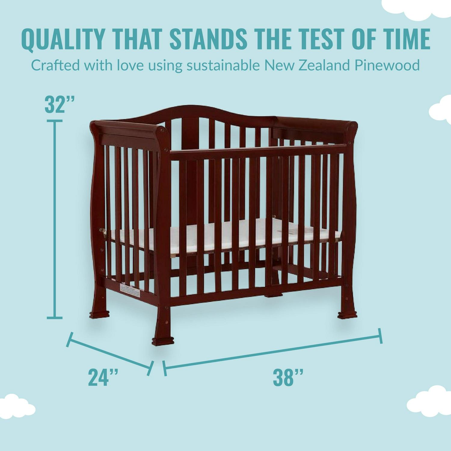 What makes the Addison 4-in-1 Mini Convertible Crib a stylish and convenient nursery solution Use it as a mini crib, mini daybed and twin-size bed (bed rails sold separately) to keep pace with your child! Comfortable yet compact, it s ideal to free up nursery space or to use in grandma s home. Built of New Zealand pinewood, its minimalist design features gentle, smooth arches & sturdy spade feet making it a beautiful piece of furniture. The contemporary styling allows it to blend easily into any nursery decor.The crib has a 3-position adjustable mattress height setting to accommodate your growing child & comes with the regulatory 1 mattress pad. Choose a Dream On Me non-toxic, Greenguard Gold certified portable crib mattress for a perfect fit. The Addison is available in beautiful non-toxic baby-safe finishes which can match perfectly with whatever nursery theme that you choose. All Dream On Me cribs meet/exceed applicable JPMA, ASTM & CPSC standards. Product dimensions are 38L x 24W x 32H inches and the maximum weight limit is 50 lbs. All tools/assembly instructions included.