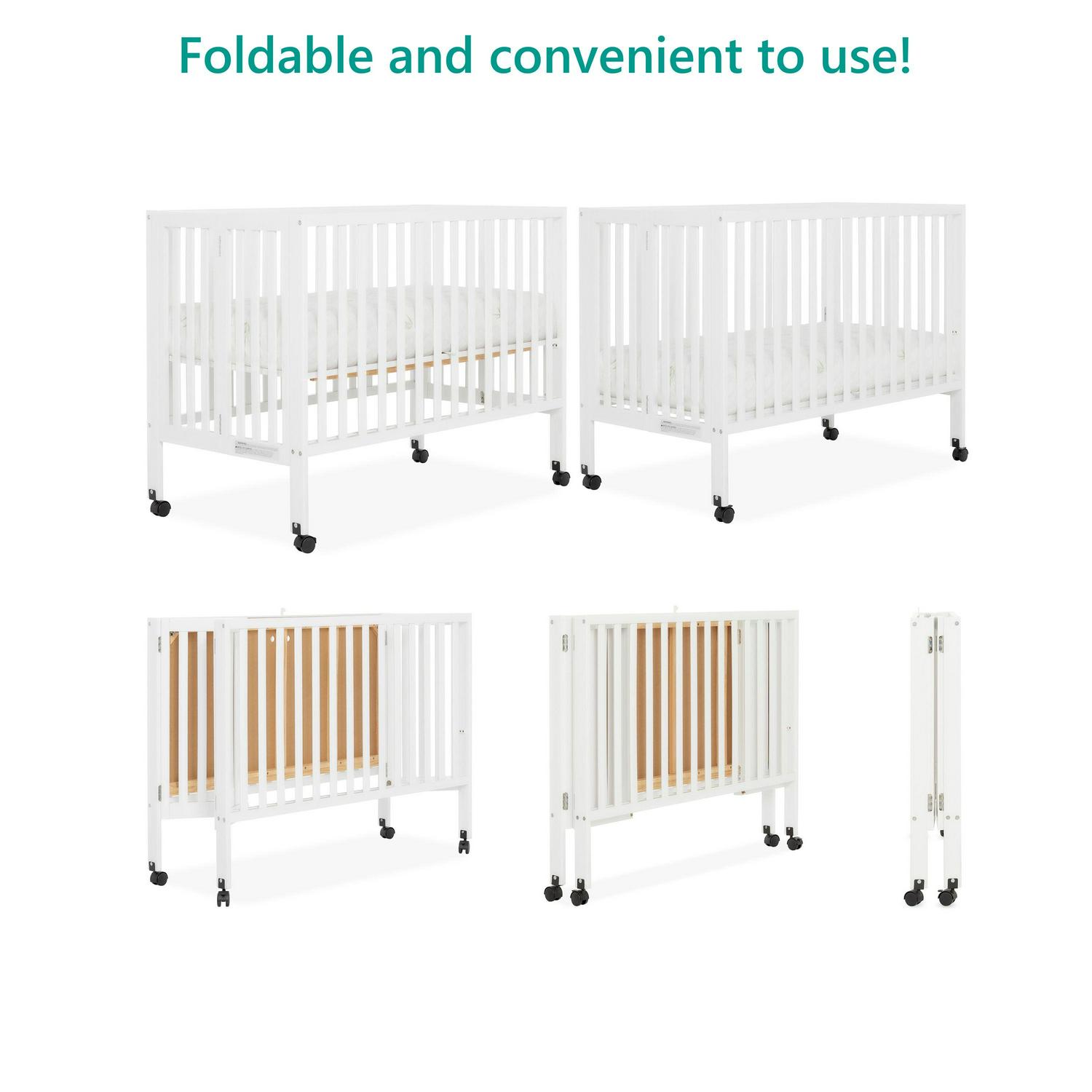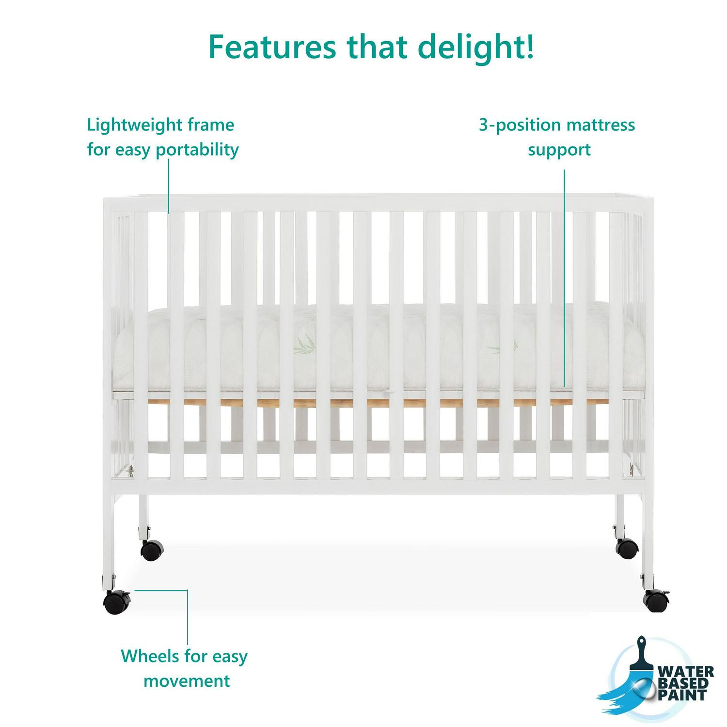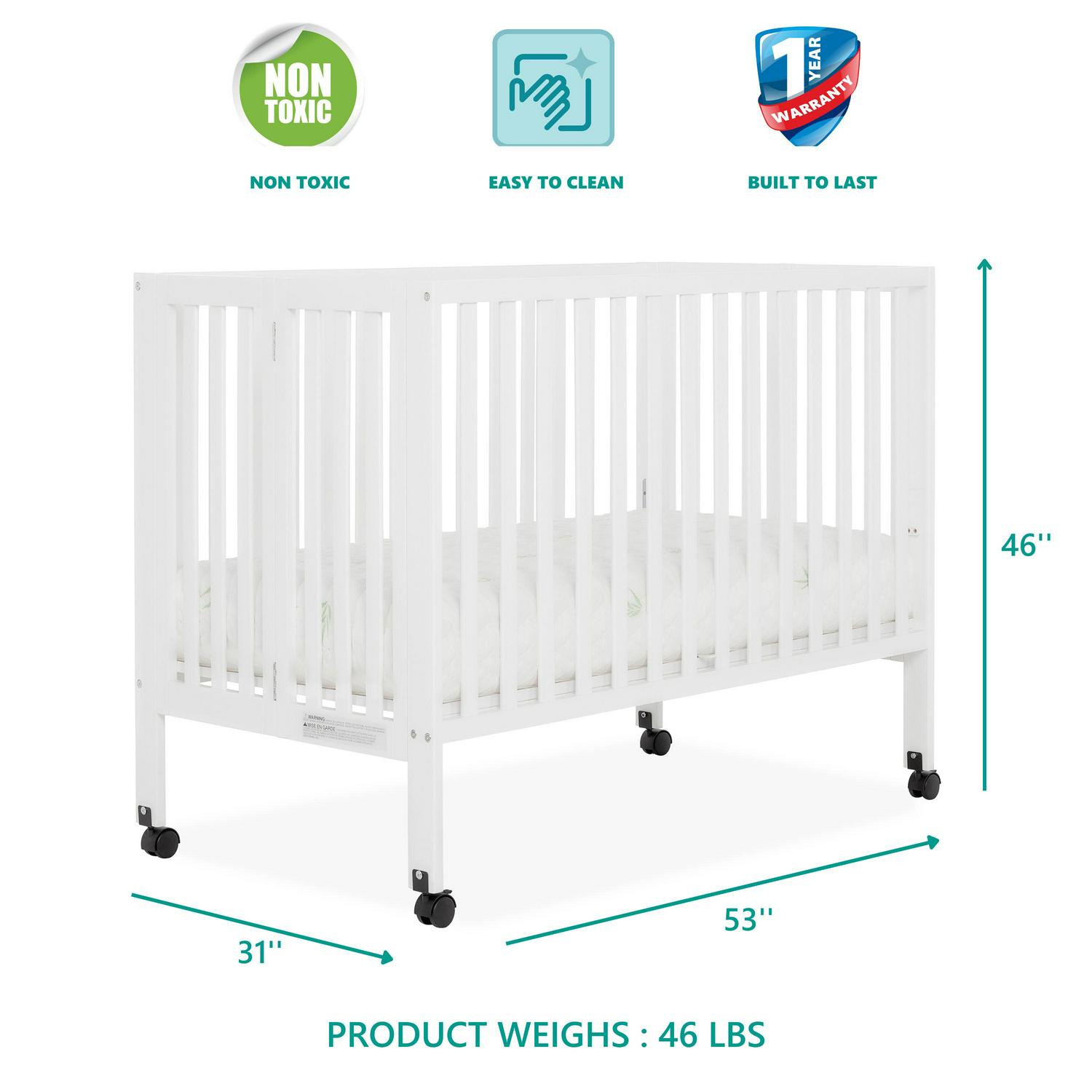 The Dream On Me Quinn full-size folding crib combines sleek lines with contemporary style to match any nursery décor. This folding crib is a must-have for small spaces; it features three-position adjustment mattress support, built with patent functional folding mechanism that is designed to simply fold flat when more storage needed. This crib is ready to use again by simply unfolding and locking into place, its rolling feet allows for easy movement throughout your home making it perfect for guests with babies, grandparents, caregivers, daycare. The Dream On Me Quinn is crafted from sturdy New Zealand pinewood, it s a durable and versatile addition to any modern nursery. All Dream On Me cribs is JPMA certified and meet all applicable ASTM and CPSC standards. Third-party labs for lead and other toxic elements to meet or exceed CPSC and ASTM safety standards test all of our products.