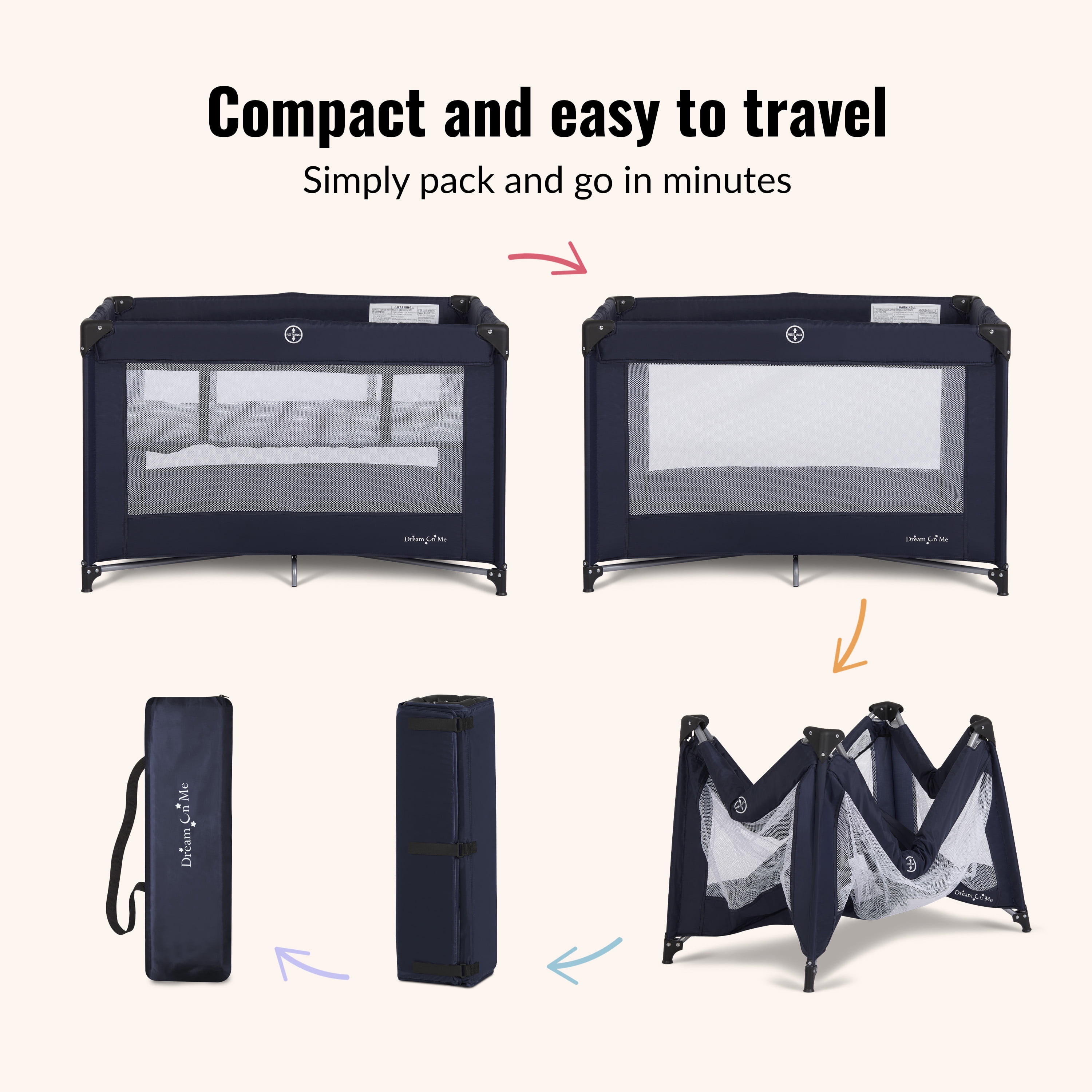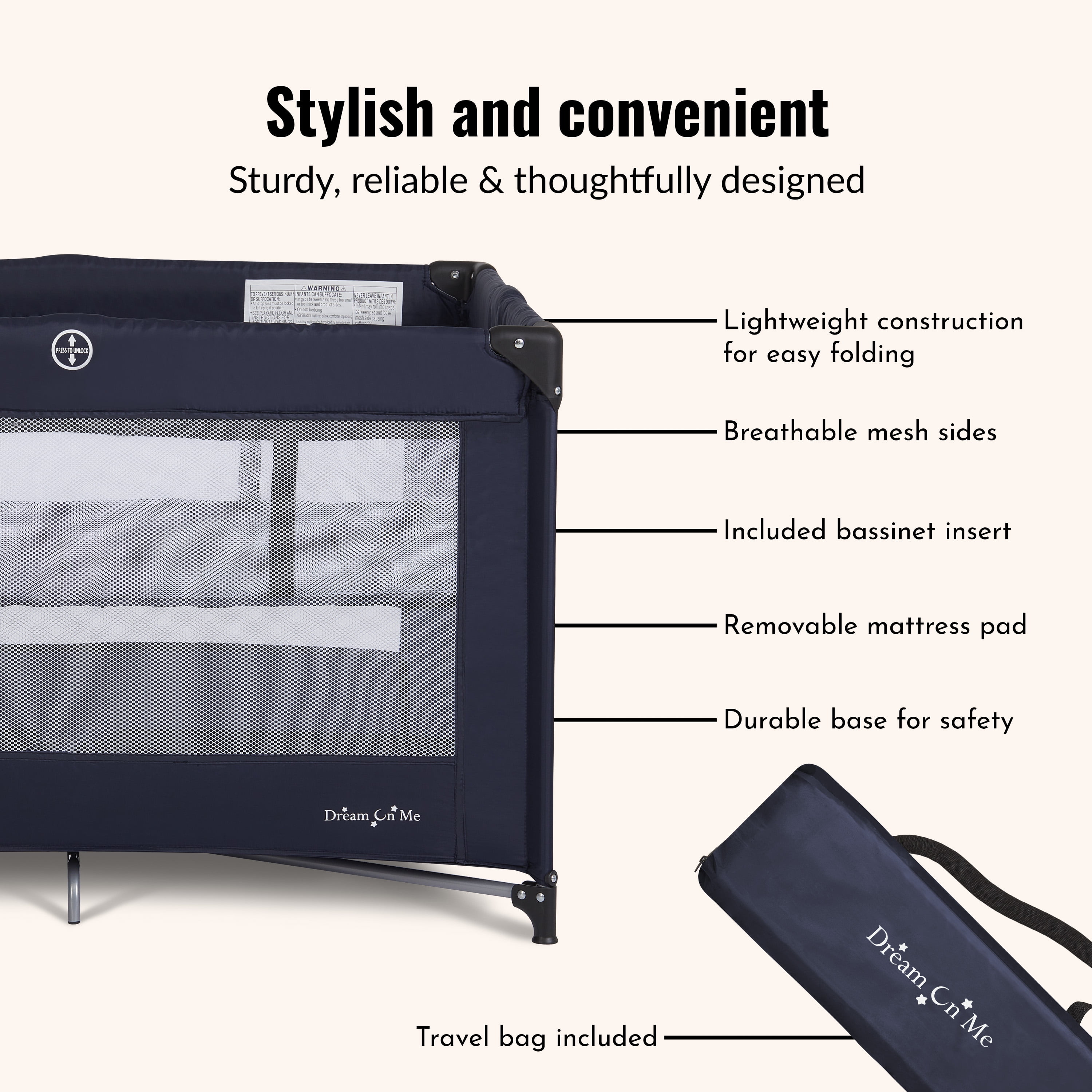 Dream On Me Zazzy Portable Play yard with Bassinet: Quick & Easy Set up All for mesh sides for 360 degree visibility. Comes with full Size Infant bassinet insert Folds easily for Travel and storage (7 x 7.5 x 28″) No tools required. Travel bag included with shoulder strap. Meets all CPSC and ASTM standards