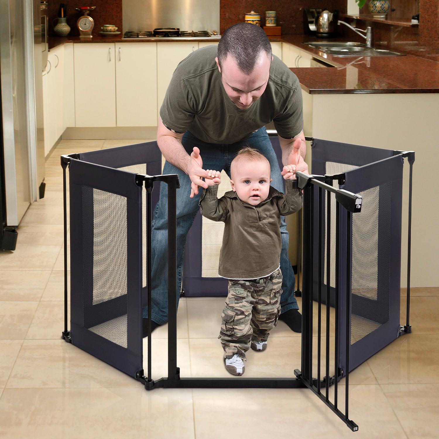 – 147.5″ wide and 29.5″ tall The play-pen is portable which makes it ideal for traveling and using in multiple areas around the home 6 modular panels including convenient walk through easy close gate with stay-open feature Compact design folds easily for storage or travel. Great for pets too!