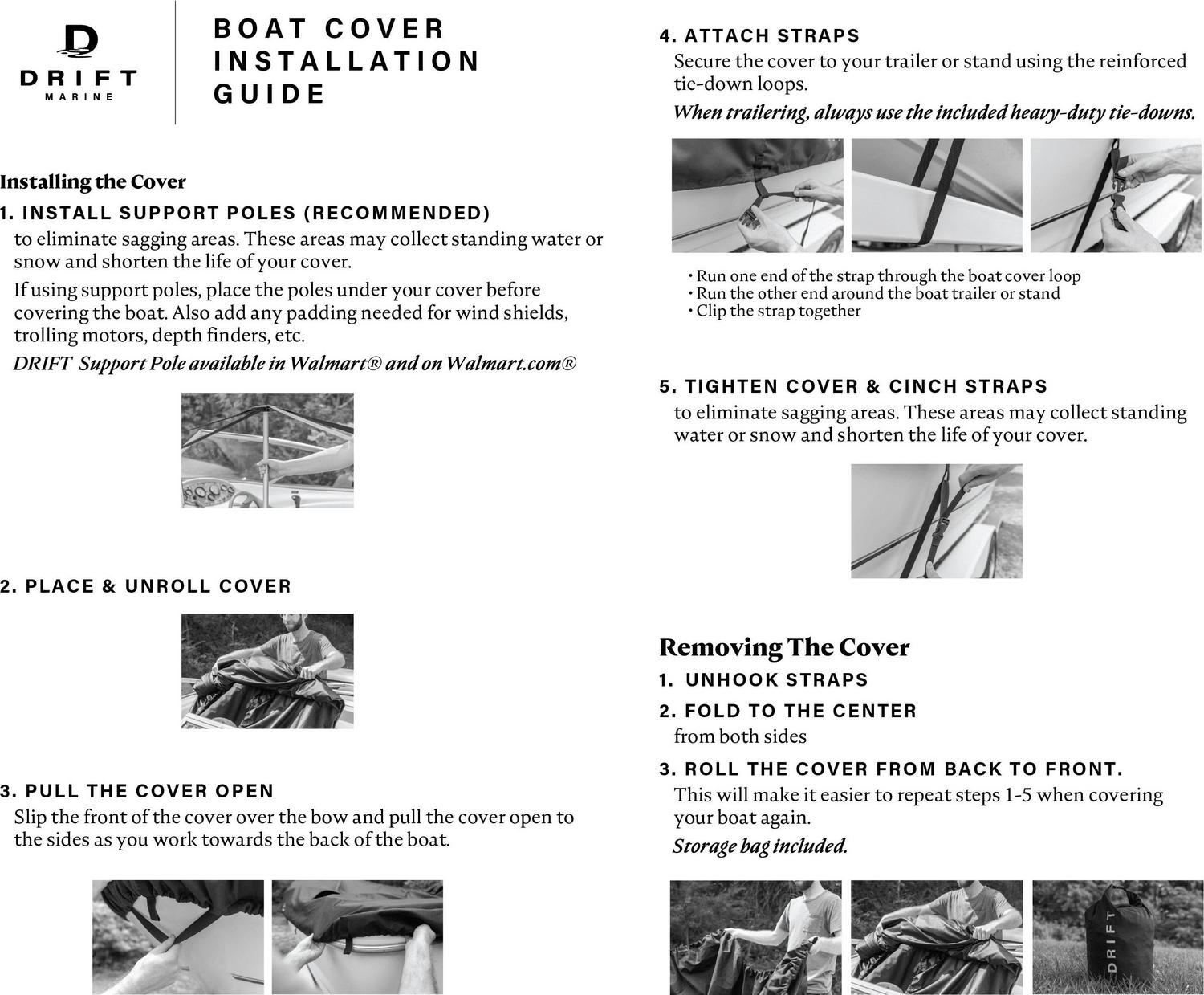 Help protect your vessel from the harsh marine elements when not in use with the DRIFT 600 Denier Polyester Boat Cover Accessory in black. With a polyester construction and PU coating, the DRIFT boat cover provides UV and all weather protection. Air vents are also incorporated to reduce moisture and mildew build-up. The boat cover comes with straps for easy tie-down. Reinforcements at the bow and stern give the DRIFT’s 600 Denier Boat Cover superior durability. Protect and safely tow your boat to the shore with the coverage of the DRIFT 600 Denier Polyester Boat Cover Accessory.