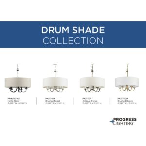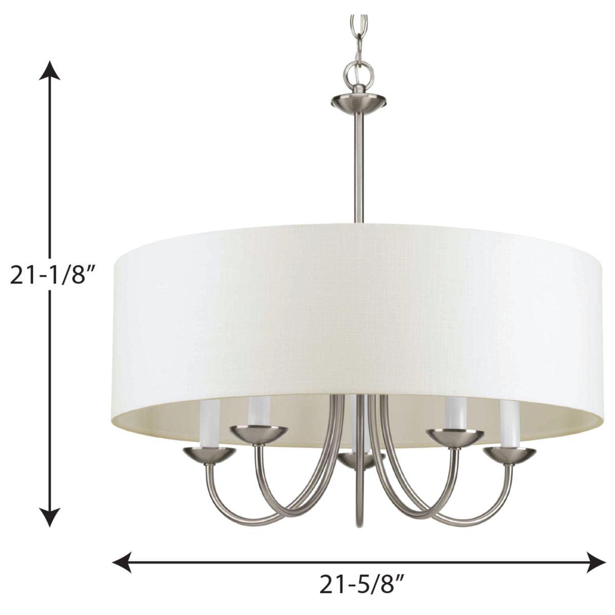 PERENNIALLY POPULAR DESIGN: Generate welcoming visual interest with the perennially popular look of the Drum Shade Collection s Five-Light Chandelier ideal for any foyer, dining room, or kitchen in new traditional settings;CRISP WHITE DRUM SHADE: The crisp white drum shade gives a casual rustic feel to this classic light fixture;UNDERSTATED BRUSHED NICKEL FINISH: Inside the drum shade are dainty pedestal light bases held in place by gently curving arms coated in an understated brushed nickel finish;SIZE: Measures 21-5/8-inch width by 21-1/8-inch height;BULB TYPE: For optimal illumination, the chandelier uses five candelabra base bulbs that are sold separately (60w max LED, CFL, halogen, or incandescent) fully dimmable with dimmable bulbs