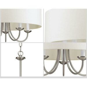 Freshen your home décor with a chandelier light from the Drum Shade Collection. Light sources glow from within a crisp white linen fabric shade that gives a country-casual feel to this classic light fixture. The gently curving arms are coated in a beautiful brushed nickel finish. Compatible with dimmable bulbs.