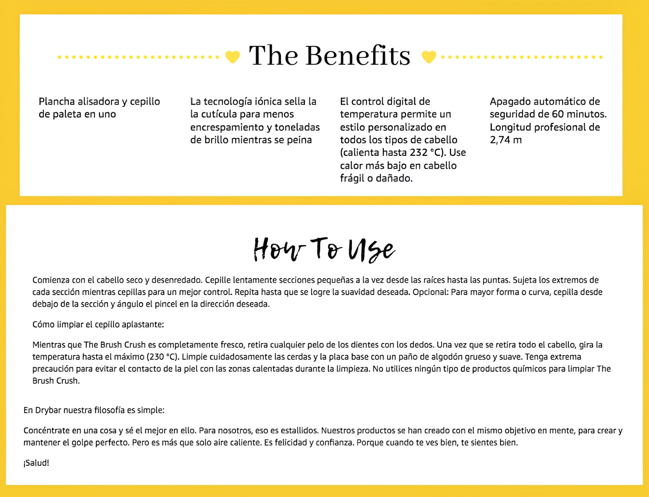 Product Statement (Why you’ll love me) Compact and travel-friendly design helps create a smooth, frizz-free look in one easy step. Great for touch-ups, flyaways, bangs and shorter styles. The Good Stuff – Straightening iron and paddle brush in one – Great for touch-ups, flyaways, bangs and shorter styles -Ionic Technology reduces frizz and adds tons of shine while styling. – Heats up to 400°F/200°C – Universal voltage – Guaranteed with a 2-year limited warranty