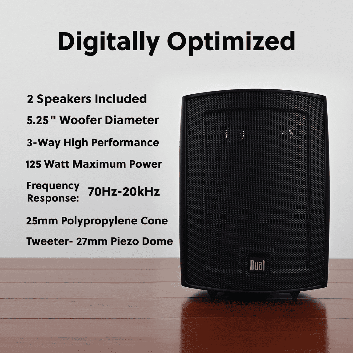 Enjoy exceptional sound quality with the Dual Electronics LU53PB 5.25-inch 3-way outdoor speakers. Featuring a digitally optimized design for expansive dispersion and powerful bass, these weather-resistant speakers are perfect for indoor and outdoor use. With a 125-watt peak power, 4-6 ohm impedance, and a frequency range of 70Hz-20kHz, these speakers deliver a truly immersive audio experience. The included swivel brackets allow for versatile placement, and the 2-year warranty ensures long-lasting performance.