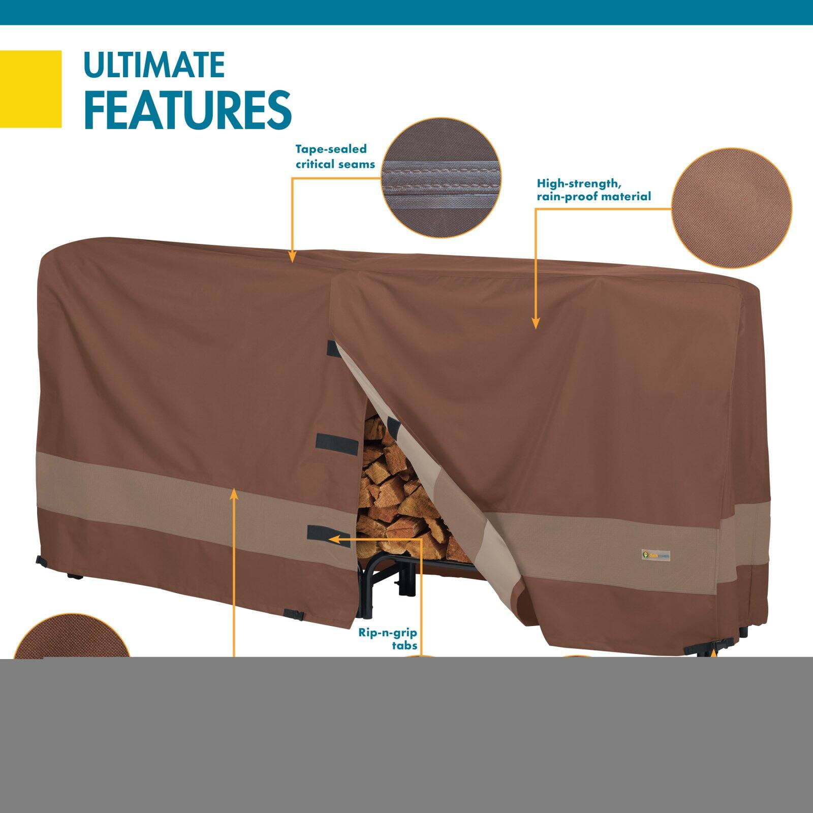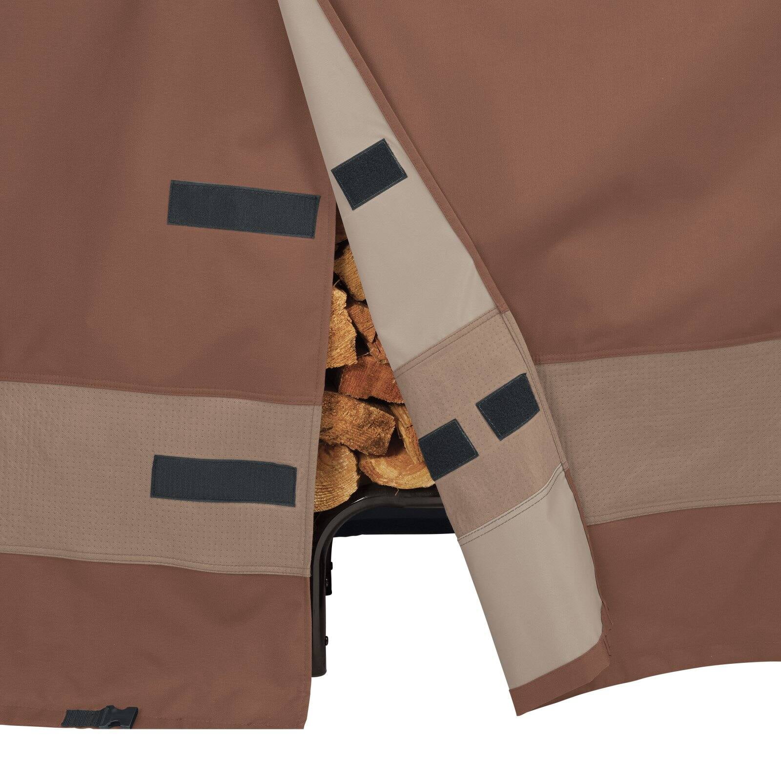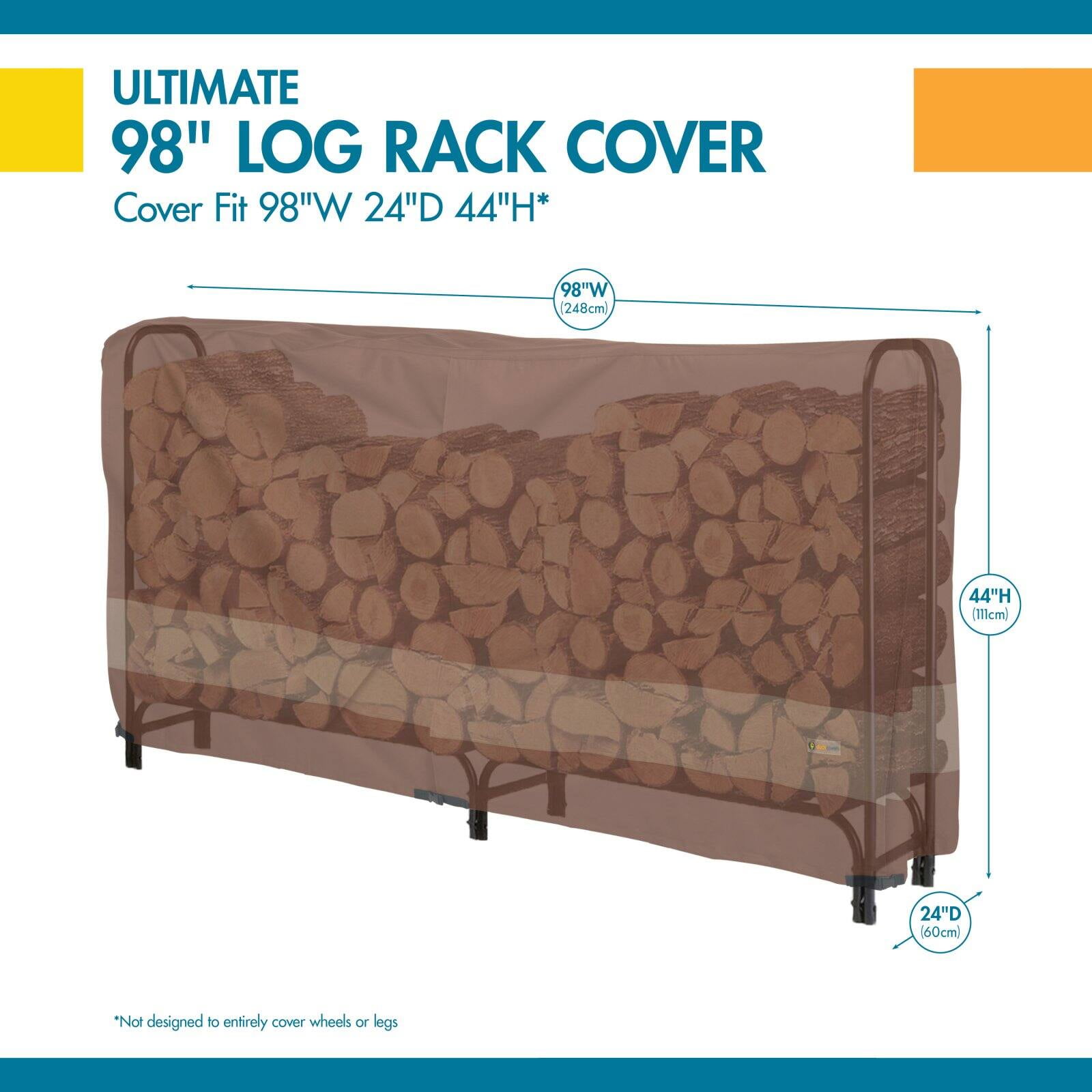 PREMIUM PATIO FURNITURE COVER : Fits log rack up to 98in W 24in D 44in H PATIO FURNITURE COVERS with WARRANTY: Two-year limited warranty WATER-RESISTANT: High-strength, water-resistant materials DURABLE COVER WITH ADVANCED FEATURES: Click-close straps in each corner hold the cover securely in place and closed Rip-n-grip tabs allow for easy access Tape sealing at critical seams prevents leaking Double-stitched seams for extra durability *Not designed to entirely cover the wheels or legs