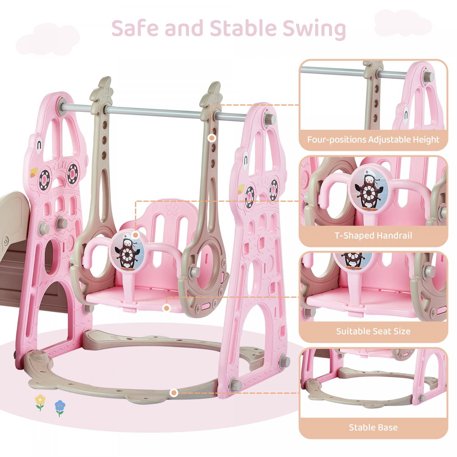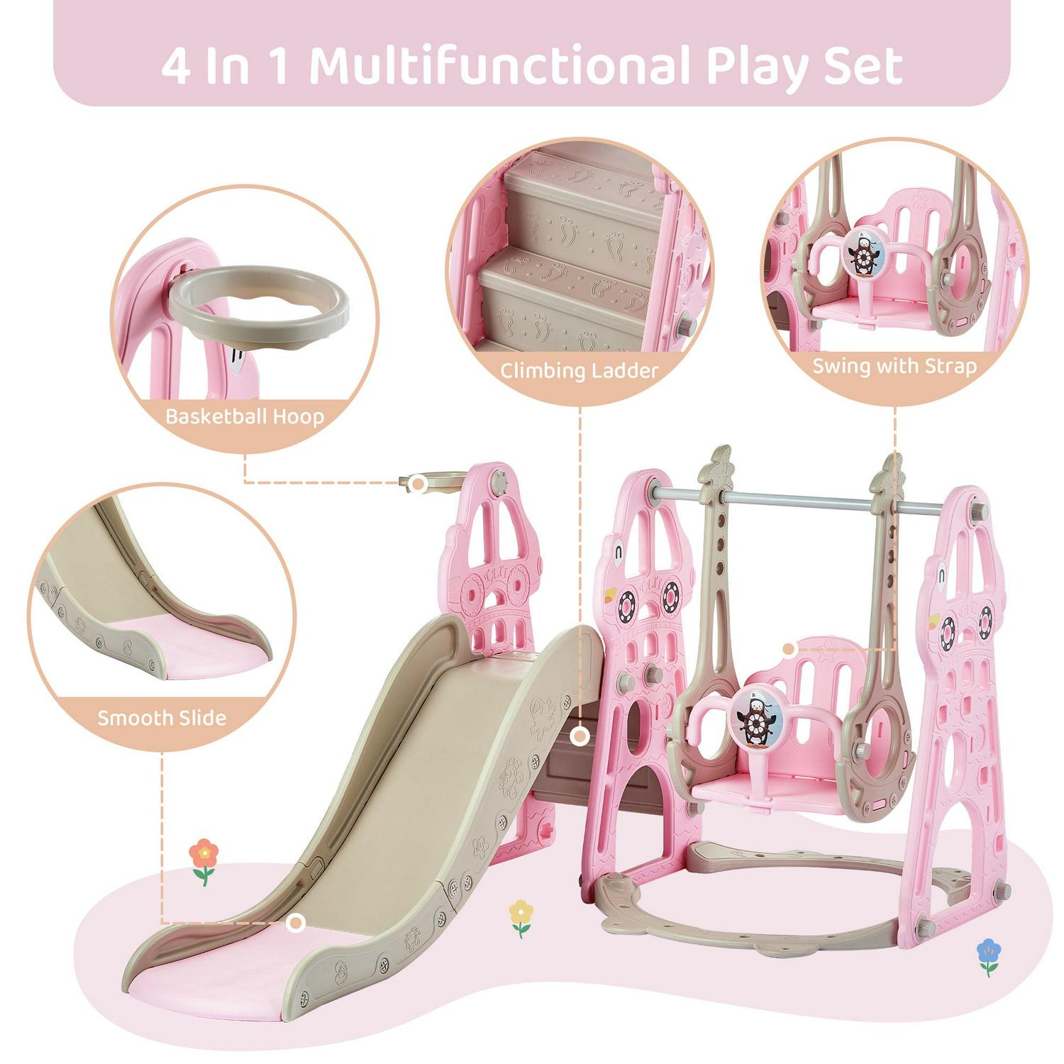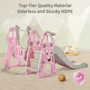 DUKE BABY 4-in-1 Kids Swing and Slide Set for Toddler Age 1-6, Extra Large Baby Indoor Outdoor Activity Playground with Basketball Hoop and Climber a Pink